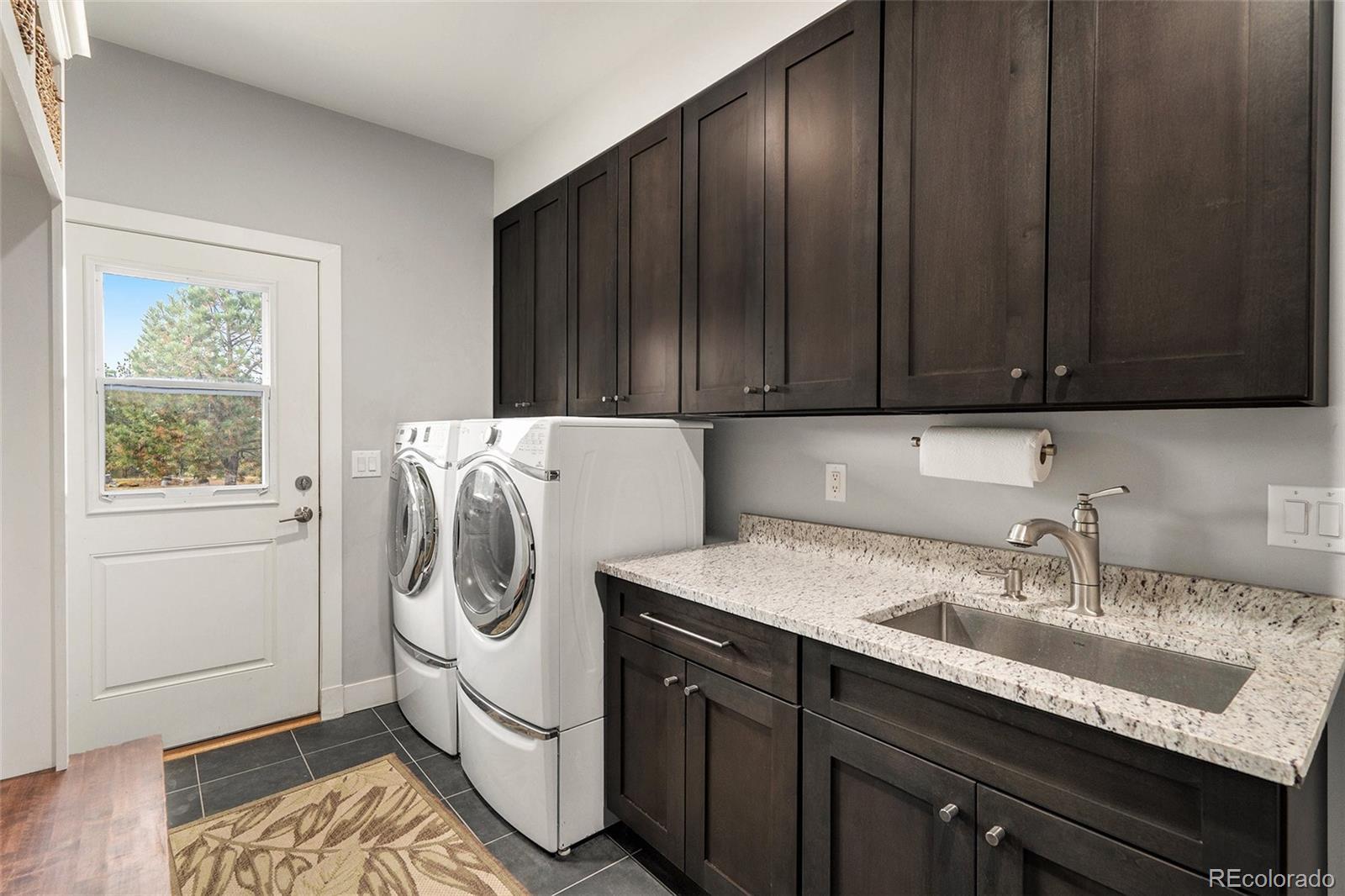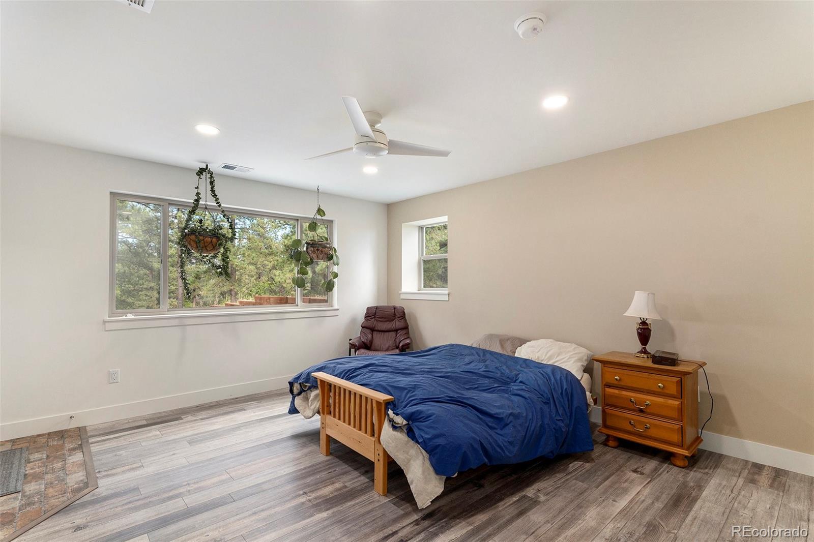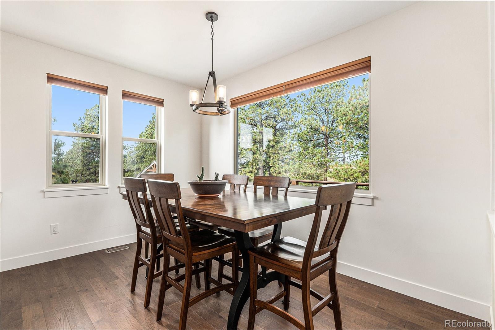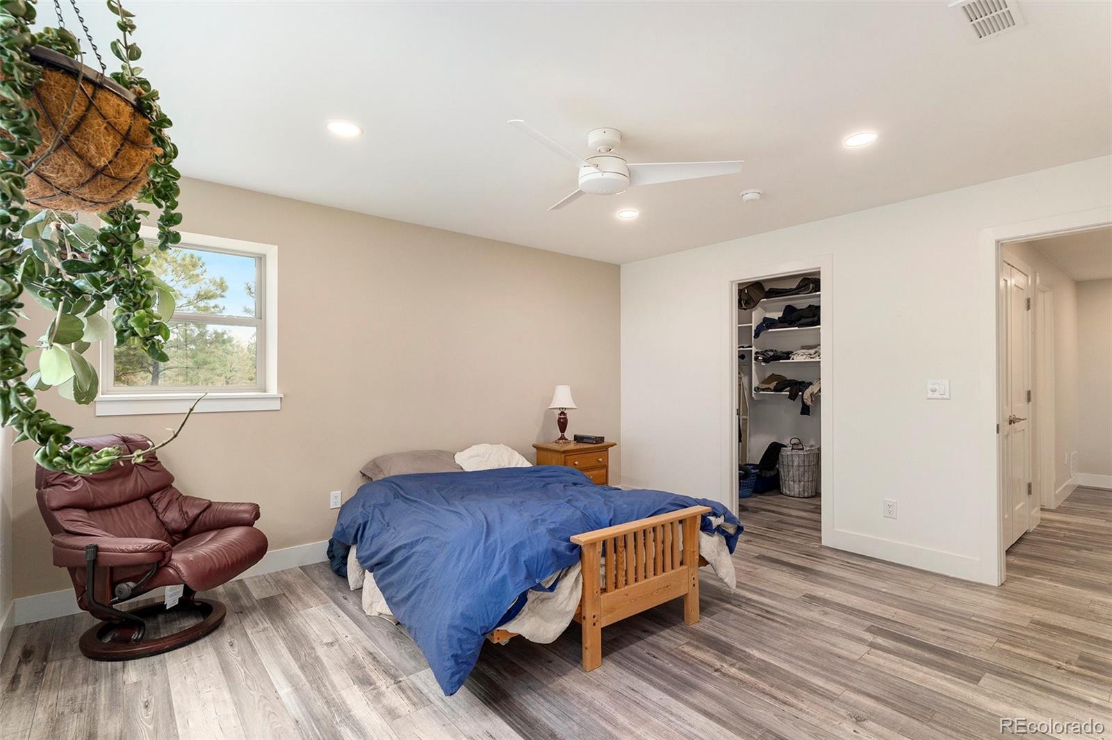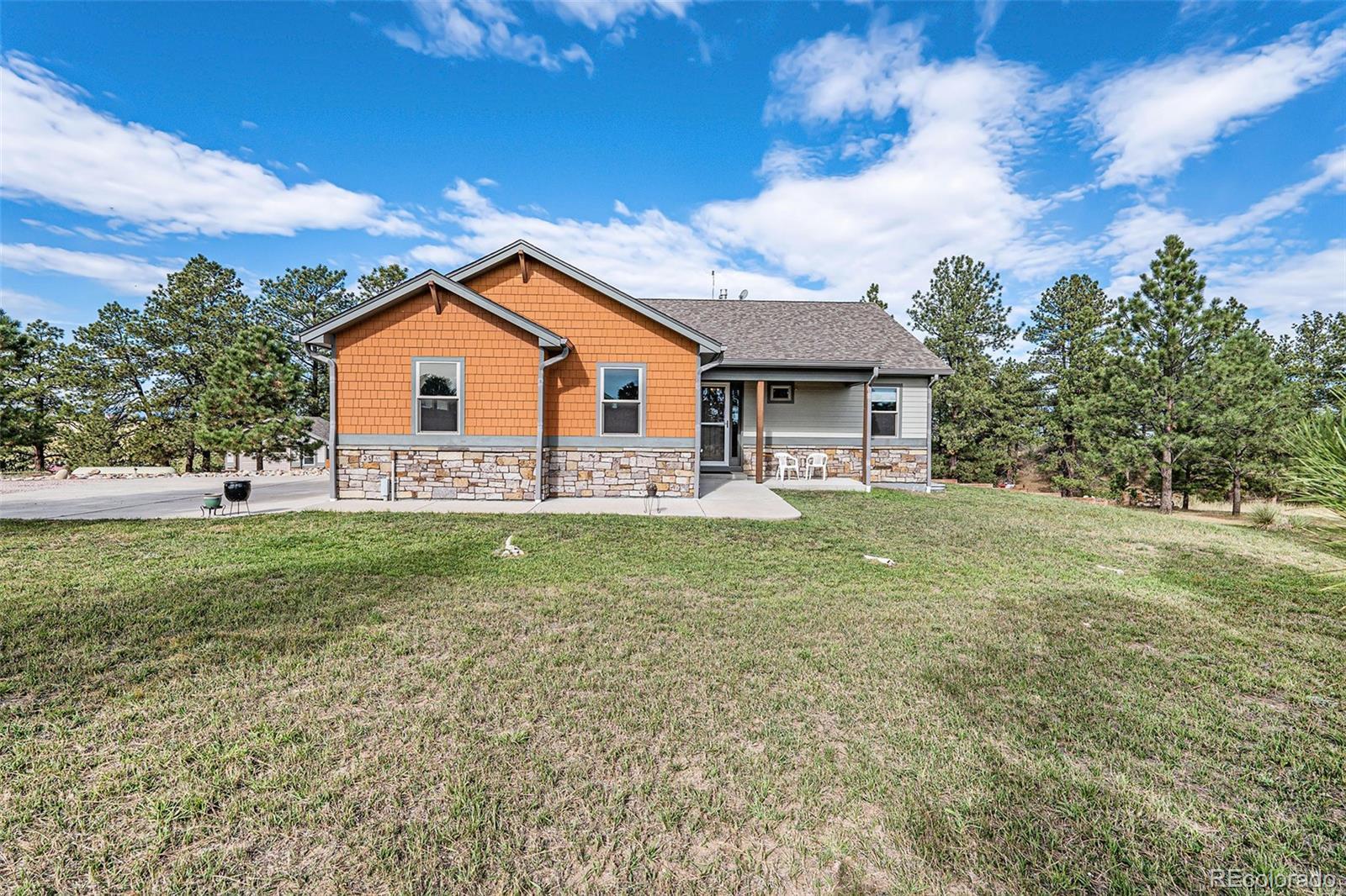 Beautiful, well built home on a diverse Colorado landscape of meadows and trees. This home is less than 10 years old, for sale by the original owner. Easy access to Town of Elizabeth amenities with country tranquility on an 8 acre lot. A beautiful, functional ranch style home incorporates multi-generational opportunities with a walkout basement. On the main level, engineered wood floors compliment the open concept lifestyle with 2 carpeted bedrooms and 2 tiled full bathrooms. The entertainment space includes a kitchen, pantry, dining room and family room. Maytag stainless steel matching appliances in the kitchen are ready for the inner chef to prepare the perfect meal. A primary suite is complete with walk in closet, access to the deck and a bathroom that includes a double vanity, curbless shower as well as a water closet with a 2nd shower & jetted tub. For a crisp morning, the bathroom has heated floors to warm your toes. Accessing the home from the attached oversized 2 car garage or from the outdoors to the mud room-laundry room provides the perfect space to kick off your coat and shoes after work or play. Added benefits in the garage include the workshop counters, cabinets and incredible storage space in the attic. The walkout basement has more superb surprises with a wet bar, large entertaining space, a door to the covered patio, another laundry room & a wine room. The generous bedroom with walk in closet has access to the covered patio as well as windows for nice natural light. A full bathroom including heated floors is also in the basement. For projects or additional space, the 16x22 workshop has a 9’ wide, 7’ tall overhead door, a standard door, heat and a fenced yard for the pup. Not enough yet? Test your green thumb in the 12x18 fenced garden area or just go enjoy the community bridle paths. New impact resistant roof completed on the house in May of 2024. Move-in ready!