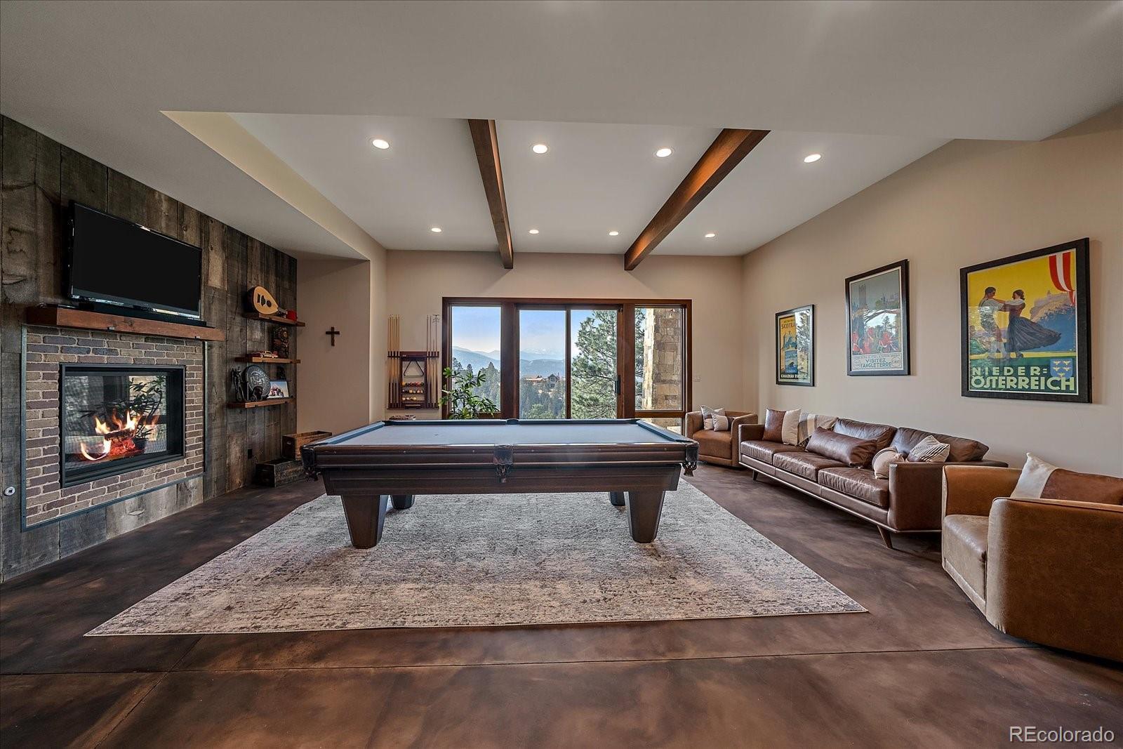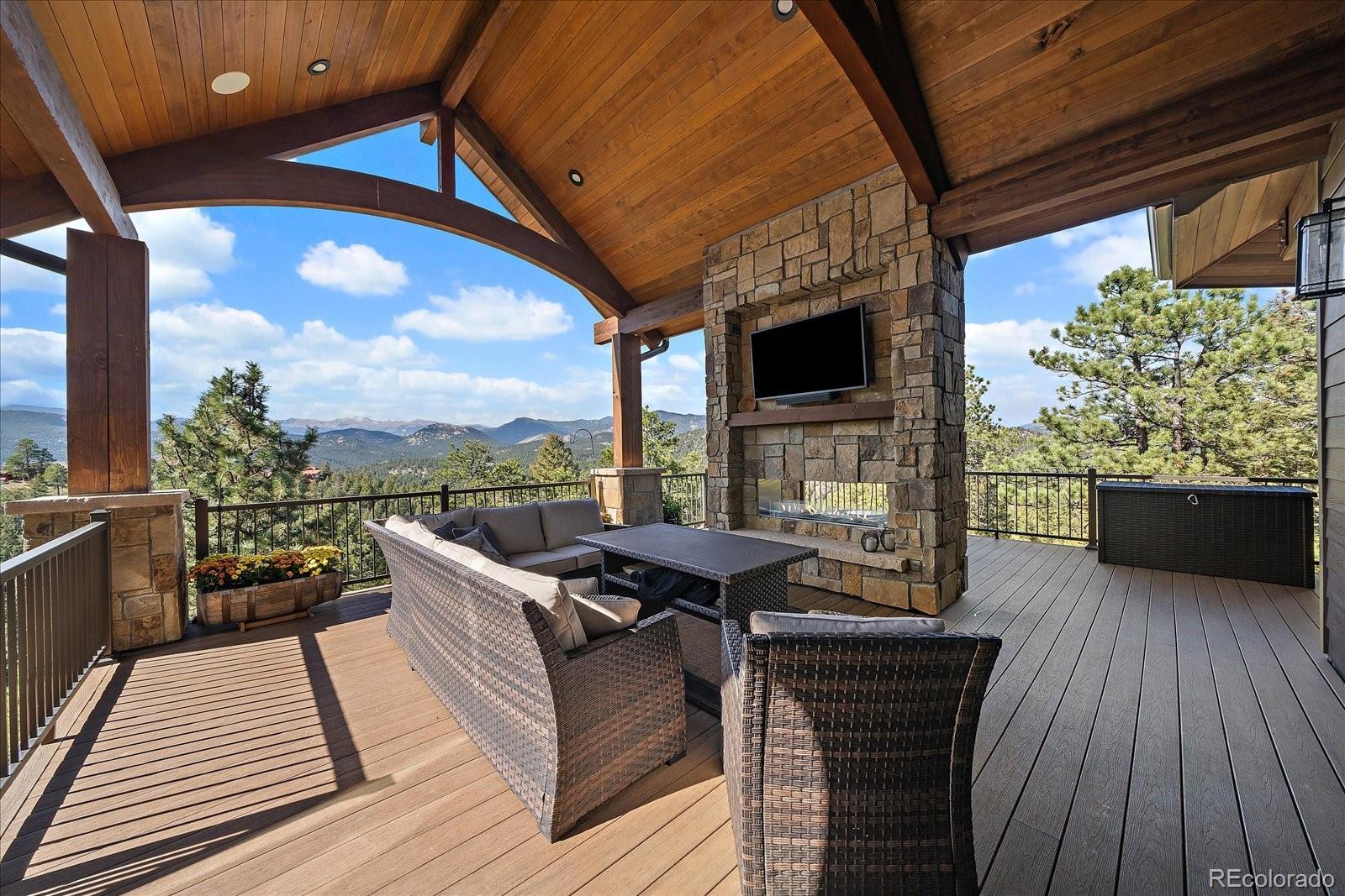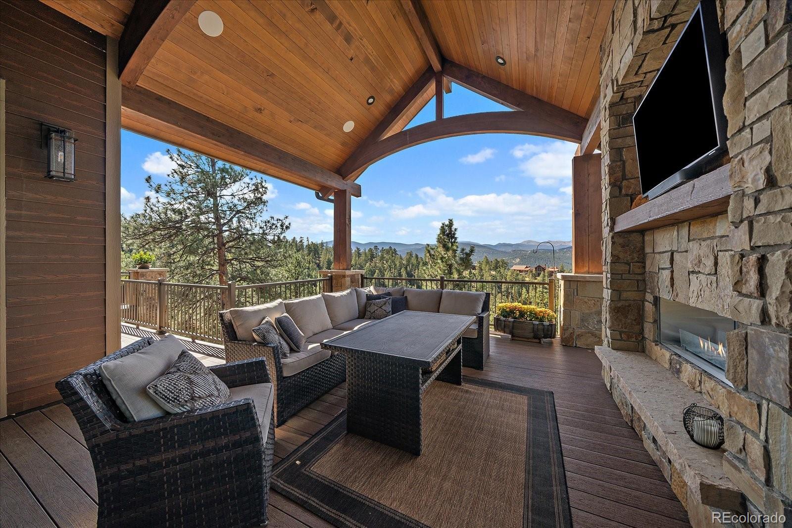 This is the ultimate estate with a blend of convenience, privacy & perhaps the best snow-capped views in Evergreen. This custom home offers luxurious, yet comfortable, mountain living with stunning architectural touches. There is a harmonious blend of rustic and modern finishes. As you enter the foyer, Mt. Blue Sky is optimally framed in the windows beyond. The great room offers a large entertaining area with a warm wood-paneled ceiling & over-sized fireplace. This area flows seamlessly into the dining area that has been designed for gatherings large or small & open to the gourmet kitchen w/ the epicurean in mind. From the gas range to enormous pantry and island, you will love cooking & engaging with family. Thoughtfully constructed with aging in place in mind, the home offers true main level living. A sumptuous primary suite captures the expansive views and a fireplace while the bath is magazine-worthy. Enjoy the huge primary closet that conveniently connects to the stunning laundry room. The main level office might be difficult to work in given the snow-capped vistas, but it is worth a try. The lower level is the ideal space for entertainment. A game room/family room welcomes you where the pub-like bar will become the hub of the space-offering a warm brick surround. A media room makes the perfect space for movie watching & there are two generously-sized bedrooms (one has its own en-suite bath). A home gym means less trips leaving your private oasis. A huge bonus is the 1561 sqft unfinished space w/separate garage door. This is a blank slate for your storage, living expansion, hobbies. The attached 4 car garage is heated, offers a shower & entrance into a mud room that was designed with 4-legged friends in mind. As astonishing as the interior is, the exterior is awesome w/ upper level deck offering an outdoor living room w/ gas fireplace, TV space and multiple seating areas. The lower patio has a private hot tub. Enjoy a real yard, & gentle driveway.