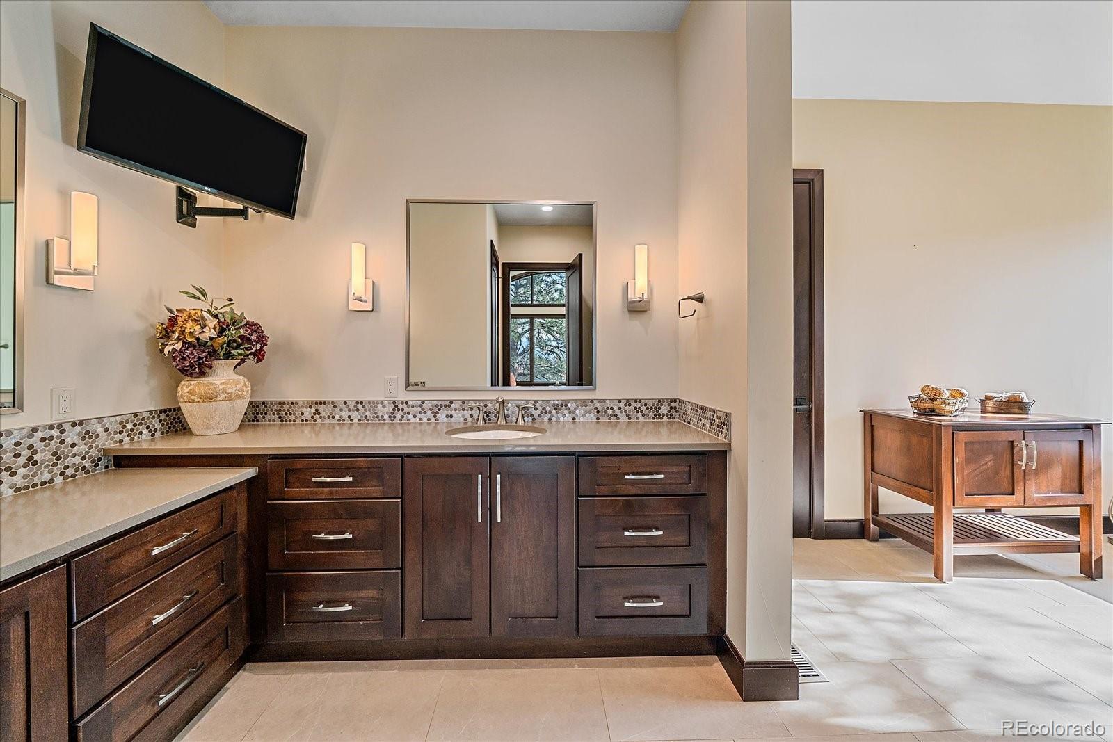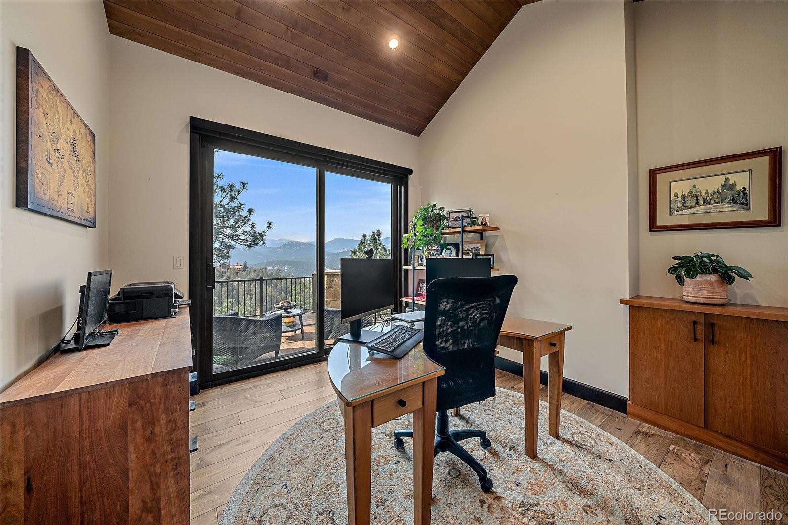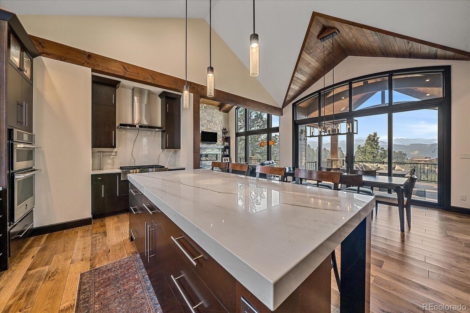 This is the ultimate estate with a blend of convenience, privacy & perhaps the best snow-capped views in Evergreen. This custom home offers luxurious, yet comfortable, mountain living with stunning architectural touches. There is a harmonious blend of rustic and modern finishes. As you enter the foyer, Mt. Blue Sky is optimally framed in the windows beyond. The great room offers a large entertaining area with a warm wood-paneled ceiling & over-sized fireplace. This area flows seamlessly into the dining area that has been designed for gatherings large or small & open to the gourmet kitchen w/ the epicurean in mind. From the gas range to enormous pantry and island, you will love cooking & engaging with family. Thoughtfully constructed with aging in place in mind, the home offers true main level living. A sumptuous primary suite captures the expansive views and a fireplace while the bath is magazine-worthy. Enjoy the huge primary closet that conveniently connects to the stunning laundry room. The main level office might be difficult to work in given the snow-capped vistas, but it is worth a try. The lower level is the ideal space for entertainment. A game room/family room welcomes you where the pub-like bar will become the hub of the space-offering a warm brick surround. A media room makes the perfect space for movie watching & there are two generously-sized bedrooms (one has its own en-suite bath). A home gym means less trips leaving your private oasis. A huge bonus is the 1561 sqft unfinished space w/separate garage door. This is a blank slate for your storage, living expansion, hobbies. The attached 4 car garage is heated, offers a shower & entrance into a mud room that was designed with 4-legged friends in mind. As astonishing as the interior is, the exterior is awesome w/ upper level deck offering an outdoor living room w/ gas fireplace, TV space and multiple seating areas. The lower patio has a private hot tub. Enjoy a real yard, & gentle driveway.