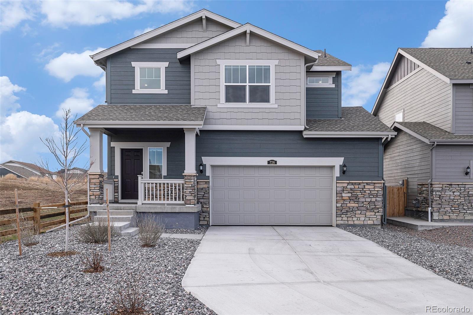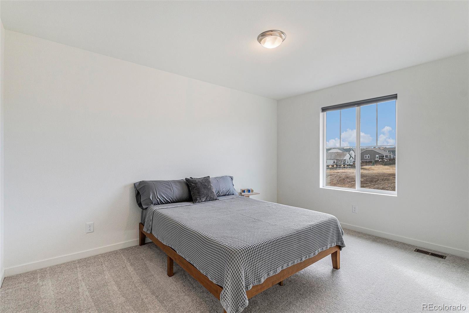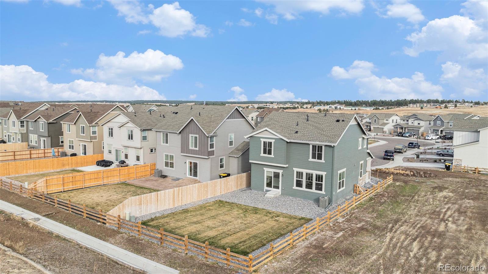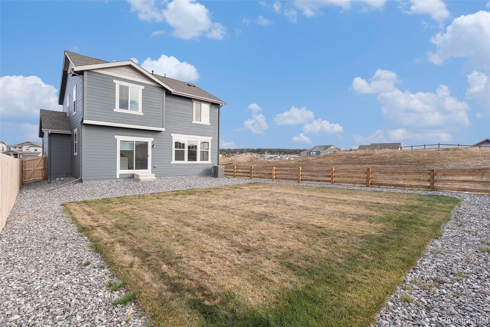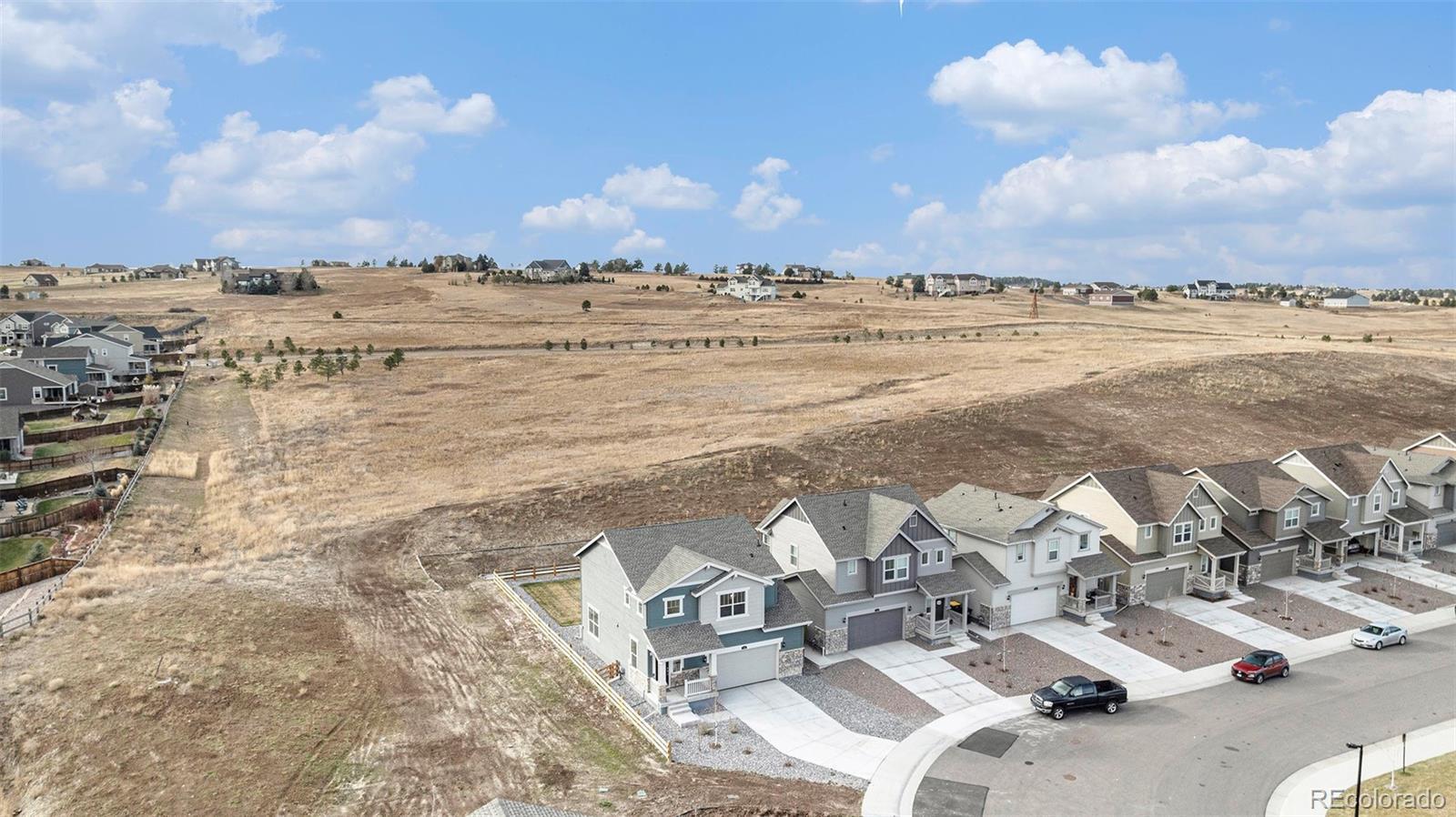 Less than two years old and set on a premium corner lot that backs to open space, this two-story delivers privacy, light, and a clean modern feel from day one. With open space on three sides and only one neighbor, the main level lives wide open—9' ceilings, an airy great room, and sightlines to sunset views. The kitchen keeps the look streamlined with quartz countertops, designer cabinetry, a large island, stainless appliances, a stainless undermount sink, built-in trash pullouts, and generous storage. LEVOLOR light-filtering shades on the main level add comfort without sacrificing natural light. Upstairs, the owner’s suite is thoughtfully sized with dual sinks and a walk-in closet; blackout cellular shades in all bedrooms (and the suite’s bath) support restful nights. Practical upgrades are already in place: ceiling-fan pre-wire in every bedroom and the Great Room, a Samsung Bespoke washer and dryer, and an extra ¼-stall in the garage for gear or a small workspace. Outside, you’ll appreciate front and back yard irrigation, an automatic garage door opener, and durable 30-year architectural shingles. The home’s energy-efficient design—optimized insulation, windows, lighting, water heater, furnace, A/C, and an Amazon smart thermostat—helps keep utility costs in check. Across the street, an open grass area invites play, and a nearby trail leads to a community pond and playground. Everyday needs are about five minutes away, with downtown Elizabeth close by and Castle Rock and Parker roughly 25 minutes from your door.