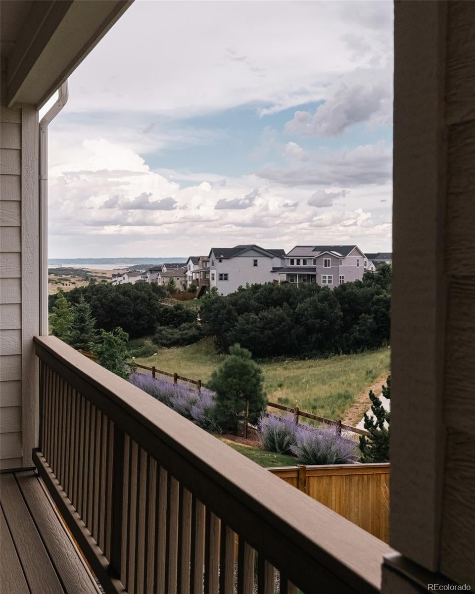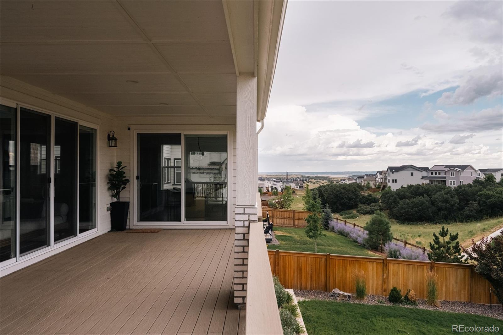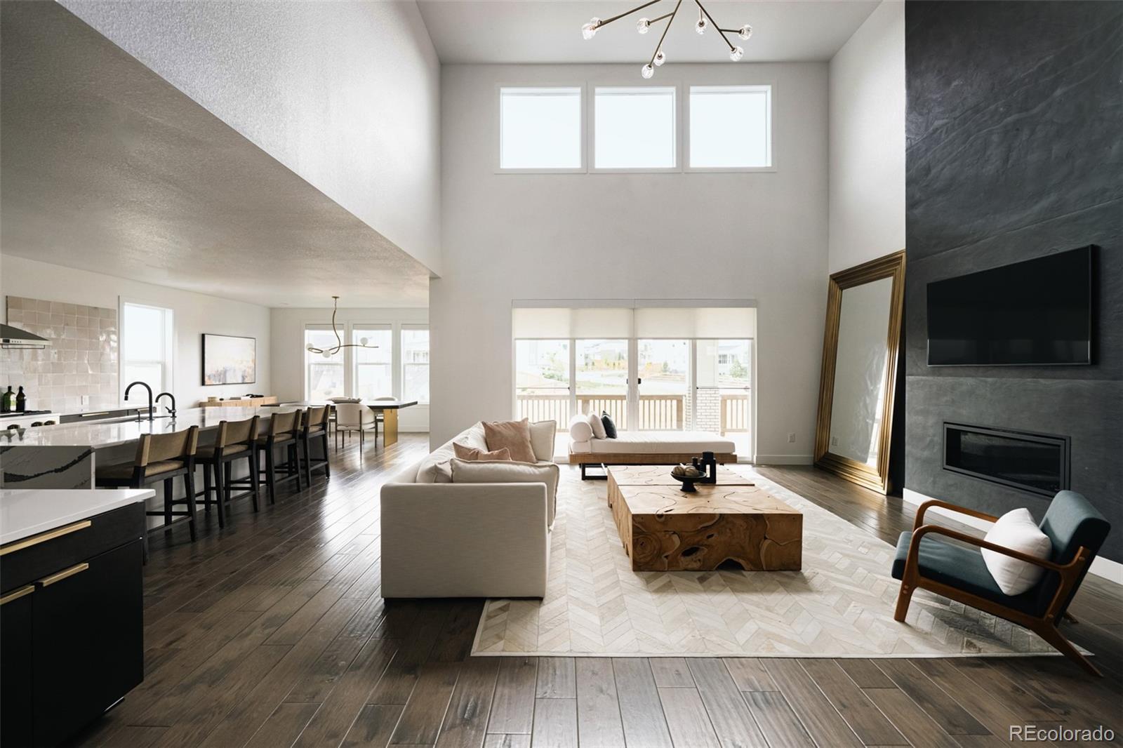A Refined, Design-Forward Home in Timberline, Castle Pines Professionally designed by its original owner, a seasoned interior designer, this home stands apart for its elevated material palette, layered lighting, and cohesive detailing rarely found elsewhere in the community. Every decision—from finishes to fixtures—reflects a careful balance of function and visual harmony. Soaring ceilings and tall windows bring natural light into the heart of the home, centered around a linear fireplace wrapped in Porcelanosa Air Slate stone. The kitchen is equally considered, with a waterfall-edge Cambria quartz island, stainless appliances, and a walk-in pantry that connects to a discreet back kitchen. The main level also features a glass-enclosed office, a flexible library or dining room, and a three-car garage with an epoxy-sealed floor. Outdoors, a covered deck looks onto a softly landscaped backyard that is fenced, irrigated, and designed for low-maintenance living. Upstairs, the primary suite includes a custom walk-in closet and a spa-inspired bath. Additional bedrooms, a versatile loft, and a dedicated laundry room create comfort and flexibility. The lower level offers generous space for media, fitness, and guests, with walk-out access to a second covered patio. Notable upgrades include engineered hickory floors, Lutron automated blinds, wool carpeting, statement lighting, a tankless water heater, and dual HVAC systems installed in 2021. A whole-house humidifier ensures comfort year-round. This is a home where every detail has been considered. Modern and warm, tailored yet livable, it offers a rare sense of balance and intention.