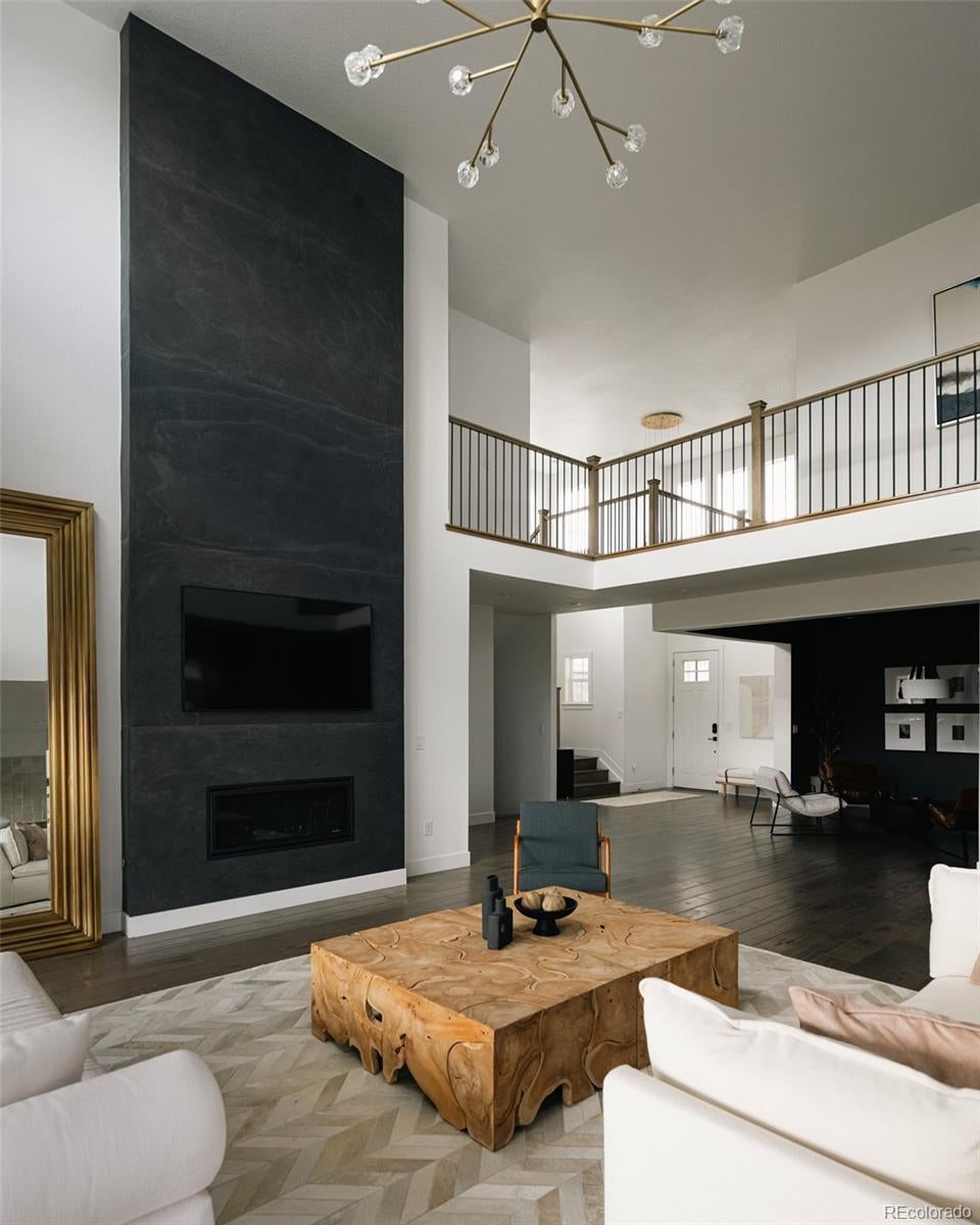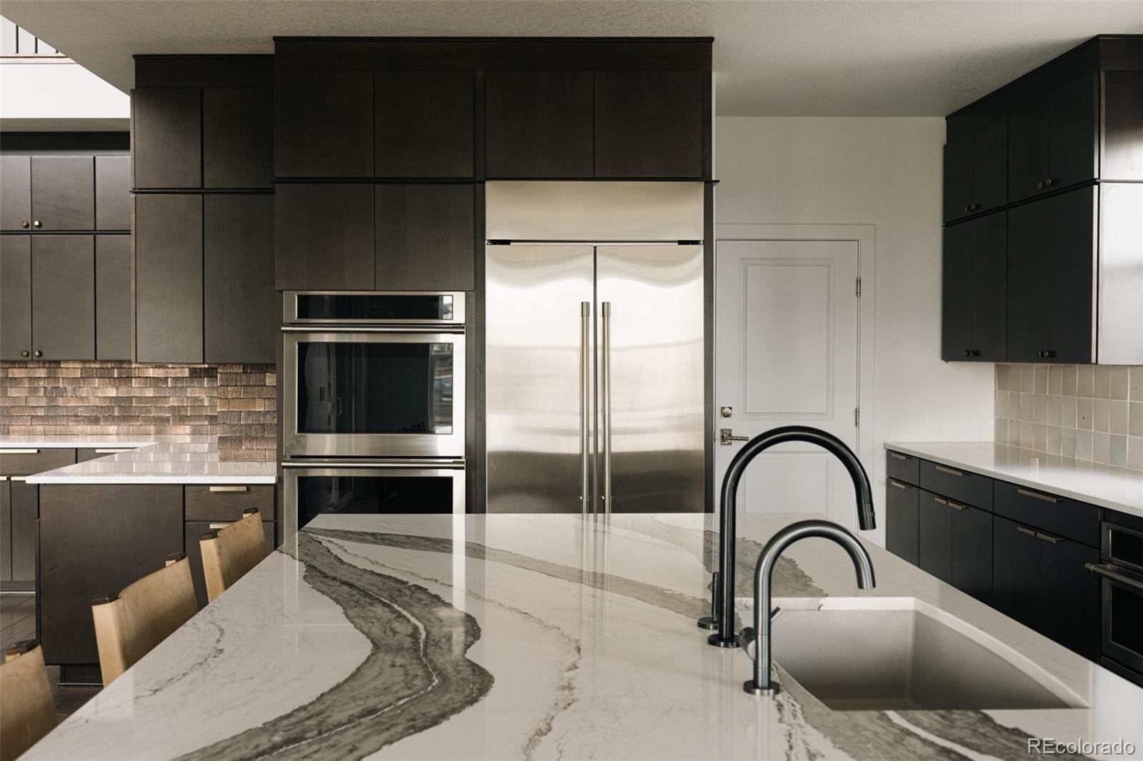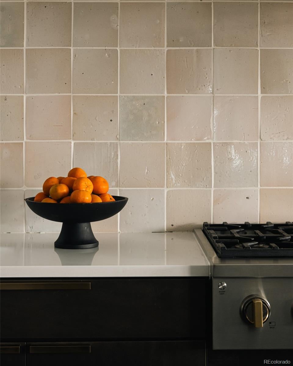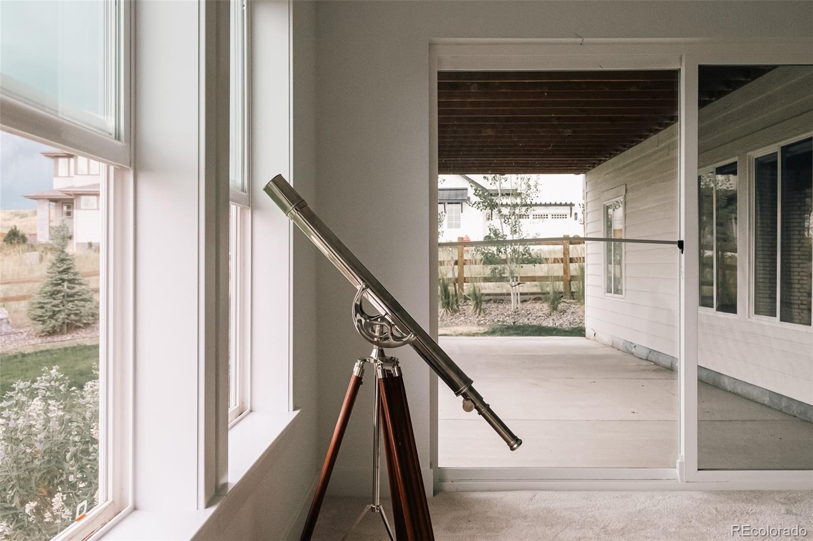 A Refined, Design-Forward Home in Timberline, Castle Pines Professionally designed by its original owner, a seasoned interior designer, this home stands apart for its elevated material palette, layered lighting, and cohesive detailing rarely found elsewhere in the community. Every decision—from finishes to fixtures—reflects a careful balance of function and visual harmony. Soaring ceilings and tall windows bring natural light into the heart of the home, centered around a linear fireplace wrapped in Porcelanosa Air Slate stone. The kitchen is equally considered, with a waterfall-edge Cambria quartz island, stainless appliances, and a walk-in pantry that connects to a discreet back kitchen. The main level also features a glass-enclosed office, a flexible library or dining room, and a three-car garage with an epoxy-sealed floor. Outdoors, a covered deck looks onto a softly landscaped backyard that is fenced, irrigated, and designed for low-maintenance living. Upstairs, the primary suite includes a custom walk-in closet and a spa-inspired bath. Additional bedrooms, a versatile loft, and a dedicated laundry room create comfort and flexibility. The lower level offers generous space for media, fitness, and guests, with walk-out access to a second covered patio. Notable upgrades include engineered hickory floors, Lutron automated blinds, wool carpeting, statement lighting, a tankless water heater, and dual HVAC systems installed in 2021. A whole-house humidifier ensures comfort year-round. This is a home where every detail has been considered. Modern and warm, tailored yet livable, it offers a rare sense of balance and intention.