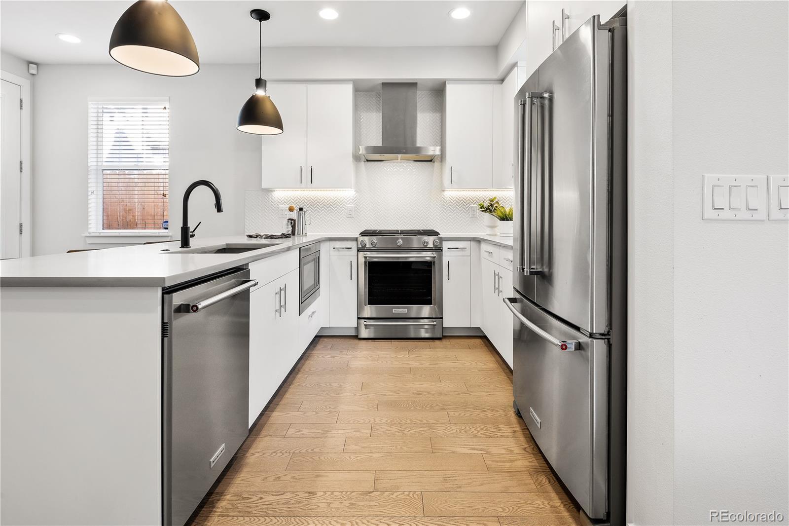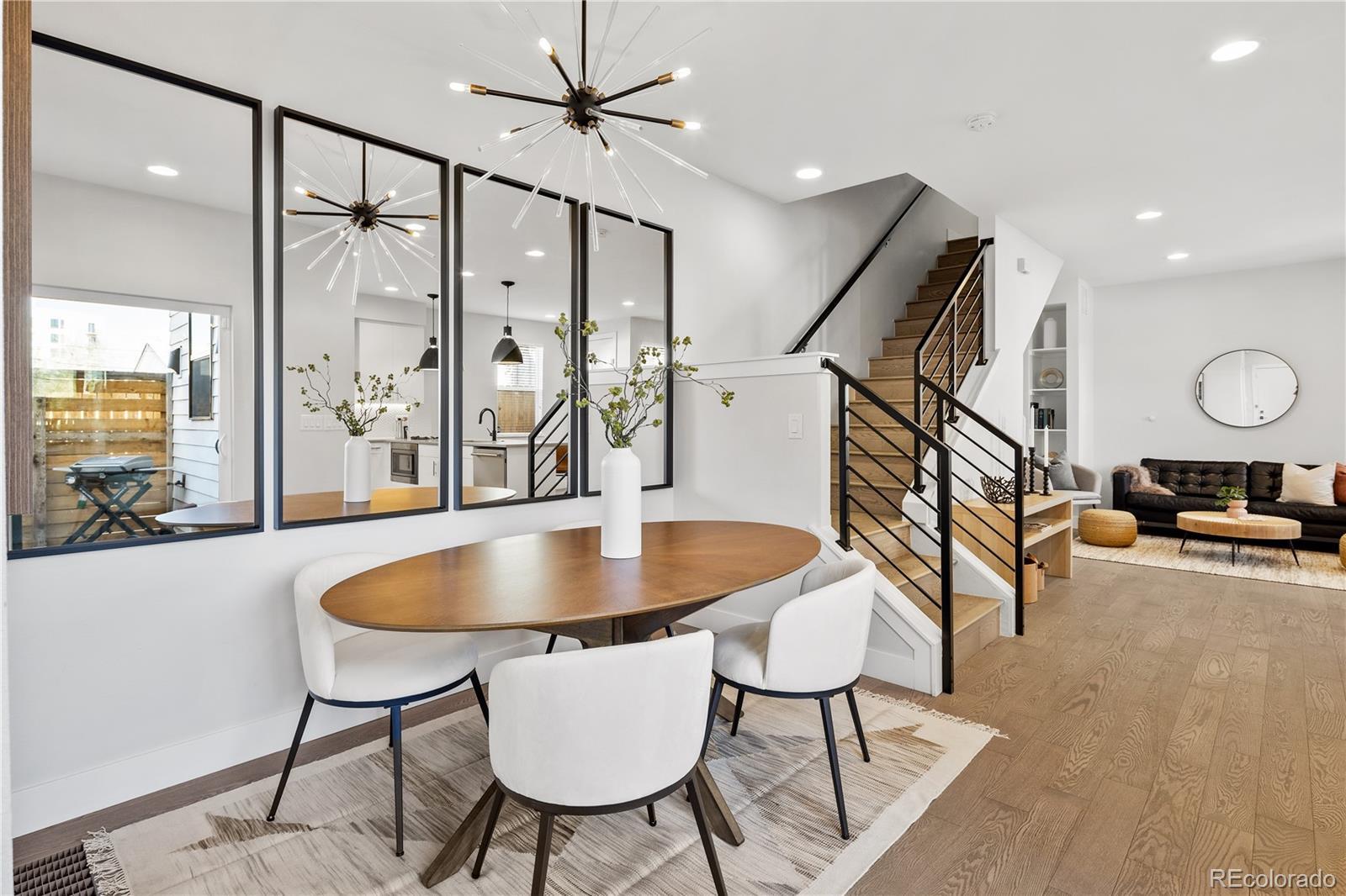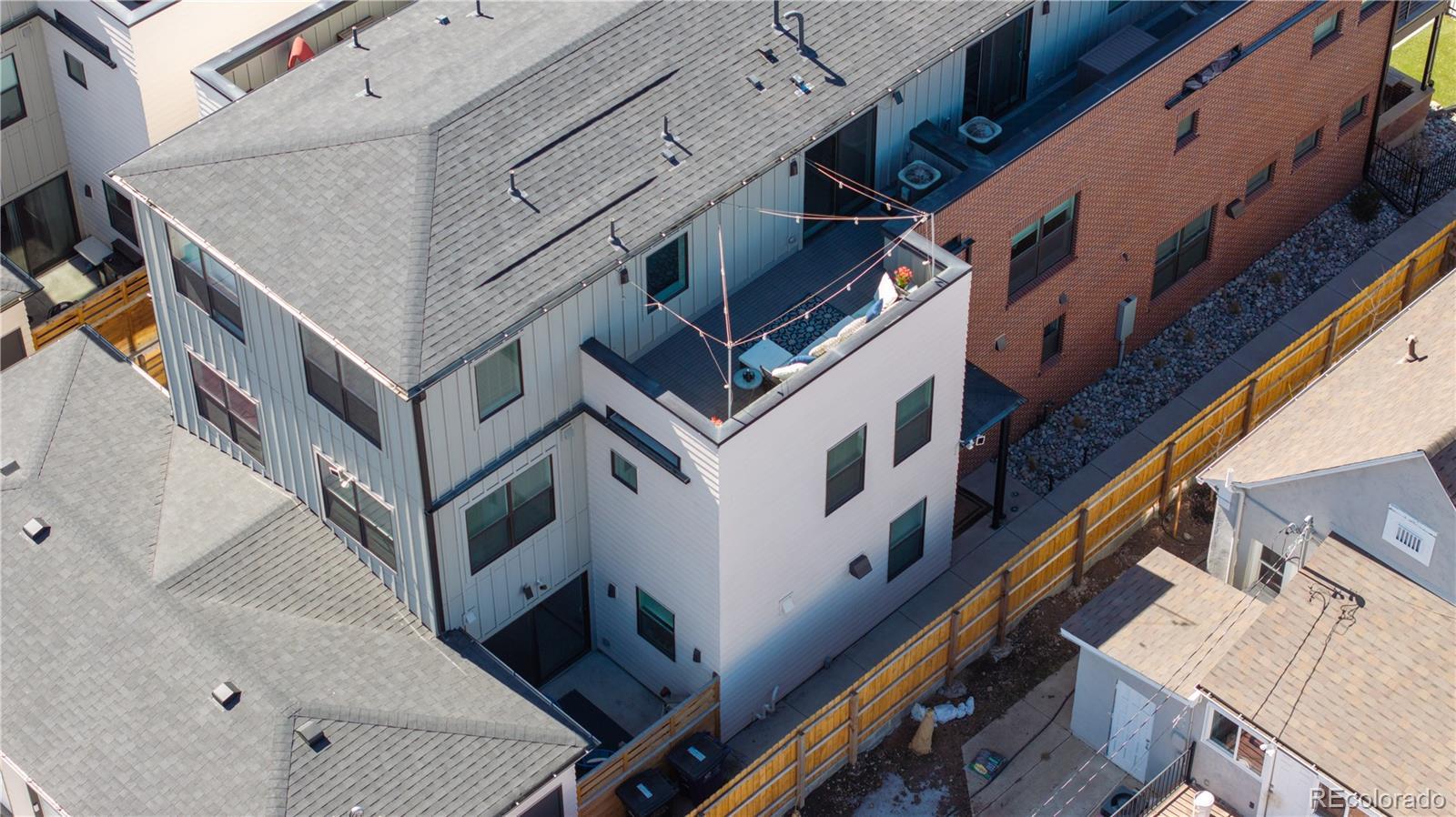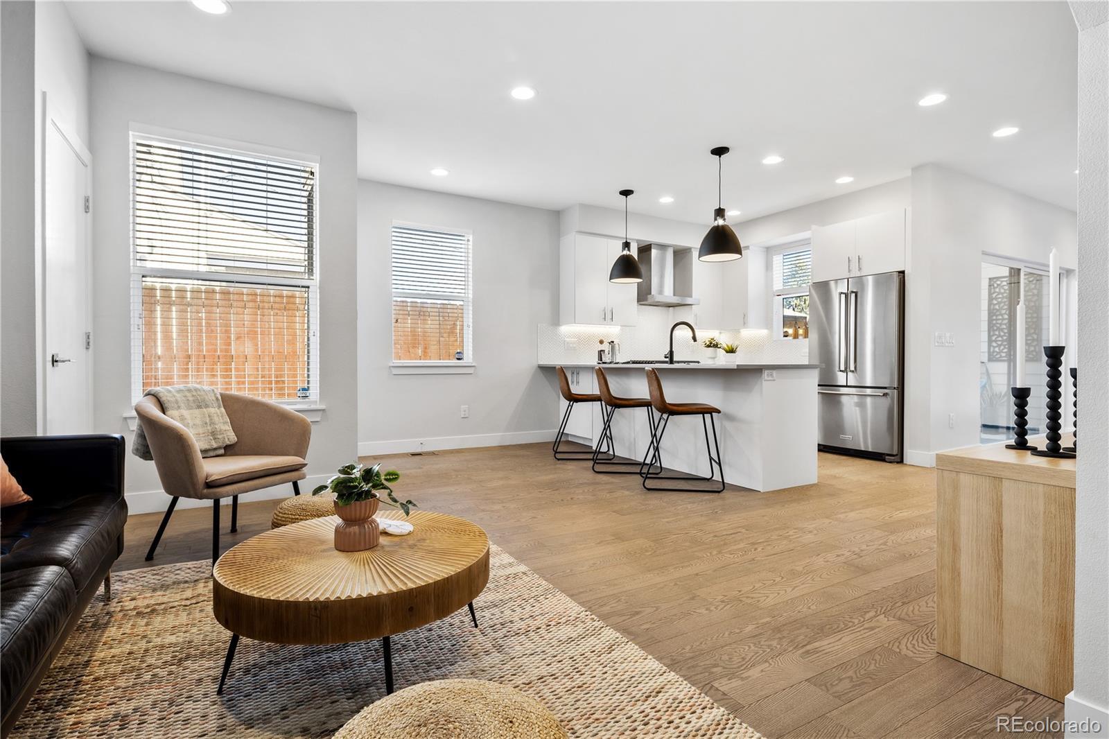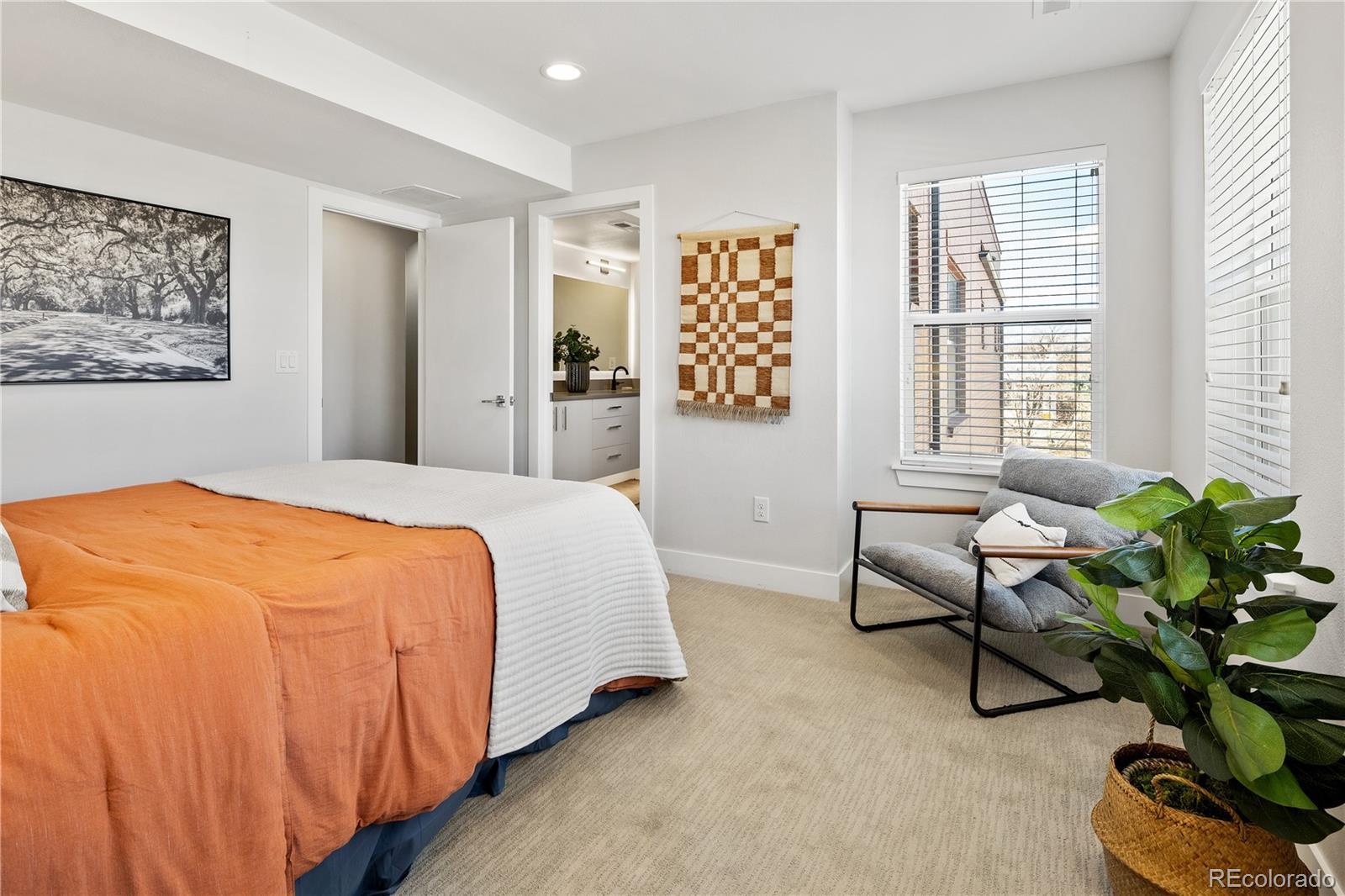 Modern brick townhome, with lovely top level deck, attached garage and mountain views. Located just minutes from downtown Denver, Sloan's Lake, West Highland and Lower Highland (LoHi). Rare top floor finished square footage opens to a rooftop deck adorned with charming tea lights. Sleek eat-in kitchen equipped with Kitchen Aid architect series appliances, abundant quartz counter space and soft-close cabinetry. Designer lighting illuminates the dining area, which effortlessly flows into the private fenced courtyard. Your summer of alfresco dining & entertaining awaits. The primary suite boasts a walk-in closet and spa-like bath, complete with ambient lighting, floating cabinets, sleek fixtures, and double sinks. A sun-filled secondary bedroom offers east-facing windows and an adjacent full bath. The airy top level is perfect for guests, with its third bedroom, full bath and versatile loft area that is perfect size for home office, complete with wet bar and wine fridge. Enjoy lovely year round mountain views and celebratory fireworks over Broncos Stadium. Only 1.5 blocks to RTD light rail and Paco Sanchez Interactive Park. The Lakewood Dry Gulch trail is a local favorite for disc golf, community gardens, playgrounds and biking. Easy access to I-70, 6th Ave/Belmar and I-25. Experience the freedom of no HOA, with both Party Wall and Exterior Maintenance agreements in place.