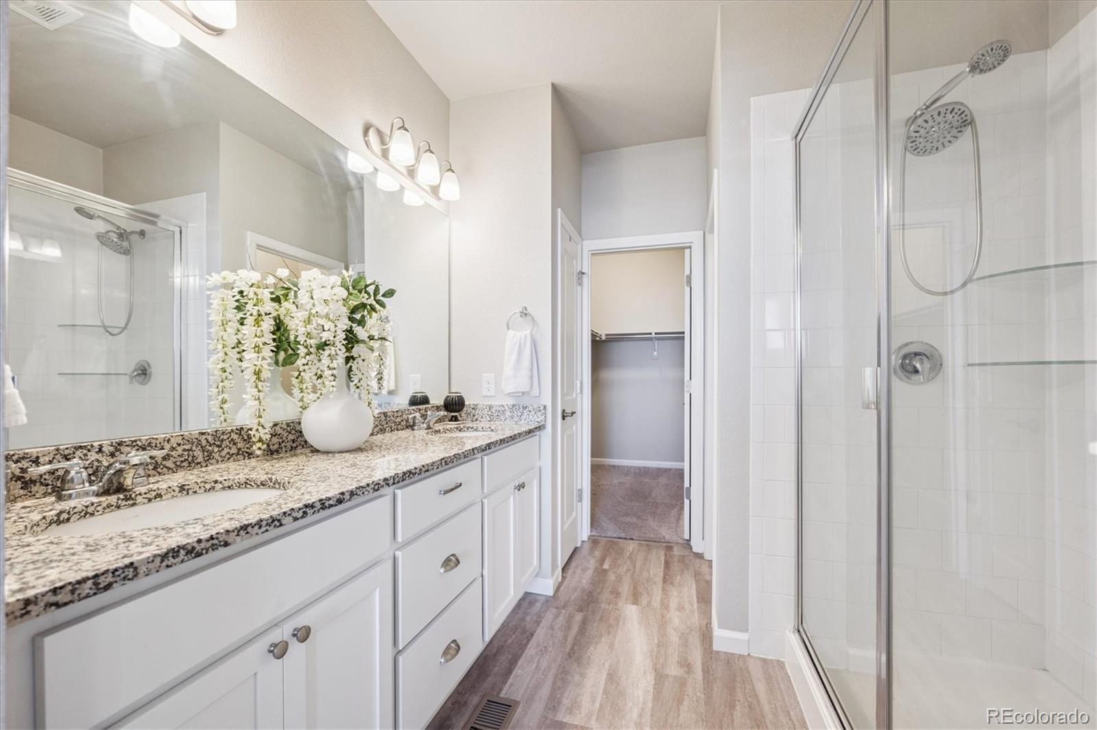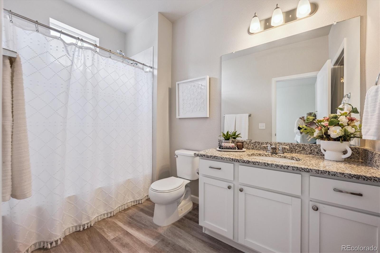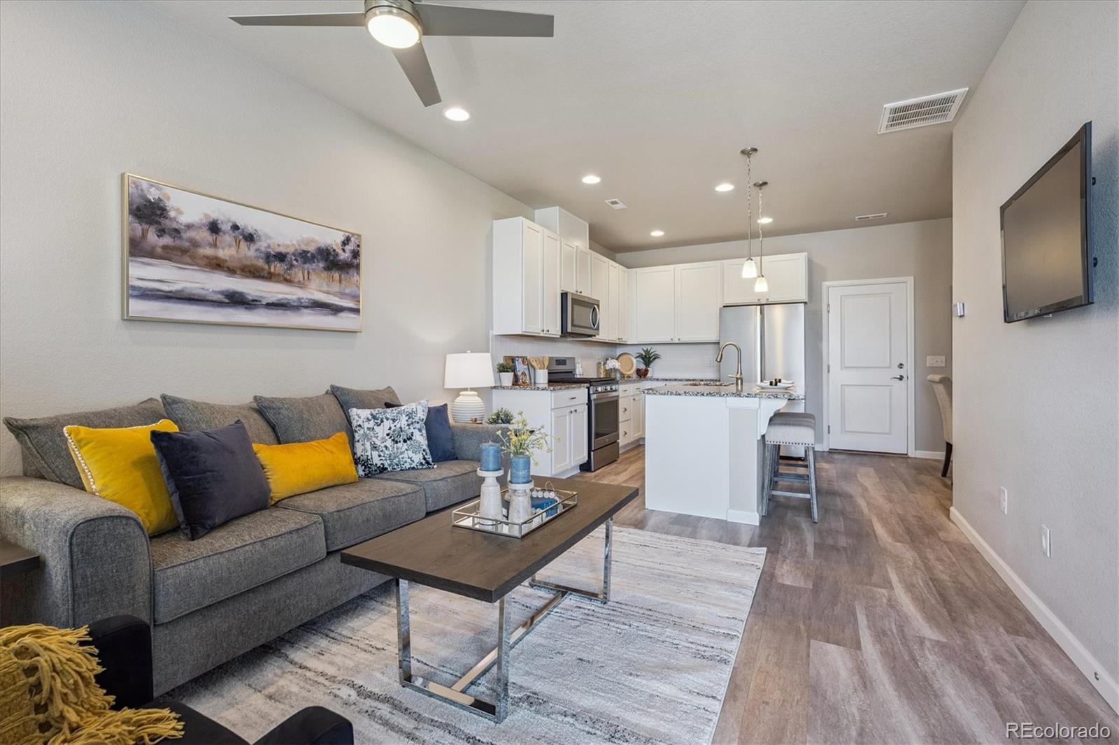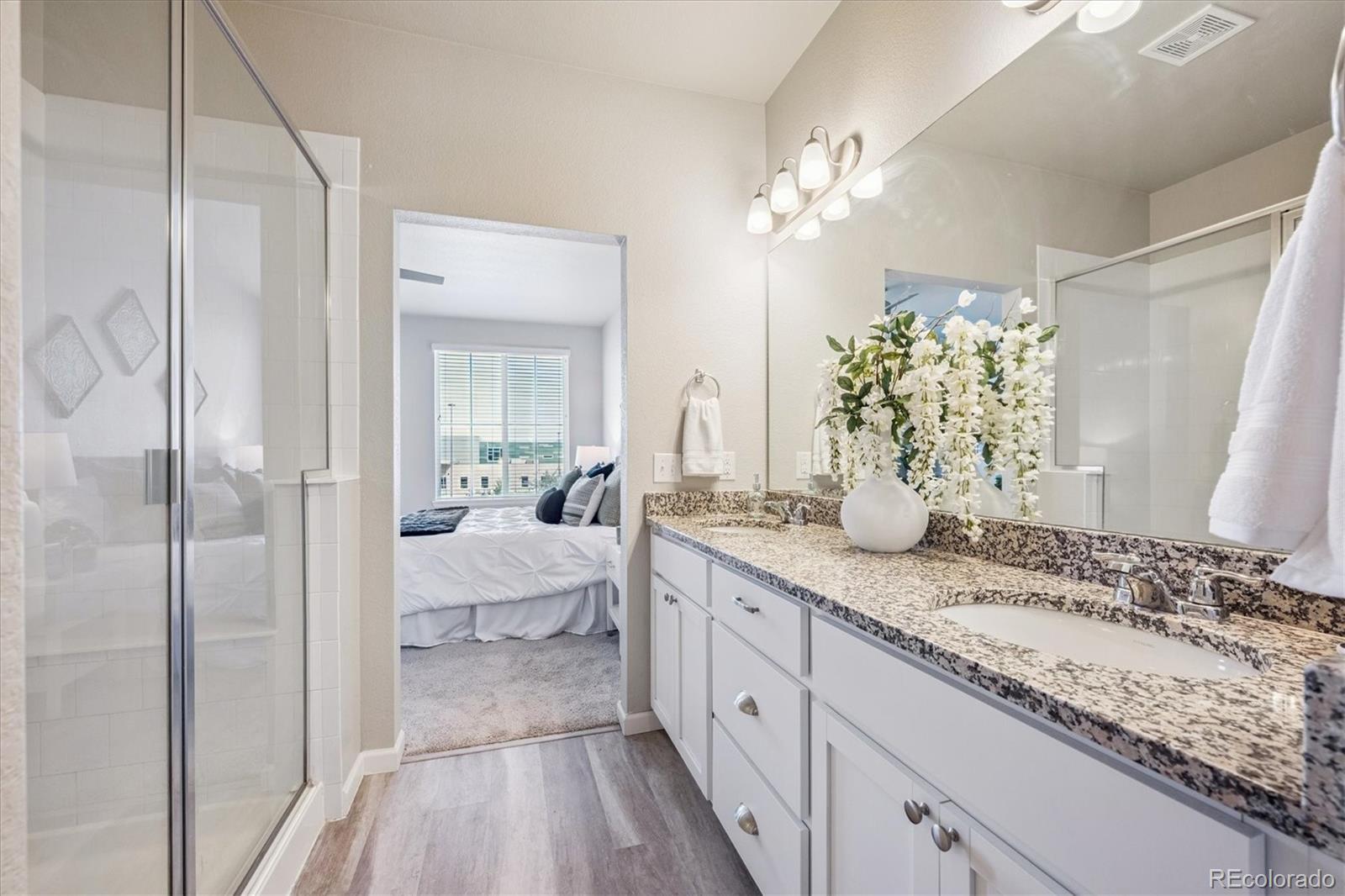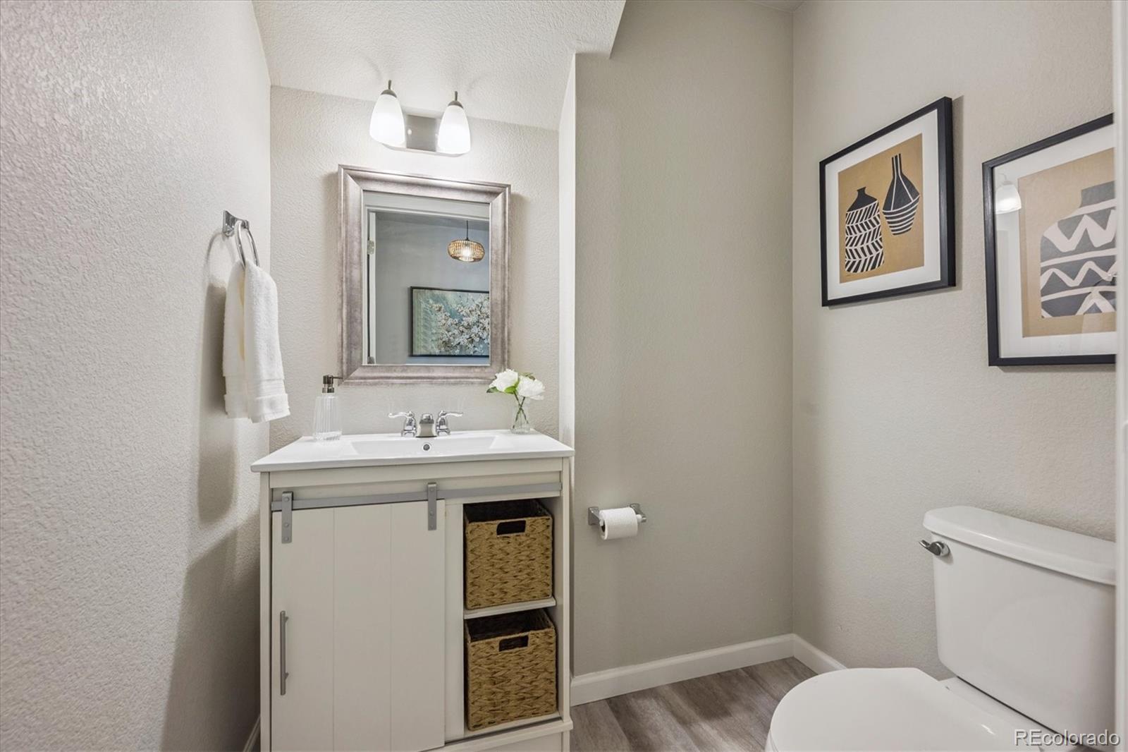 Step inside to this spacious and well-maintained open townhome with laminate flooring throughout the main level. Cozy, practical living room with large picture window. Conveniently located powder bath on main. Large kitchen features island, white cabinets with quartz counters, and stainless steel appliances flowing into the open dining area with access to the garage. Upper level offers primary bedroom with ensuite bath & spacious walk-in closet! Additional generous spare bedroom with ensuite bath and large closet! Laundry room fits side by side with built-in shelving. The two car garage offers ample storage space. Live close to excellent JeffCo schools with tons of conveniences to shops, dining, grocery, parks and trails! Don't miss this one! Call Stacey Bushaw with all showings!