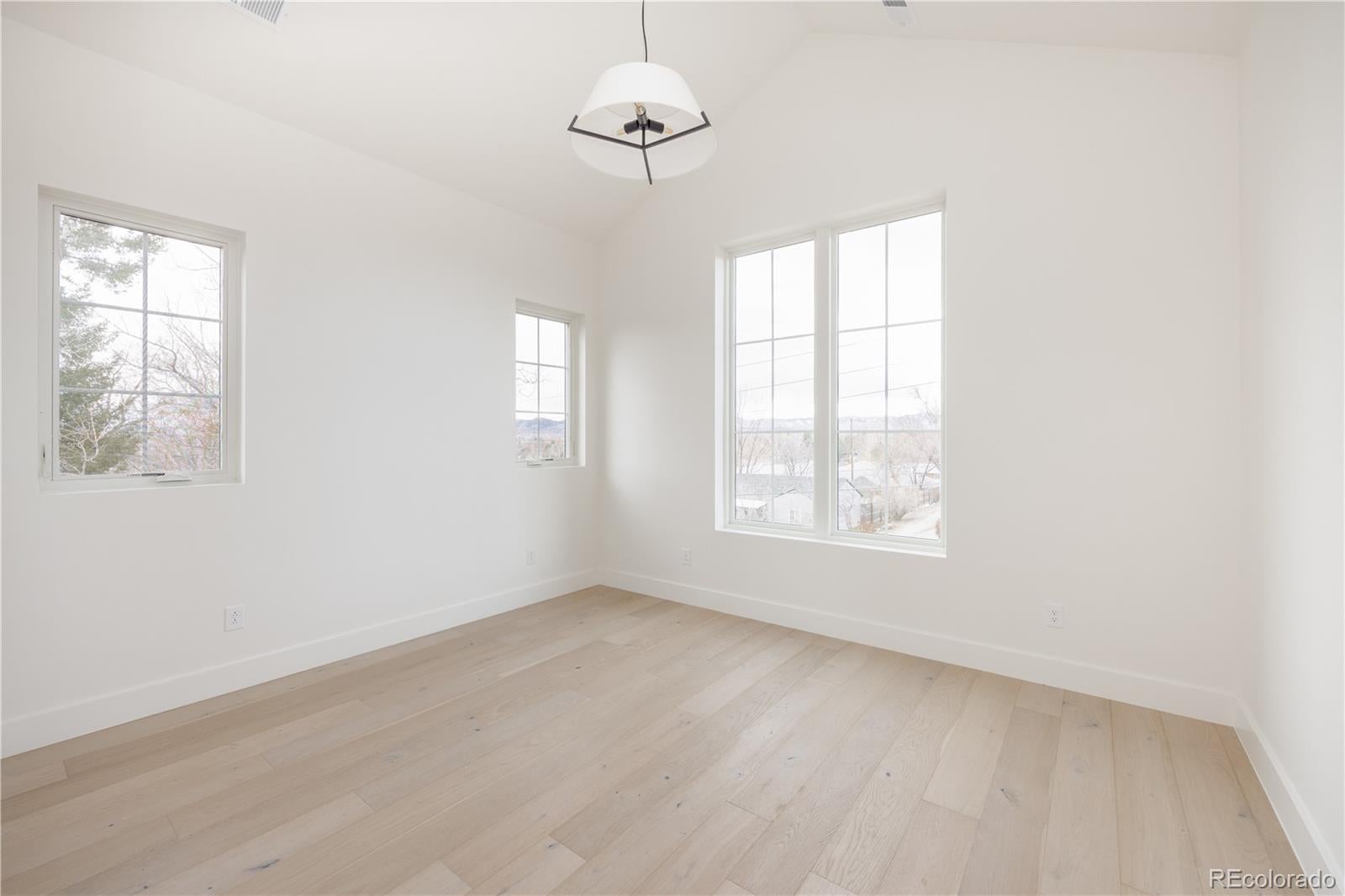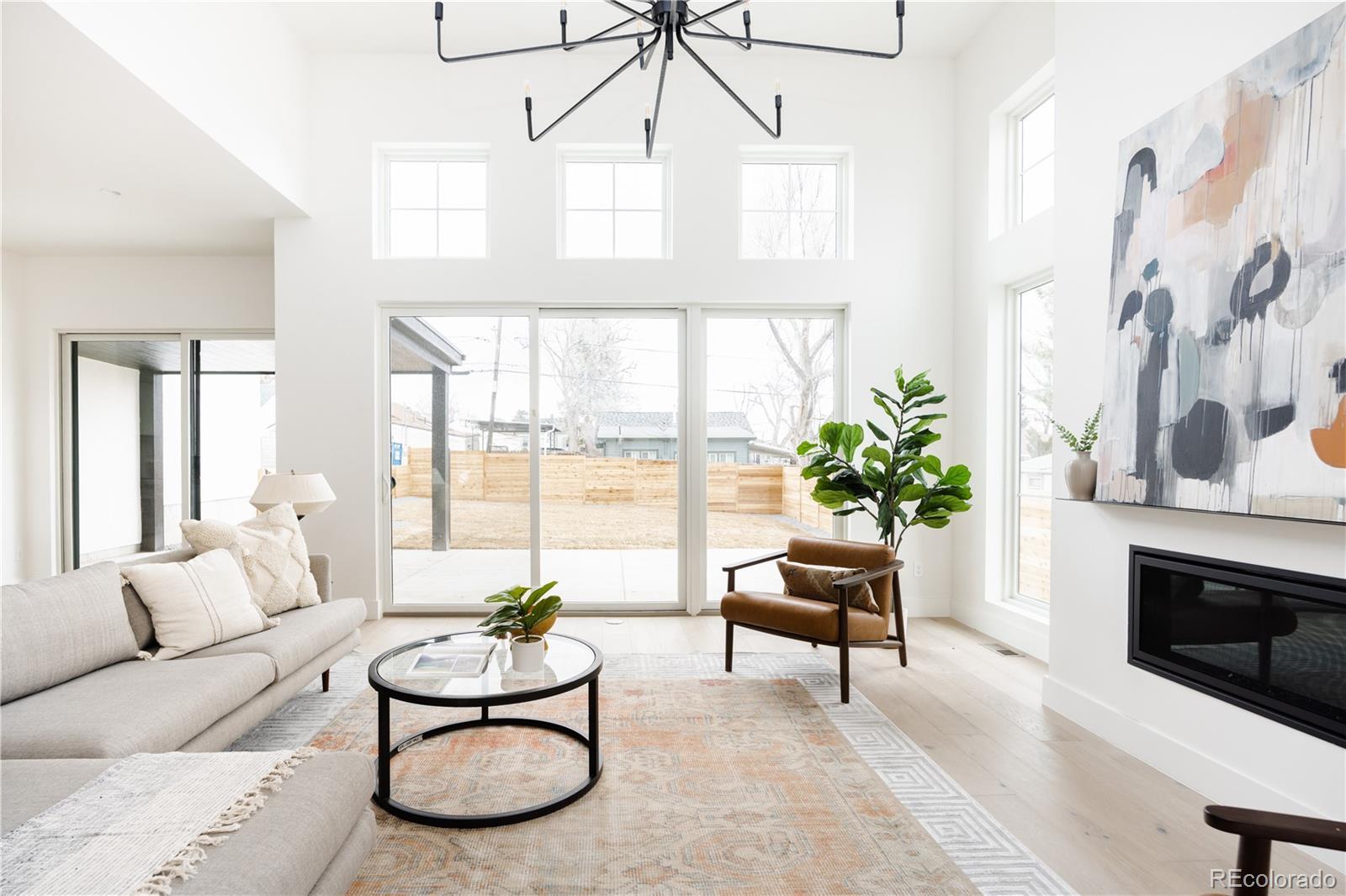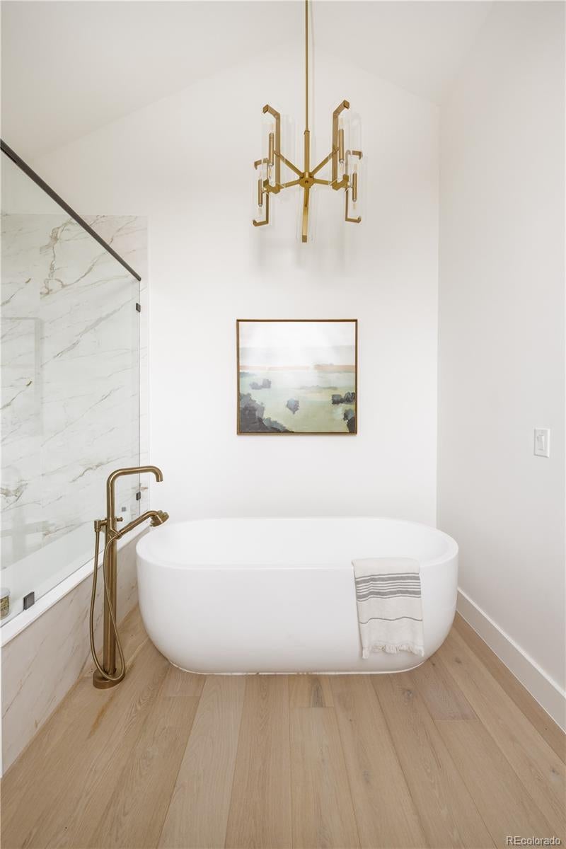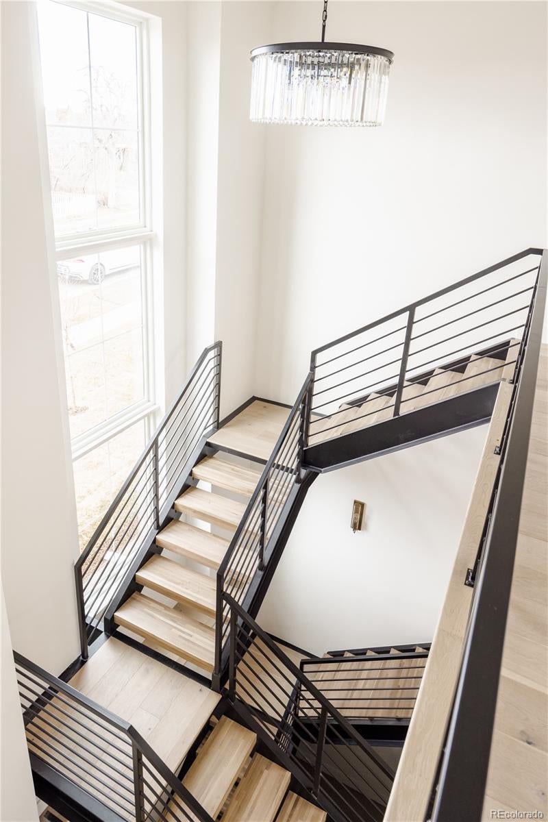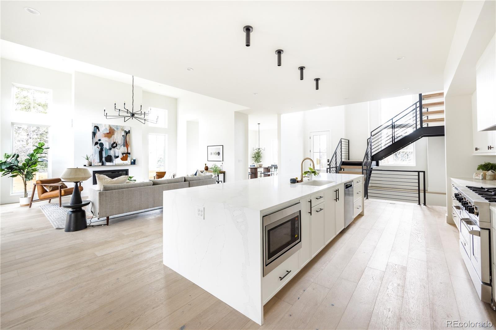 This new modern ~5000 sq. ft modern farmhouse single family with a large yard located only 10 minutes from Downtown Denver features 4 bedroom / 5 bathroom + office and separate dedicated home gym, huge mountain views, expansive floor plan with European 8" oak flooring throughout, 15' vaulted living room, central fireplace nearby the large chef kitchen with 48" professional range, 2 ovens, 12' island, large custom walk in pantry, designer light fixtures, huge master bathroom with two vanities, freestanding tub, large walk-in closet with built ins, vaulted ceilings in bedrooms. 2 Furnaces and 2 AC's for zoned control, expansive finished basement with a built in bar and huge recreational room.