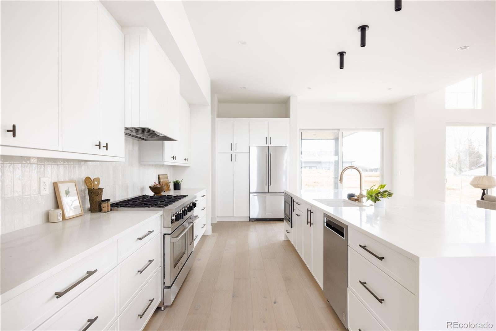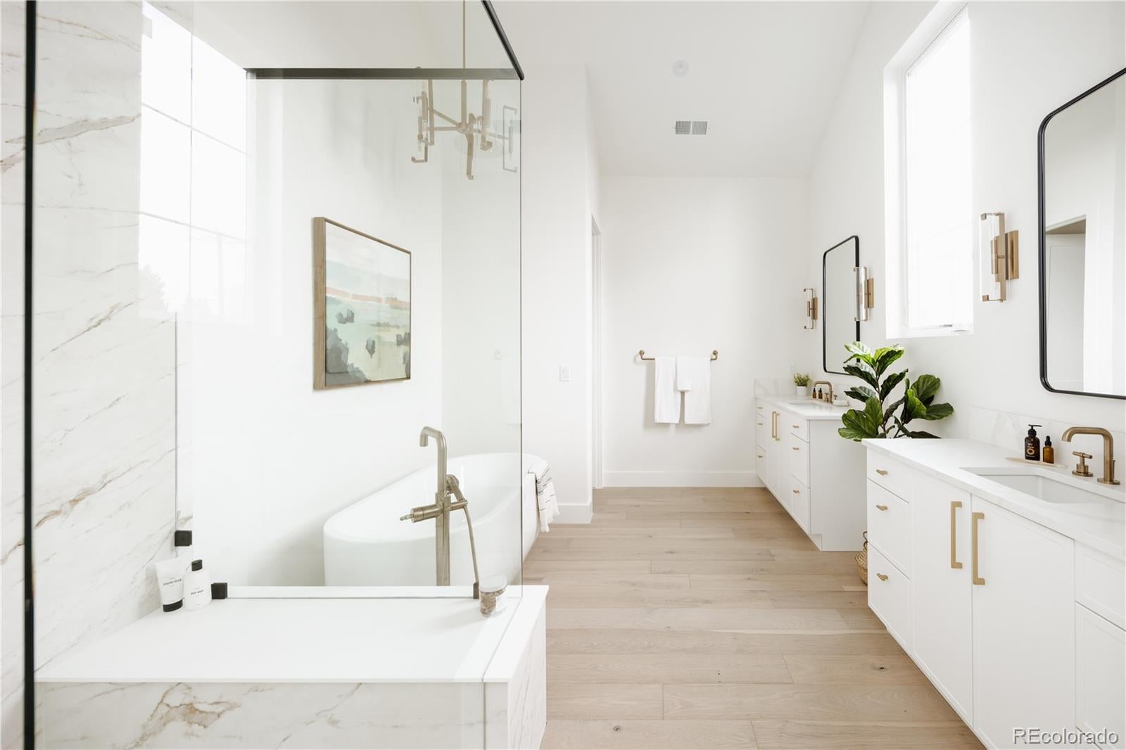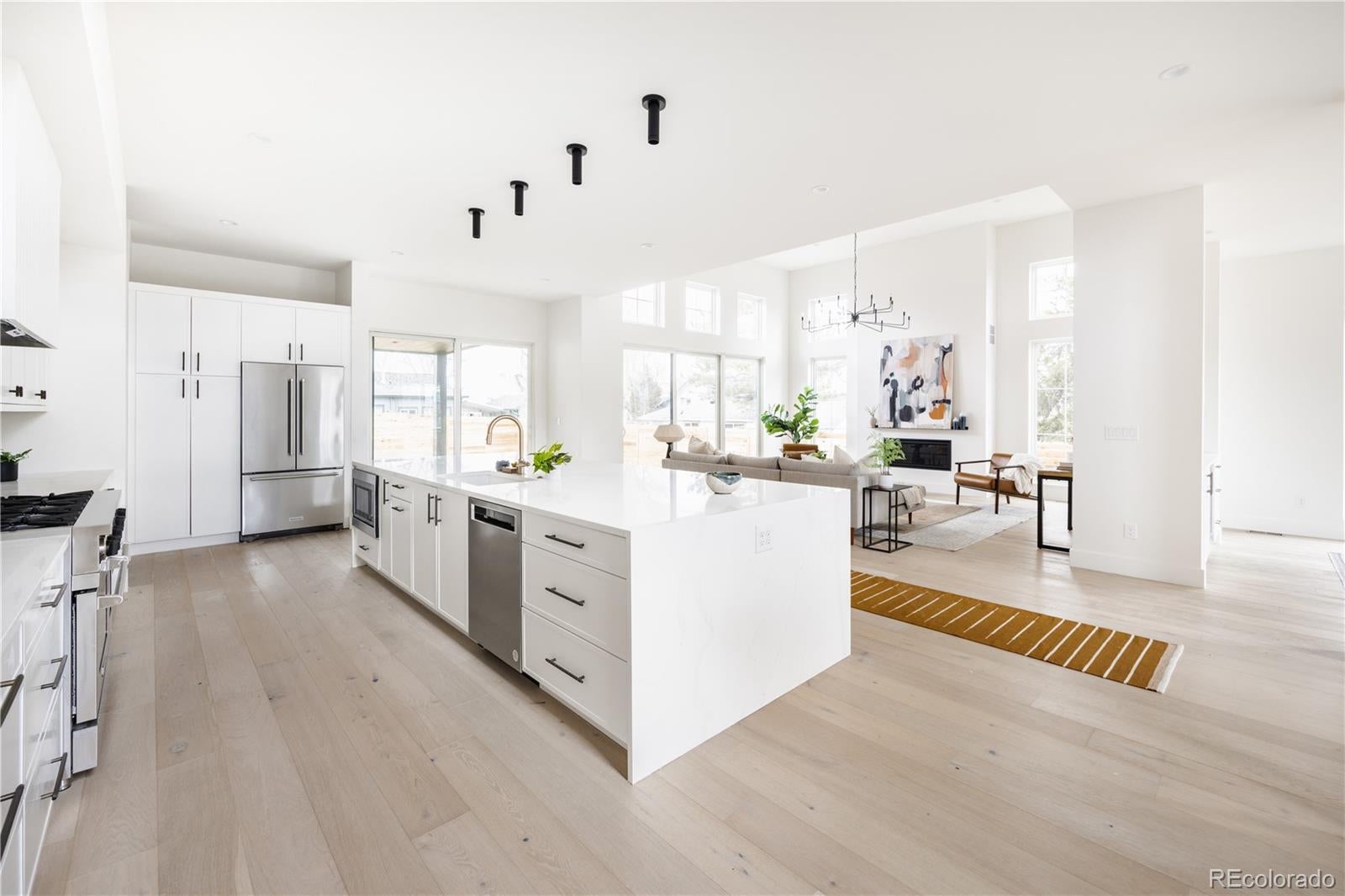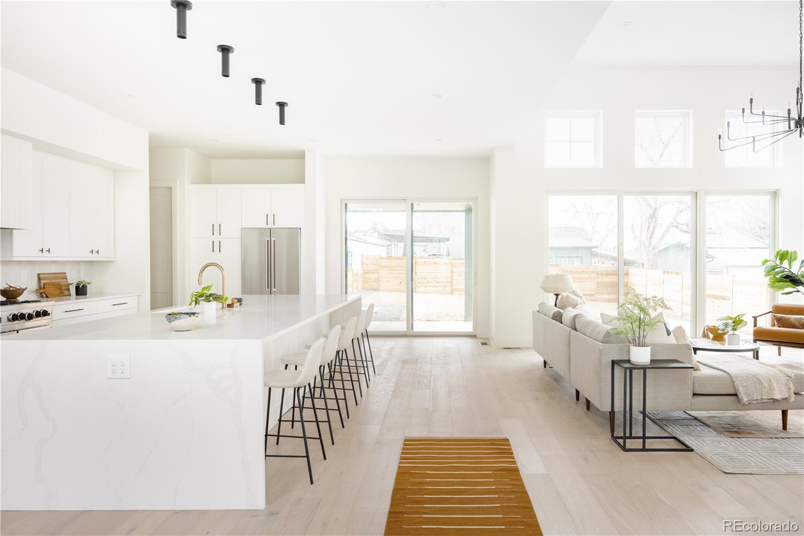 This new modern ~5000 sq. ft modern farmhouse single family with a large yard located only 10 minutes from Downtown Denver features 4 bedroom / 5 bathroom + office and separate dedicated home gym, huge mountain views, expansive floor plan with European 8" oak flooring throughout, 15' vaulted living room, central fireplace nearby the large chef kitchen with 48" professional range, 2 ovens, 12' island, large custom walk in pantry, designer light fixtures, huge master bathroom with two vanities, freestanding tub, large walk-in closet with built ins, vaulted ceilings in bedrooms. 2 Furnaces and 2 AC's for zoned control, expansive finished basement with a built in bar and huge recreational room.