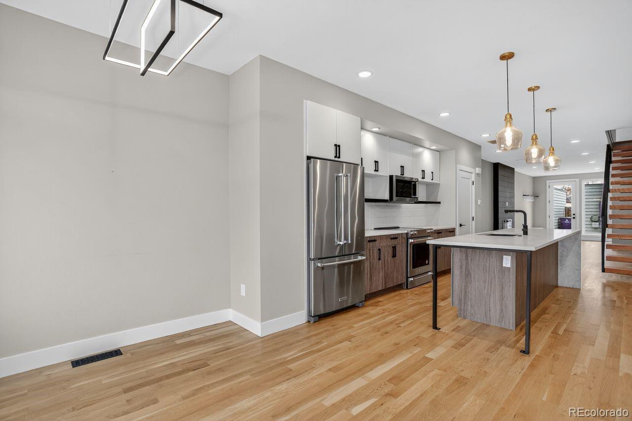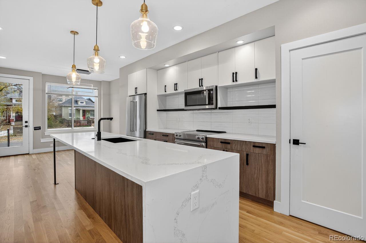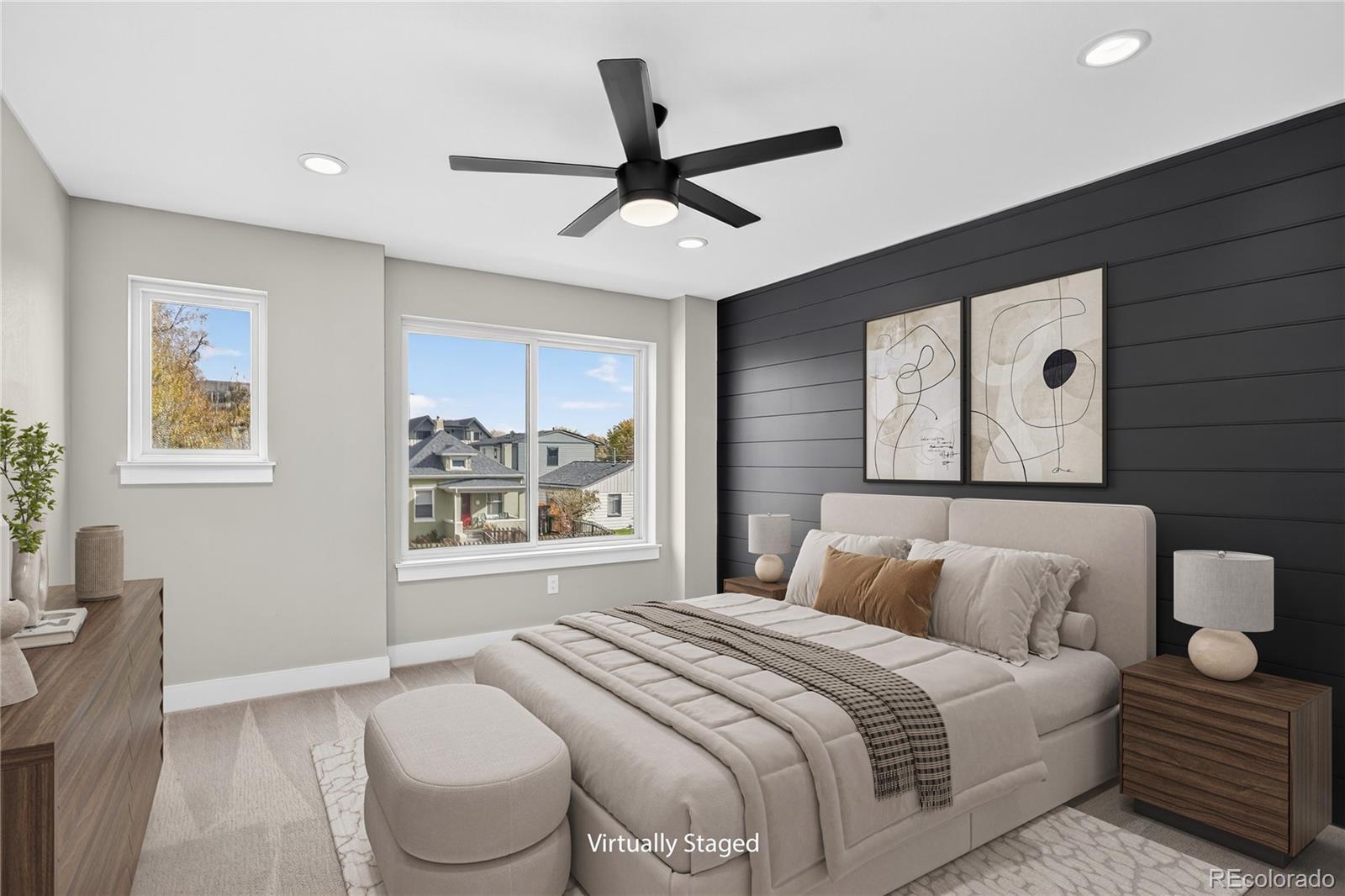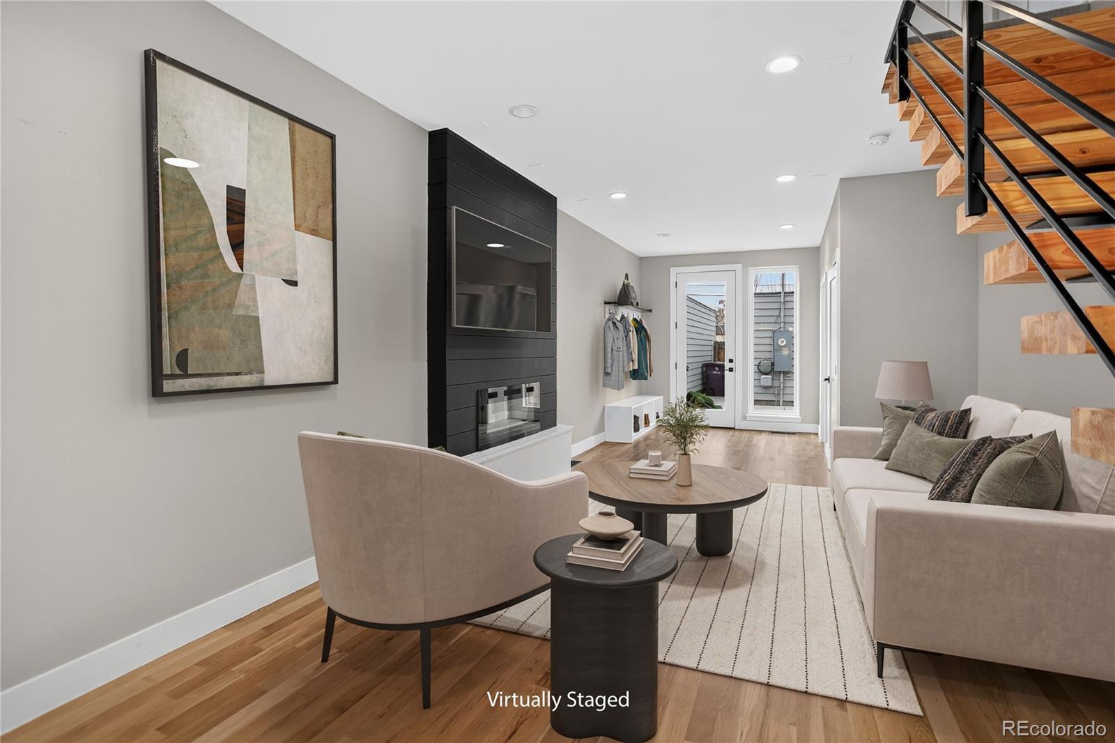 Modern living meets unbeatable views at 2179 S Bannock St. This contemporary 3-bed, 4-bath home sits just two blocks from the Evans Light Rail Station and moments from South Broadway’s top dining and entertainment, including Adrift, La Chiva, Corvus Coffee, Denver Distillery, and more. Designed with clean lines and upscale finishes, this home offers exceptional city and mountain views from TWO private rooftop decks, including a fully covered, west-facing deck that frames the skyline and Front Range in every season. Whether it’s sunrise over downtown or sunset over the Rockies, the views are truly standout. The open main level features real recently refinished oak hardwood floors and a sleek kitchen with soft-close cabinetry, a large quartz waterfall island, custom black iron shelving, under-cabinet lighting, pantry storage, and Bosch appliances. The living area includes a quartz-wrapped fireplace, pre-wired in-ceiling speakers, and a modern mono-rail staircase with wood treads and welded iron railings. Upstairs offers dual bedroom suites, each with designer tile, Euro-glass showers, quartz countertops, and contemporary lighting. Generous Andersen windows provide natural light throughout all levels. The rooftop level showcases two separate outdoor spaces, perfect for entertaining, relaxing, or simply enjoying the panoramic mountain and city views. Additional features: • Central networking panel • High-efficiency furnace and water heater • Central A/C • 1-car garage with WiFi-enabled opener + 220V EV charging • Fenced yard with concrete patio, grass, sprinklers (front & back) • No HOA A rare blend of style, location, walkability and year-round views in one of Denver’s most dynamic neighborhoods.