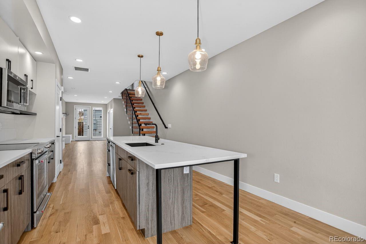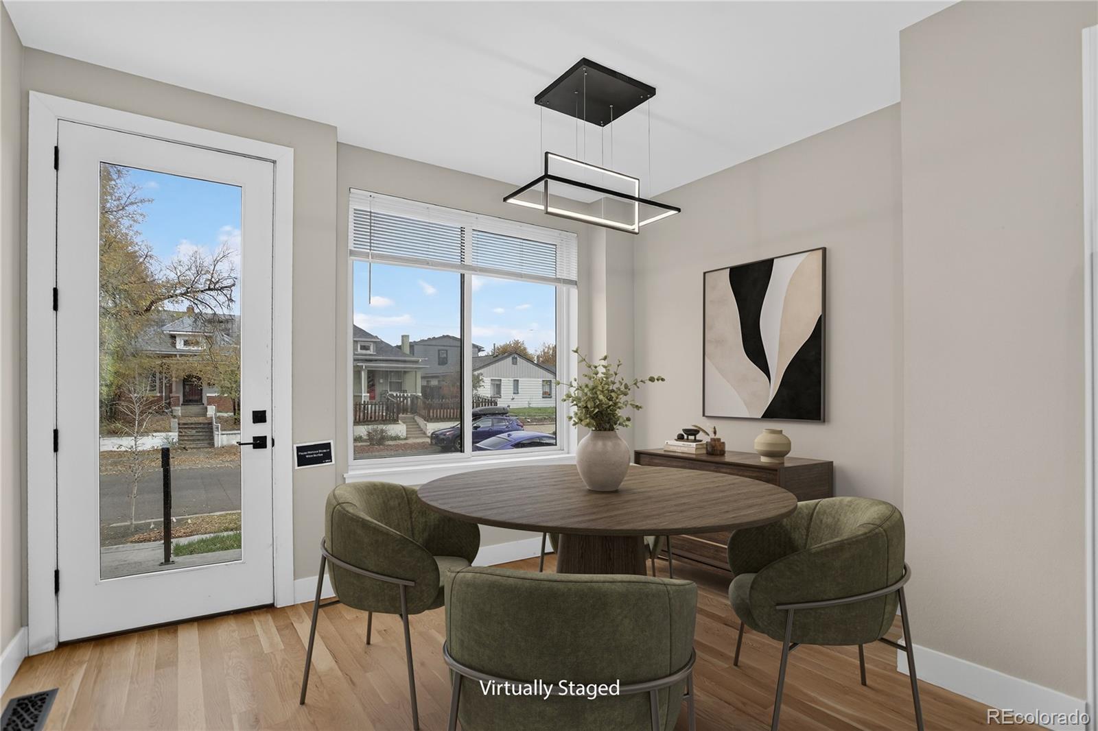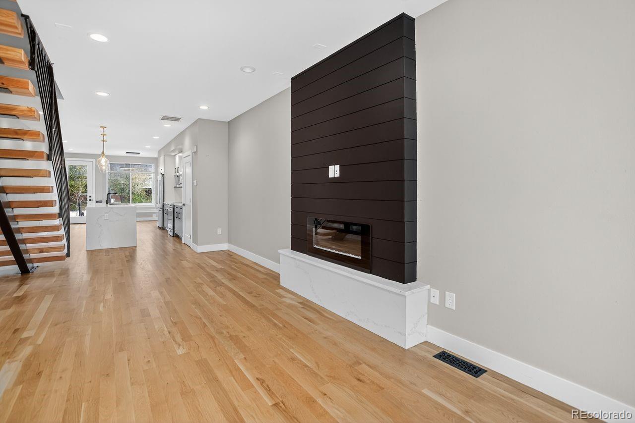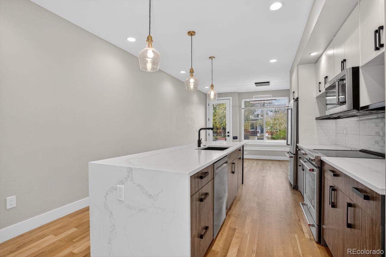 Modern living meets unbeatable views at 2179 S Bannock St. This contemporary 3-bed, 4-bath home sits just two blocks from the Evans Light Rail Station and moments from South Broadway’s top dining and entertainment, including Adrift, La Chiva, Corvus Coffee, Denver Distillery, and more. Designed with clean lines and upscale finishes, this home offers exceptional city and mountain views from TWO private rooftop decks, including a fully covered, west-facing deck that frames the skyline and Front Range in every season. Whether it’s sunrise over downtown or sunset over the Rockies, the views are truly standout. The open main level features real recently refinished oak hardwood floors and a sleek kitchen with soft-close cabinetry, a large quartz waterfall island, custom black iron shelving, under-cabinet lighting, pantry storage, and Bosch appliances. The living area includes a quartz-wrapped fireplace, pre-wired in-ceiling speakers, and a modern mono-rail staircase with wood treads and welded iron railings. Upstairs offers dual bedroom suites, each with designer tile, Euro-glass showers, quartz countertops, and contemporary lighting. Generous Andersen windows provide natural light throughout all levels. The rooftop level showcases two separate outdoor spaces, perfect for entertaining, relaxing, or simply enjoying the panoramic mountain and city views. Additional features: • Central networking panel • High-efficiency furnace and water heater • Central A/C • 1-car garage with WiFi-enabled opener + 220V EV charging • Fenced yard with concrete patio, grass, sprinklers (front & back) • No HOA A rare blend of style, location, walkability and year-round views in one of Denver’s most dynamic neighborhoods.