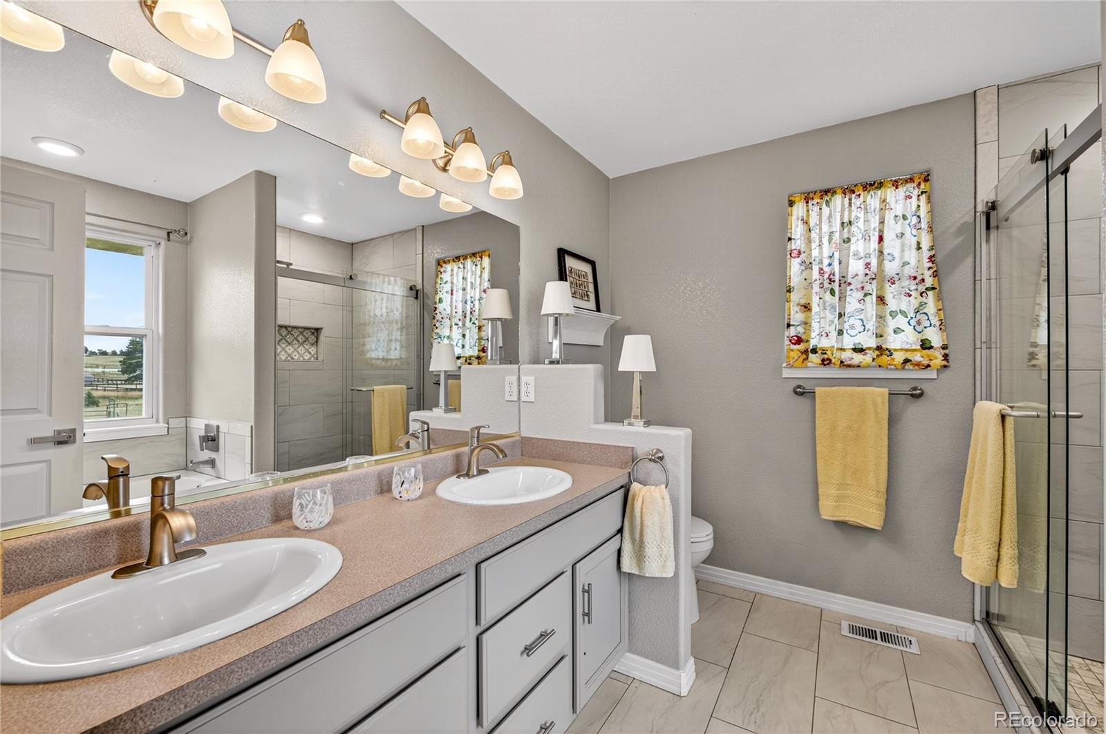 Welcome home to this delightful ranch-style retreat, perfectly nestled on 2.2 peaceful acres in the charming community of Elizabeth. This property offers the ideal balance of country living and modern comfort, surrounded by serene natural beauty. The two-stall barn, complete with electricity and water, is ready for your horses, hobbies, or extra storage—offering endless versatility for your lifestyle. Experience Colorado living at its finest with an outdoor oasis designed for relaxation and entertaining. Spend evenings gathered around the cozy fire pit, enjoy quiet mornings in the gazebo, or unwind in the hot tub under a blanket of stars. The spacious deck invites you to take in sweeping views and crisp country air all year long. Step inside to discover a bright and inviting open floor plan featuring cathedral ceilings and an abundance of natural light. With four generous bedrooms and three beautifully updated baths, this home provides both comfort and functionality. The primary suite offers private deck access and a recently remodeled ensuite showcasing a sleek European glass shower and modern finishes. The tastefully updated kitchen is a chef’s delight, complete with stainless steel appliances, ample counter space, and stylish cabinetry—perfect for cooking and entertaining alike. The walkout basement offers a multi-generational living situation or potential rental to help with expenses. Recent upgrades provide peace of mind and value, including a new Class 4 impact-resistant roof (installed in 2025), new exterior doors throughout, and a new water softener. The driveway has been resurfaced with five inches of fresh asphalt, ensuring durability through the winter months. In total, the seller has invested over $30,000 in thoughtful improvements this year alone, making this home truly move-in ready.