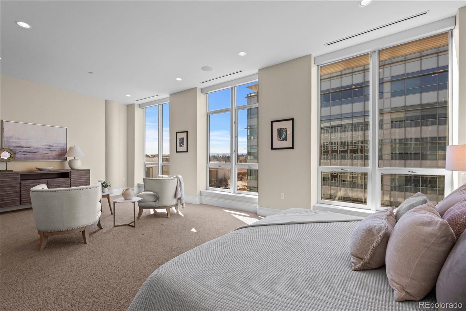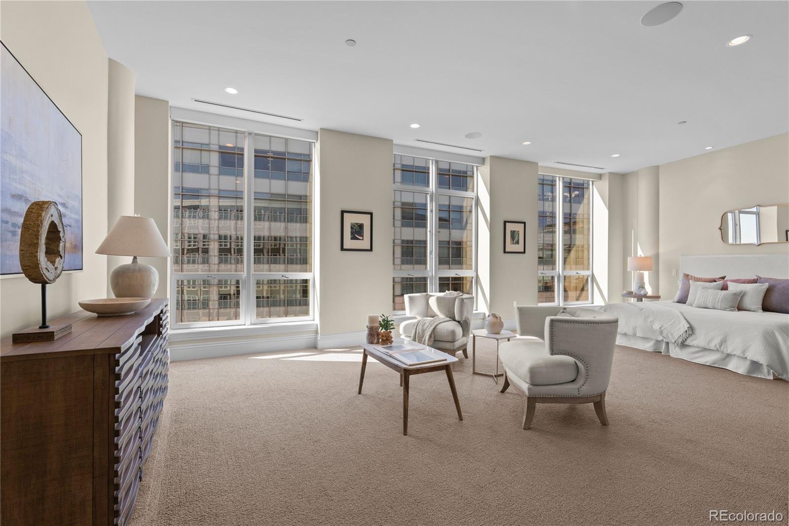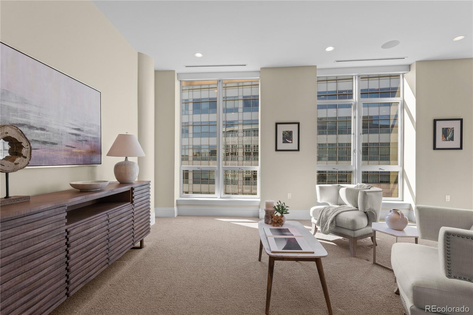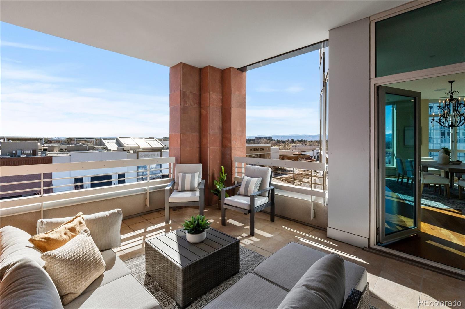 Located within NorthCreek—Cherry Creek North’s only private, gated & full-service enclave, this stunning Southwest corner residence offers nearly 3,000 square feet of beautifully designed living space, featuring 2 bedrooms plus an office & 2.5 baths. The oversized foyer sets an elegant tone from the moment you enter, while floor-to-ceiling windows draw your gaze to sweeping mountain views, filling the home with natural light and creating a breathtaking backdrop for daily living. The formal living & dining rooms are framed by expansive windows & anchored by a double-sided fireplace—a striking centerpiece that elevates both intimate gatherings & glamorous dinner parties. The dining room, with its luminous ambiance, feels like a private jewel box designed for unforgettable evenings. The designer chef’s kitchen boasts top-of-the-line appliances, a grand two-tiered island & oversized walk-in pantry. Custom enhancements include a built-out bar with floor-to-ceiling wine storage, separate wine cooler & mini beverage fridge. The kitchen opens seamlessly into the family room, a cozy retreat for quiet evenings. Enjoy warm afternoon light on the covered balcony, ideal for year-round dining, lounging or grilling. The primary suite is a true sanctuary, generously sized to accommodate a seating area features a spa-inspired en-suite bathroom with a large soaking tub, elegant vanity & custom walk-in closet. The guest suite includes its own walk-in closet & private bath, ensuring comfort & privacy for visitors. A dedicated office with wide French doors integrates seamlessly into the home’s living space. Additional features include a well-appointed laundry room with built-ins & sink, automatic shades throughout & 2 reserved parking spaces in the secure garage. With 24-hour concierge services, NorthCreek offers the ultimate low-maintenance, lock-and-leave lifestyle—just steps from the world-class dining, luxury boutiques & art galleries of Cherry Creek North.