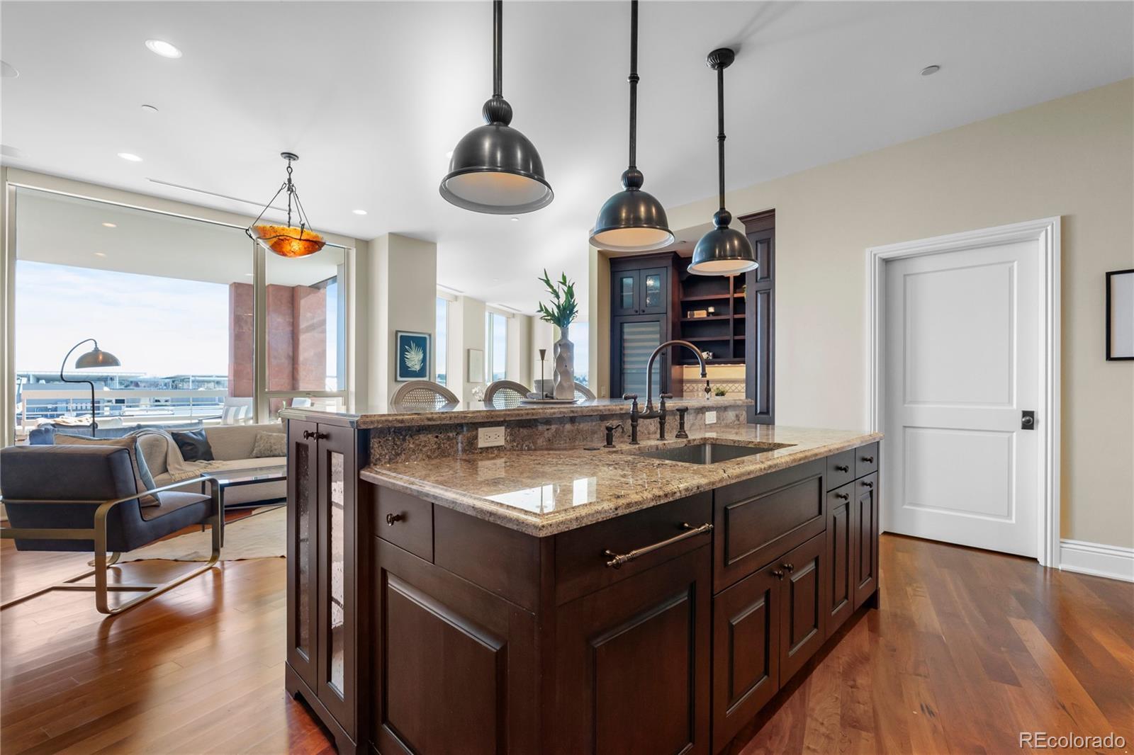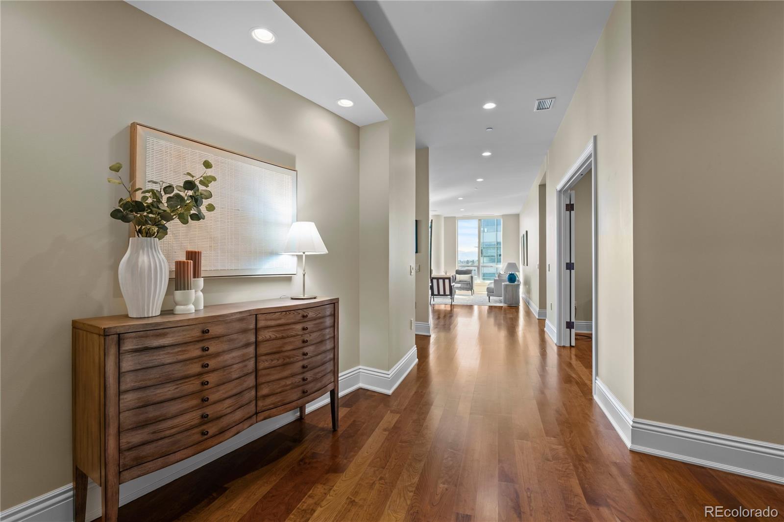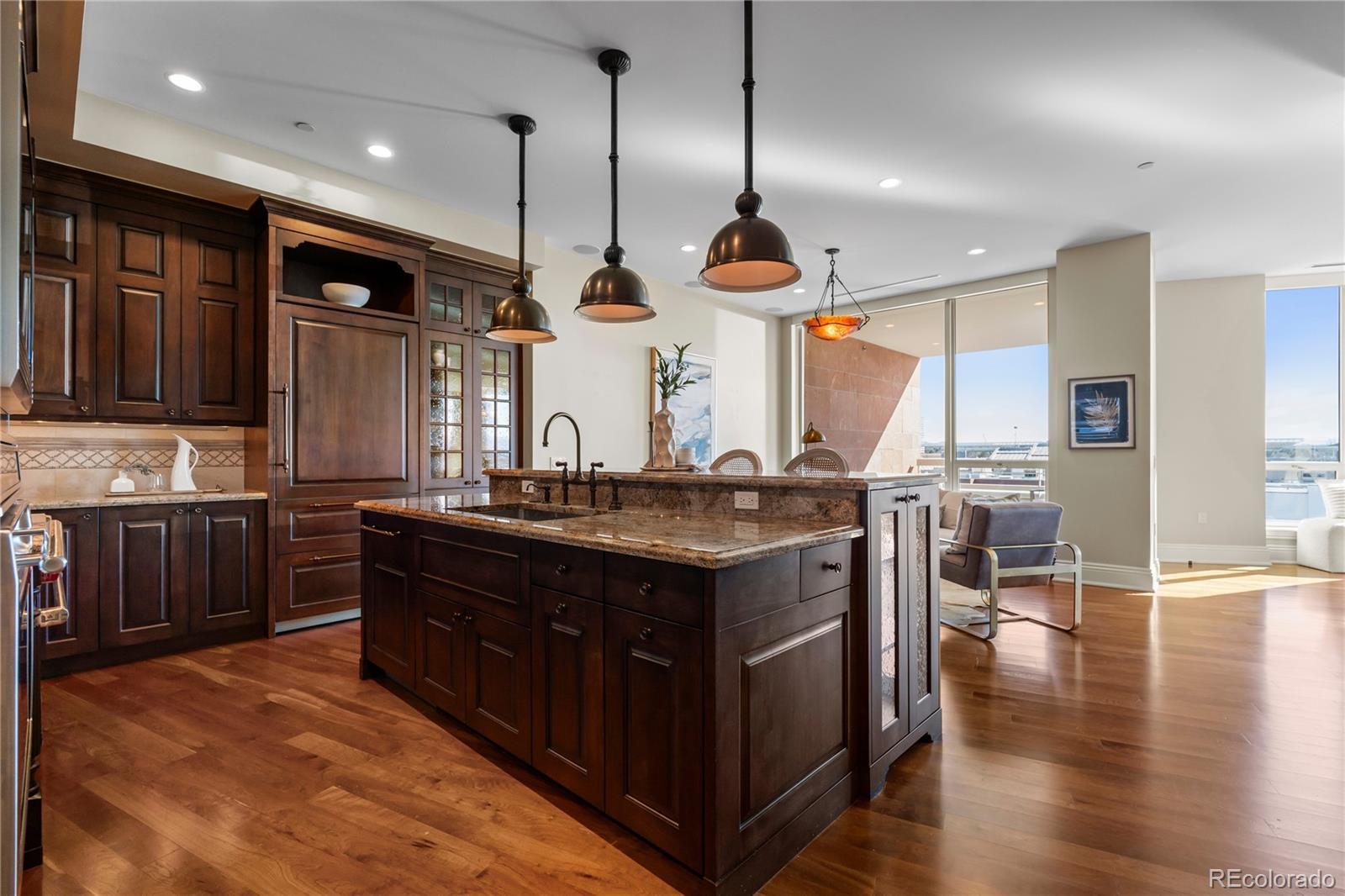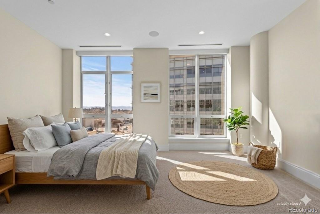 Located within NorthCreek—Cherry Creek North’s only private, gated & full-service enclave, this stunning Southwest corner residence offers nearly 3,000 square feet of beautifully designed living space, featuring 2 bedrooms plus an office & 2.5 baths. The oversized foyer sets an elegant tone from the moment you enter, while floor-to-ceiling windows draw your gaze to sweeping mountain views, filling the home with natural light and creating a breathtaking backdrop for daily living. The formal living & dining rooms are framed by expansive windows & anchored by a double-sided fireplace—a striking centerpiece that elevates both intimate gatherings & glamorous dinner parties. The dining room, with its luminous ambiance, feels like a private jewel box designed for unforgettable evenings. The designer chef’s kitchen boasts top-of-the-line appliances, a grand two-tiered island & oversized walk-in pantry. Custom enhancements include a built-out bar with floor-to-ceiling wine storage, separate wine cooler & mini beverage fridge. The kitchen opens seamlessly into the family room, a cozy retreat for quiet evenings. Enjoy warm afternoon light on the covered balcony, ideal for year-round dining, lounging or grilling. The primary suite is a true sanctuary, generously sized to accommodate a seating area features a spa-inspired en-suite bathroom with a large soaking tub, elegant vanity & custom walk-in closet. The guest suite includes its own walk-in closet & private bath, ensuring comfort & privacy for visitors. A dedicated office with wide French doors integrates seamlessly into the home’s living space. Additional features include a well-appointed laundry room with built-ins & sink, automatic shades throughout & 2 reserved parking spaces in the secure garage. With 24-hour concierge services, NorthCreek offers the ultimate low-maintenance, lock-and-leave lifestyle—just steps from the world-class dining, luxury boutiques & art galleries of Cherry Creek North.