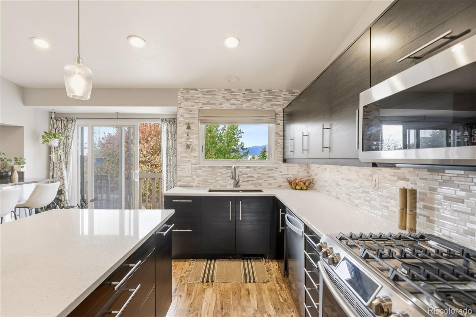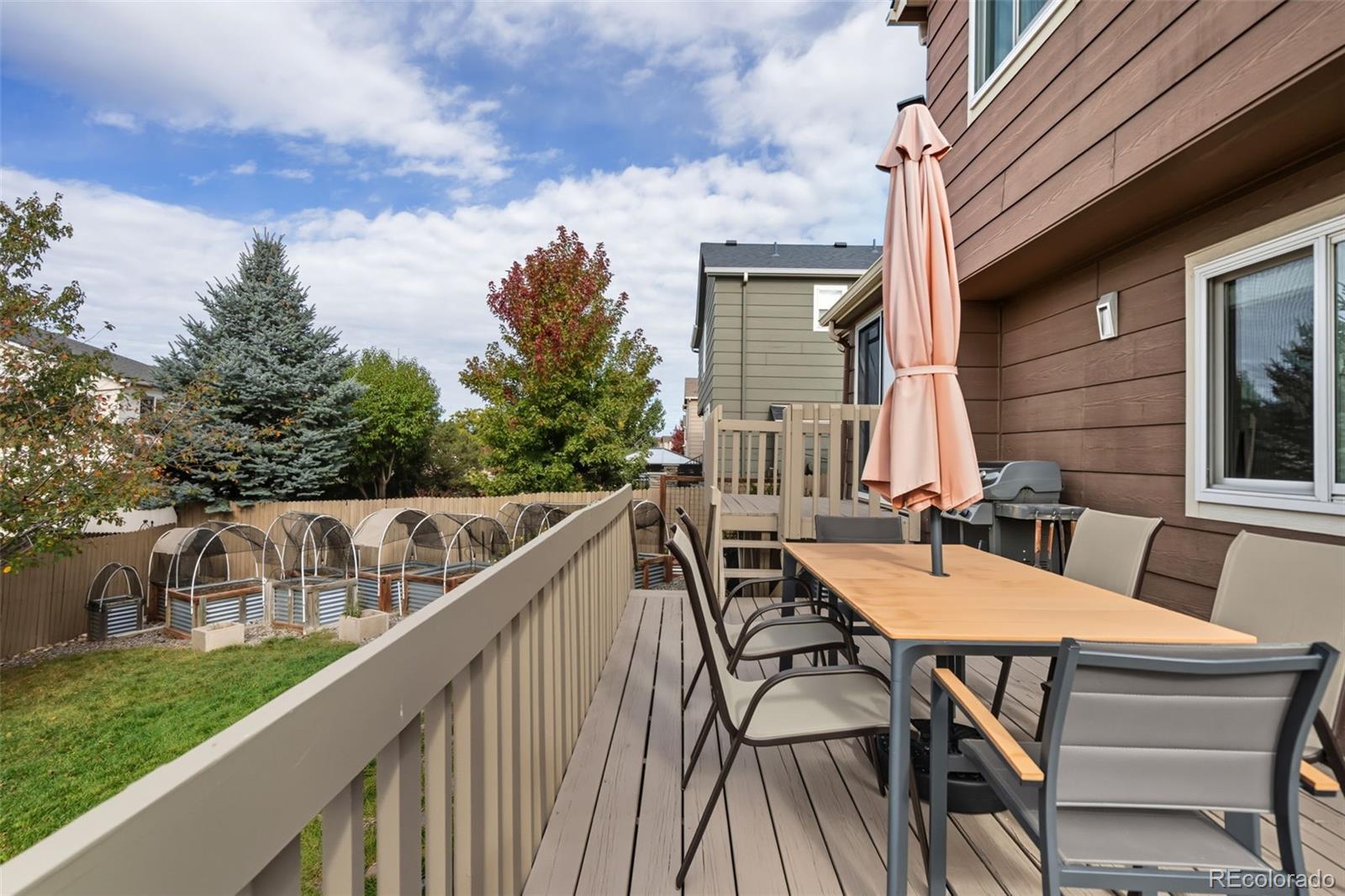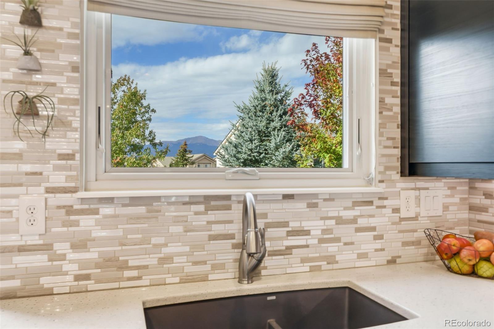 Welcome to this beautifully upgraded 4-bed 3-bath home in Wagon Trails! Step in from the front porch to see the stunning open main level complete with dining room and kitchen featuring a massive island, quartz countertops, custom backsplash, soft-close drawers, under cabinet lighting, a breakfast bar, LVP flooring, plus gorgeous mountain views! Or enjoy your meals al fresco on the double tiered deck, conveniently located off of the kitchen. Cozy up by the fireplace with stunning statement tile in the living room. Retreat upstairs to the primary suite with ensuite bath featuring upgraded double vanity and free-standing shower. Two additional bedrooms, both with views of Pikes Peak, plus a full bathroom round out the upper level. Head to the finished basement which can serve as a bedroom, family room, home gym and more, complete with another 3/4 bathroom. Relax in the backyard oasis featuring a double deck, colorful fall foliage, custom raised garden beds, and spectacular mountain views. Additional upgrades include newer Renewal By Andersen windows throughout, newer exterior paint, newer water heater, and fresh new front landscaping. The sought-after Wagon Trails community offers wonderful amenities, including a pool, tennis, and basketball courts as well as a convenient location near parks, D11 schools, shopping, and more. Don’t miss your chance to see this magnificently upgraded home- schedule a showing today!