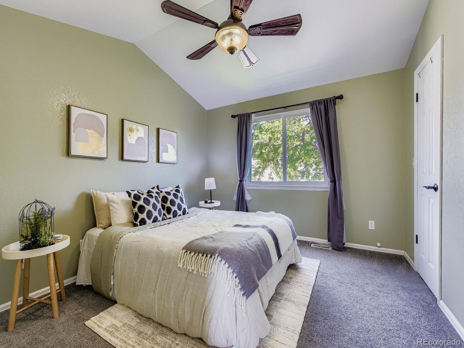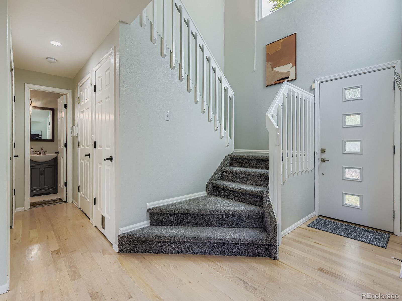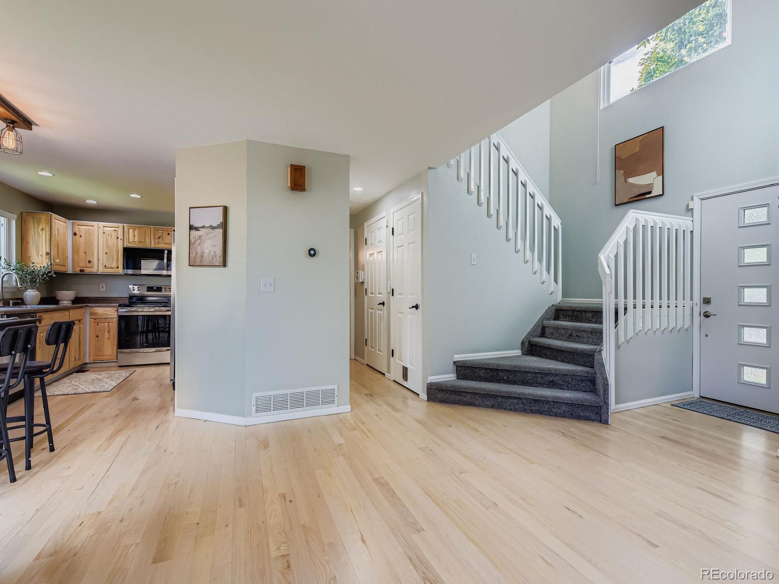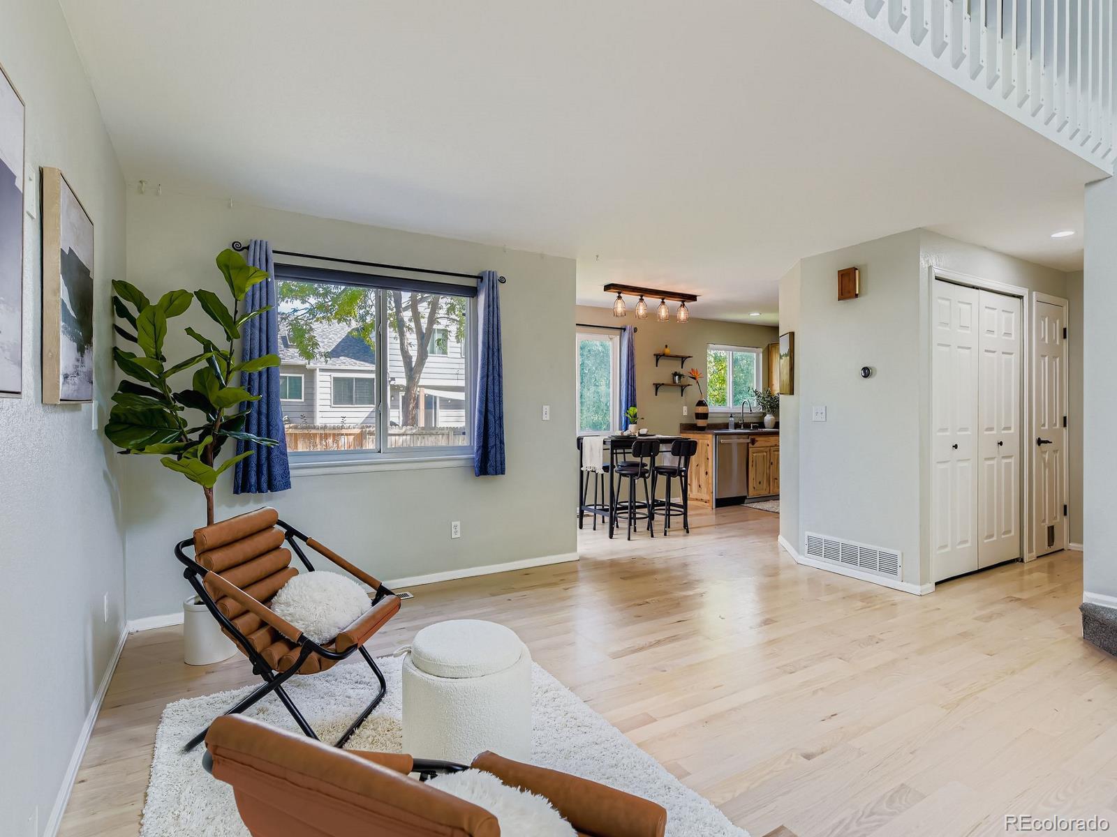 Welcome to this beautifully remodeled home in the desirable Flintlock neighborhood in Littleton, Colorado! Nestled near the foothills and just a short walk to Powderhorn Park, this move-in ready home blends comfort, convenience, and charm. Enjoy an open floor plan with vaulted ceilings and abundant natural light. The main level features recently refinished hardwood floors and fresh interior/exterior paint, creating a clean look. The updated kitchen showcases handcrafted pine wood cabinet doors, stainless steel appliances—including a newer microwave, stove/oven, dishwasher, garbage disposal, and pull-out faucet. Smart features include a thermostat, WiFi-enabled garage door opener, and an efficient gas tankless water heater. Upstairs are two spacious bedrooms, each with a ceiling fan. The primary suite offers vaulted ceilings and a walk-in closet with custom shelving. The beautifully renovated full bathroom is just down the hall, tastefully updated with double sinks, tile flooring, tub and backsplash, and modern fixtures—including bidets in both bathrooms. A cozy loft area, ideal for a home office or reading nook, features a handcrafted pine wood accent wall and built-in TV mount. Additional features include Sprinkler system (front and rear), Central A/C, main-floor laundry (washer/dryer not included), Newer carpeting upstairs, New pavers in walkway and backyard, Fresh flower beds in the front landscaping, New front porch concrete and steps, updated front door, upgraded door hardware and window blinds. The unfinished basement offers room to expand—perfect for a gym, guest suite, or media room. A composter by the back fence is included. Per a prior appraisal (see documents), above-ground finished space is 1,212 sq ft. Don't miss your chance to own this turnkey gem—schedule your showing today! Listing details deems reliable, but Buyer and buyer's agent are responsible for verifying listing details.
