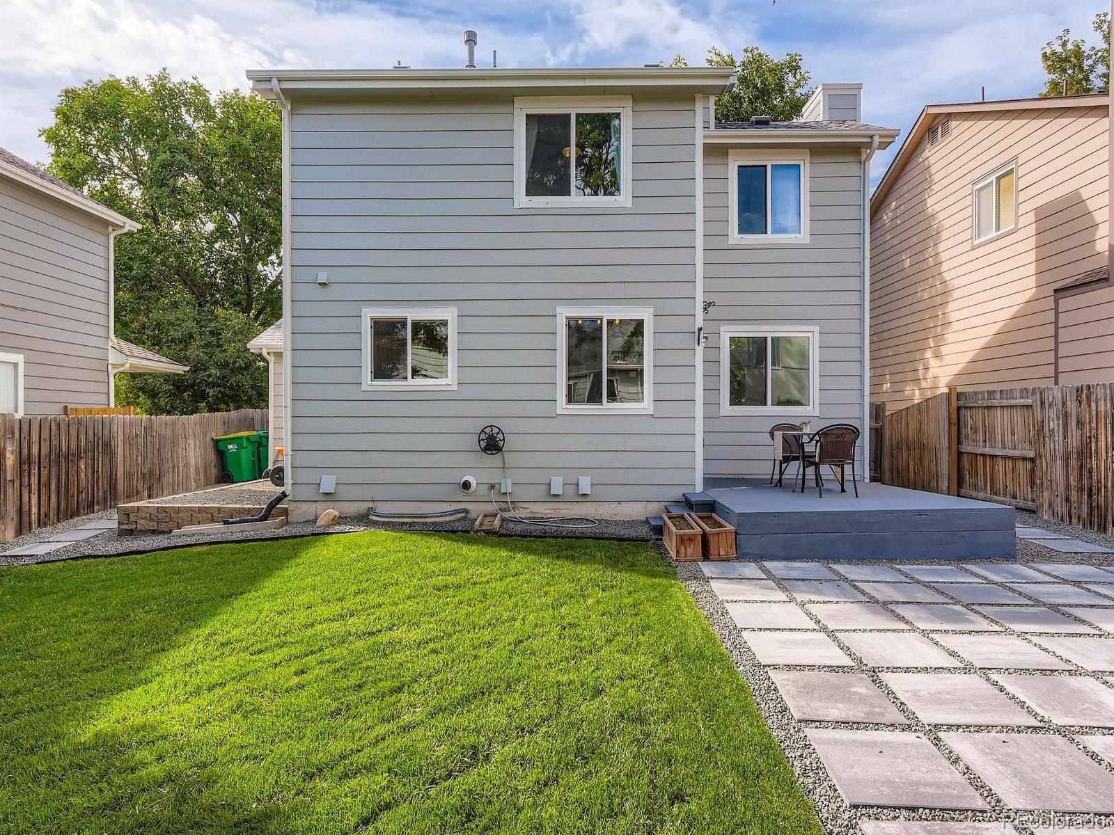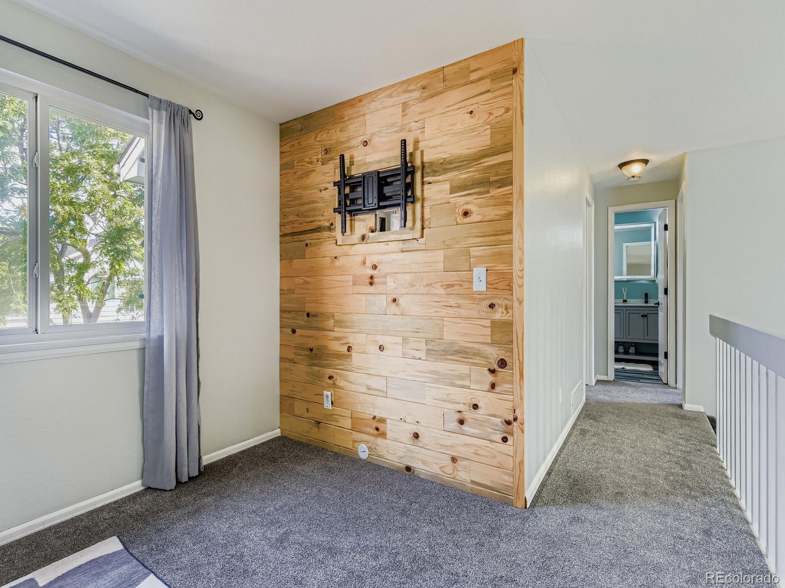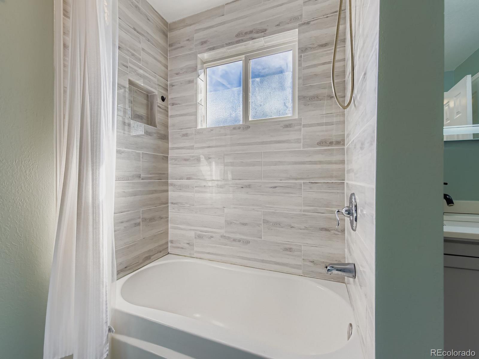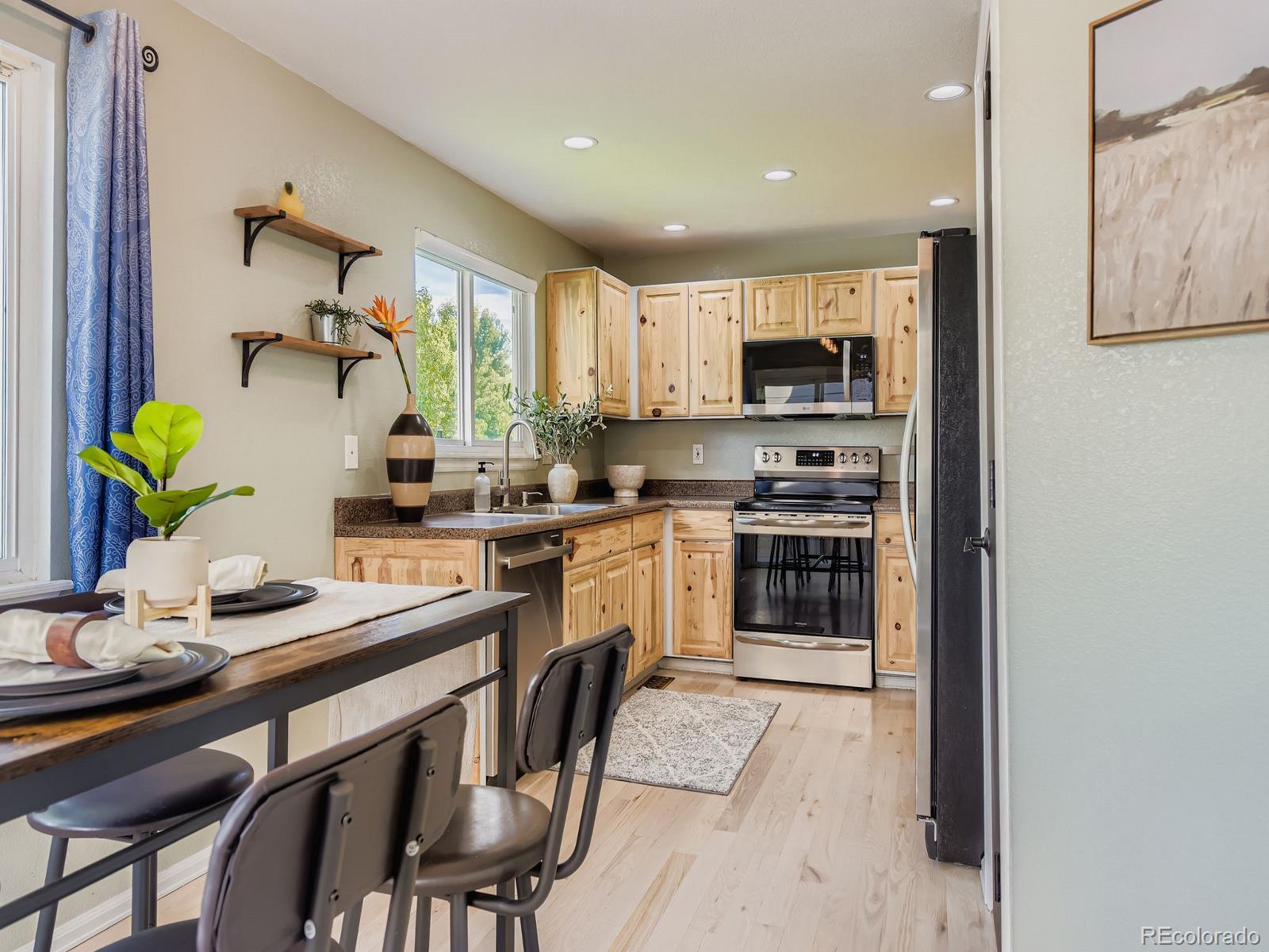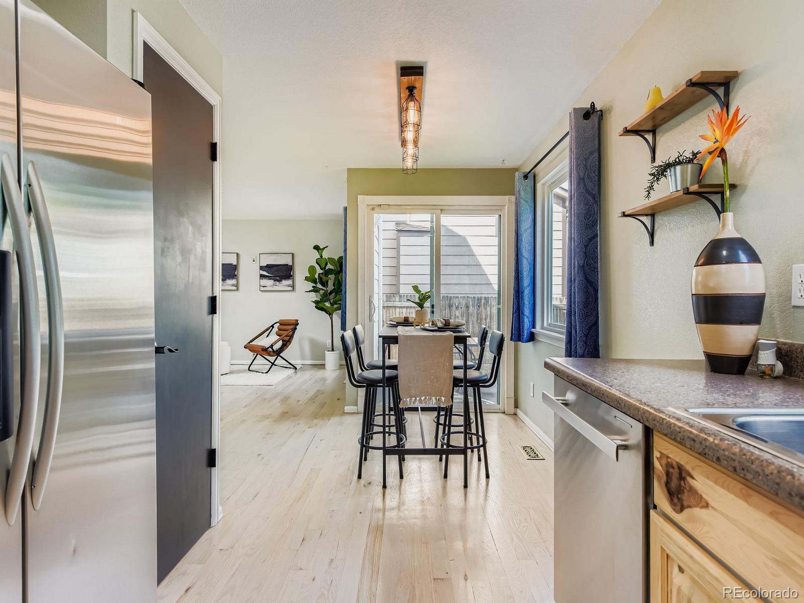 Welcome to this beautifully remodeled home in the desirable Flintlock neighborhood in Littleton, Colorado! Nestled near the foothills and just a short walk to Powderhorn Park, this move-in ready home blends comfort, convenience, and charm. Enjoy an open floor plan with vaulted ceilings and abundant natural light. The main level features recently refinished hardwood floors and fresh interior/exterior paint, creating a clean look. The updated kitchen showcases handcrafted pine wood cabinet doors, stainless steel appliances—including a newer microwave, stove/oven, dishwasher, garbage disposal, and pull-out faucet. Smart features include a thermostat, WiFi-enabled garage door opener, and an efficient gas tankless water heater. Upstairs are two spacious bedrooms, each with a ceiling fan. The primary suite offers vaulted ceilings and a walk-in closet with custom shelving. The beautifully renovated full bathroom is just down the hall, tastefully updated with double sinks, tile flooring, tub and backsplash, and modern fixtures—including bidets in both bathrooms. A cozy loft area, ideal for a home office or reading nook, features a handcrafted pine wood accent wall and built-in TV mount. Additional features include Sprinkler system (front and rear), Central A/C, main-floor laundry (washer/dryer not included), Newer carpeting upstairs, New pavers in walkway and backyard, Fresh flower beds in the front landscaping, New front porch concrete and steps, updated front door, upgraded door hardware and window blinds. The unfinished basement offers room to expand—perfect for a gym, guest suite, or media room. A composter by the back fence is included. Per a prior appraisal (see documents), above-ground finished space is 1,212 sq ft. Don't miss your chance to own this turnkey gem—schedule your showing today! Listing details deems reliable, but Buyer and buyer's agent are responsible for verifying listing details.