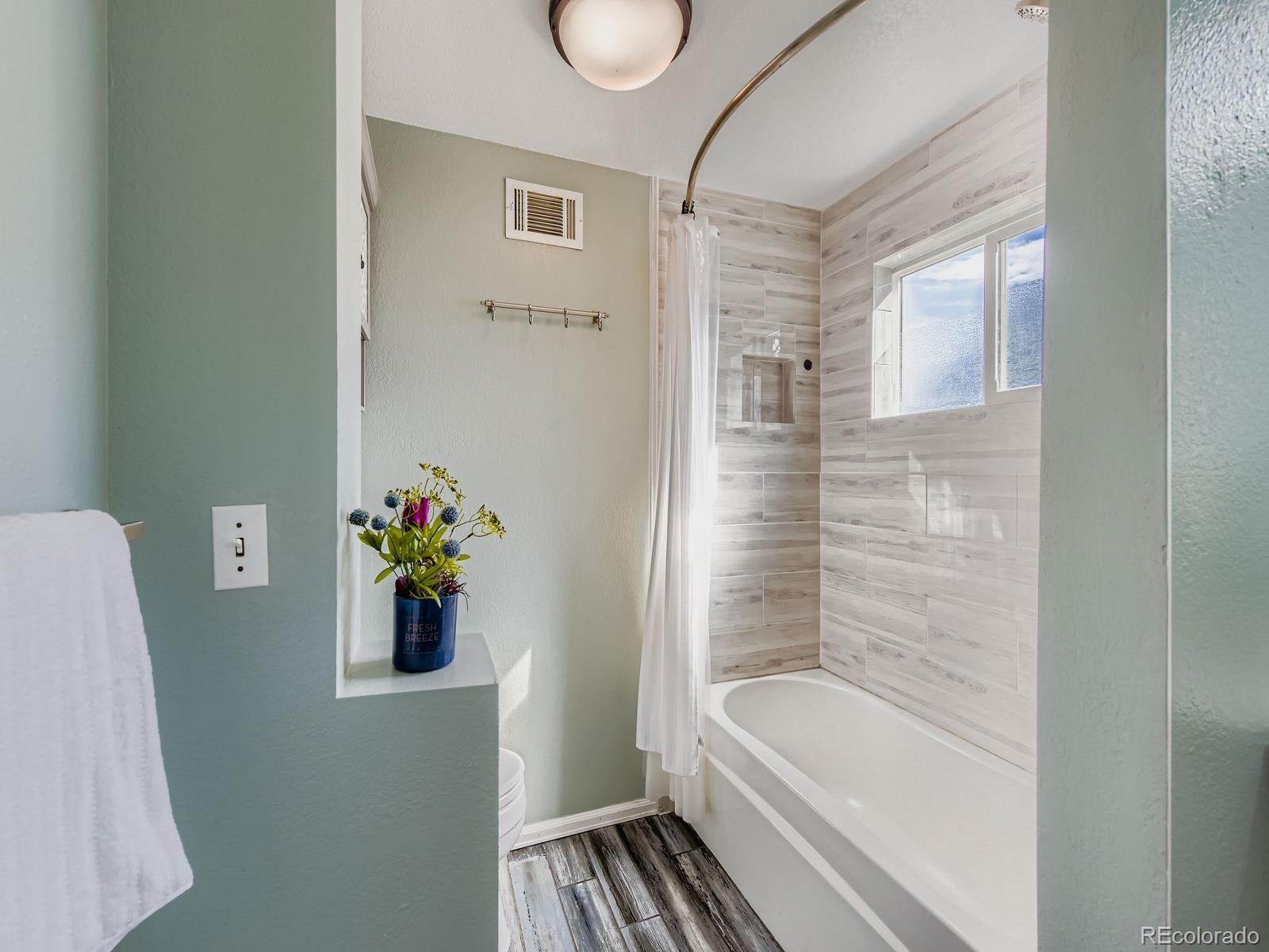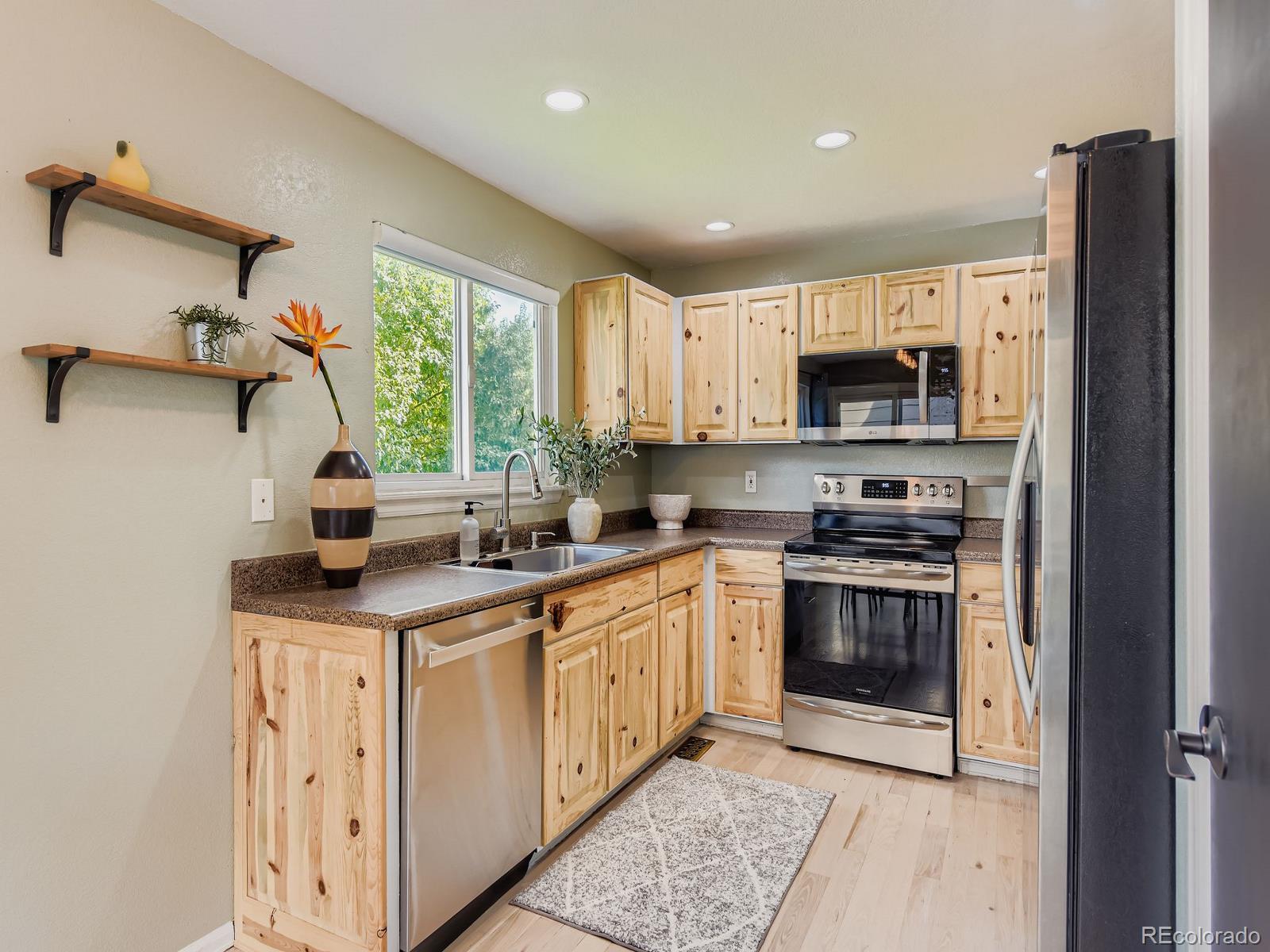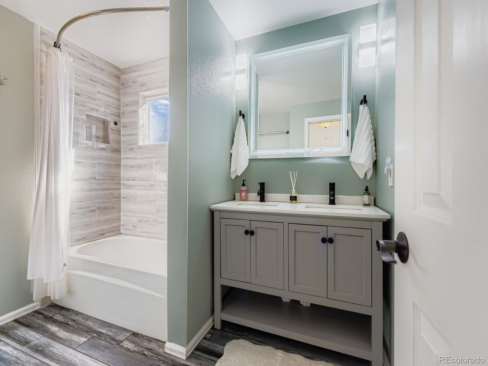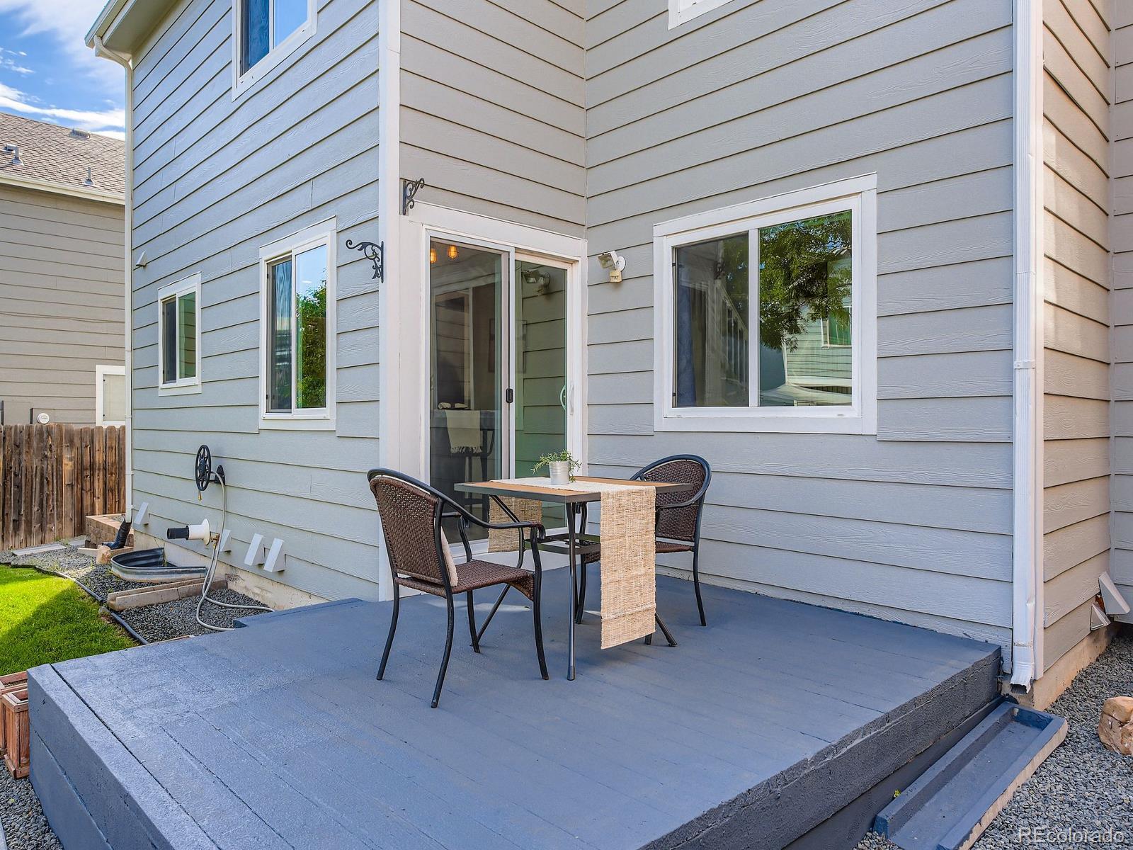 Welcome to this beautifully remodeled home in the desirable Flintlock neighborhood in Littleton, Colorado! Nestled near the foothills and just a short walk to Powderhorn Park, this move-in ready home blends comfort, convenience, and charm. Enjoy an open floor plan with vaulted ceilings and abundant natural light. The main level features recently refinished hardwood floors and fresh interior/exterior paint, creating a clean look. The updated kitchen showcases handcrafted pine wood cabinet doors, stainless steel appliances—including a newer microwave, stove/oven, dishwasher, garbage disposal, and pull-out faucet. Smart features include a thermostat, WiFi-enabled garage door opener, and an efficient gas tankless water heater. Upstairs are two spacious bedrooms, each with a ceiling fan. The primary suite offers vaulted ceilings and a walk-in closet with custom shelving. The beautifully renovated full bathroom is just down the hall, tastefully updated with double sinks, tile flooring, tub and backsplash, and modern fixtures—including bidets in both bathrooms. A cozy loft area, ideal for a home office or reading nook, features a handcrafted pine wood accent wall and built-in TV mount. Additional features include Sprinkler system (front and rear), Central A/C, main-floor laundry (washer/dryer not included), Newer carpeting upstairs, New pavers in walkway and backyard, Fresh flower beds in the front landscaping, New front porch concrete and steps, updated front door, upgraded door hardware and window blinds. The unfinished basement offers room to expand—perfect for a gym, guest suite, or media room. A composter by the back fence is included. Per a prior appraisal (see documents), above-ground finished space is 1,212 sq ft. Don't miss your chance to own this turnkey gem—schedule your showing today! Listing details deems reliable, but Buyer and buyer's agent are responsible for verifying listing details.