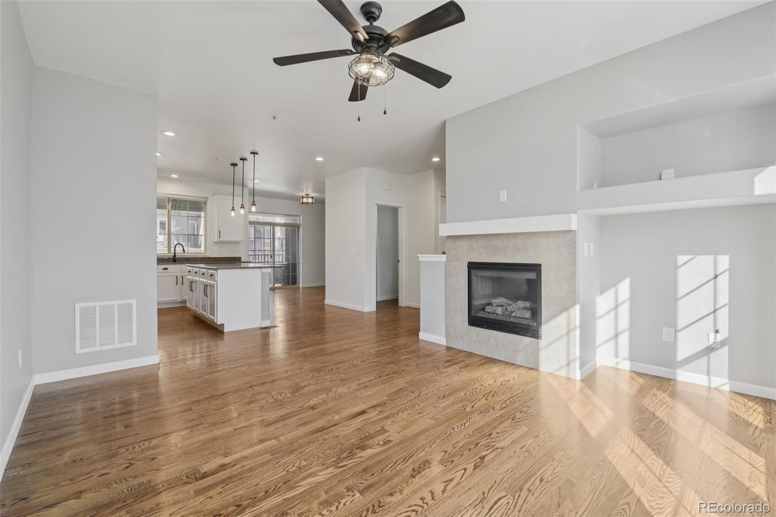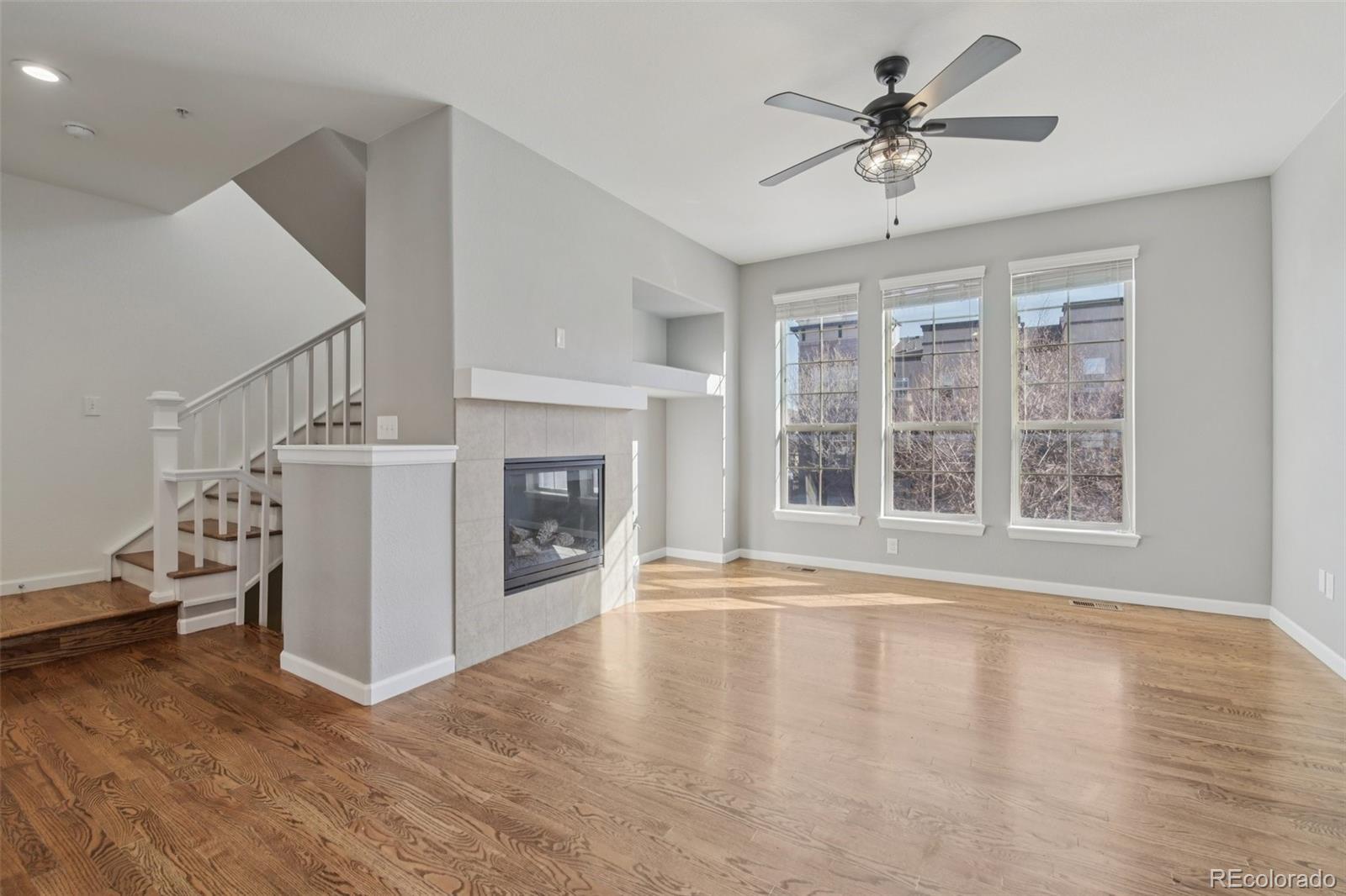 Prime Town Center Location! This beautifully updated 3 bedroom, 3 bath townhome offers 1,949 square feet of open-concept living and 3 outdoor living spaces for your enjoyment. The main level features a chef’s kitchen with a center island, granite countertops and newer premium appliances. The adjacent dining area includes a pantry and sliding glass doors that open to a west-facing covered deck, ideal for evening sunsets and viewing holiday fireworks. The spacious family room is filled with natural light and showcases a gas fireplace and large windows that look out to the elevated front patio. Throughout the main level, you’ll find extensive hardwood flooring, including hardwood stairs, updated lighting and a remodeled powder room. Upstairs, the primary suite is a true retreat, featuring a private bathroom, walk-in closet with built-ins, and its own private balcony offering space to enjoy your favorite beverage any time of day. Two additional bedrooms, full bathroom and a convenient upper-level laundry complete the second floor. The finished basement provides flex space for your specific needs: home office, media room or gym. You will enjoy the convenience of the two car attached garage and guest parking nearby. Additional features include: brand new water heater and WiFi garage door motor, newer furnace and air conditioner (2025), updated lighting and roof was replaced 3 years ago. This move in ready townhome combines modern upgrades, outdoor living spaces, and an unbeatable location in the heart of Town Center living. Steps from Civic Green Park, walkable shopping, dining, and entertainment plus access to all four Highlands Ranch recreation centers.