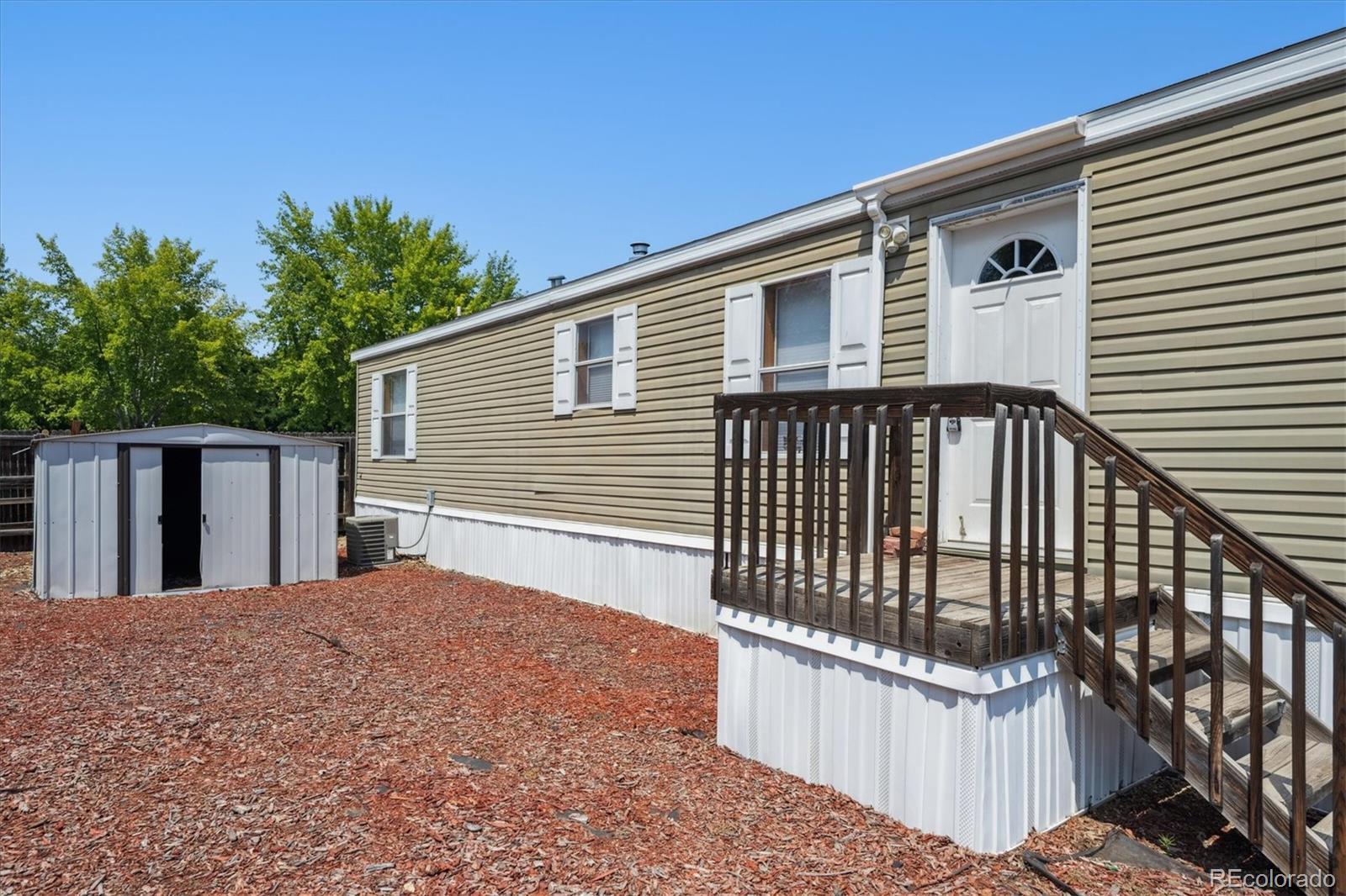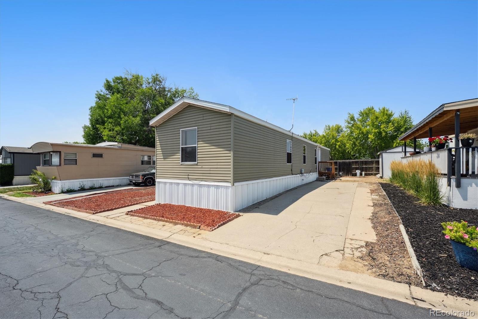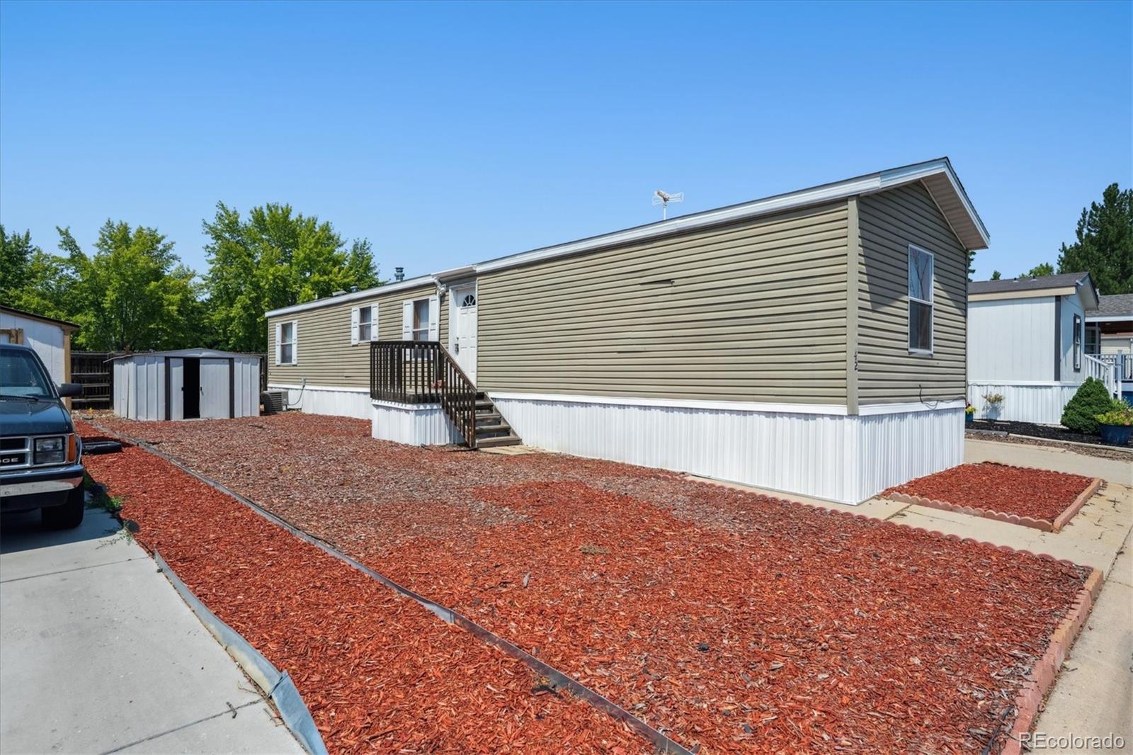 Say hello to this awesome 2012 manufactured home in Casa Estates MHC! It sits on a nice lot with a storage shed, long driveway, and great curb appeal. Located in the Adams 12 Five Star School District, this home also comes with access to awesome community amenities like the pool, playground, and clubhouse! Inside, you’ll find a bright and comfy family room with vaulted ceilings, carpet throughout, and a ceiling fan to keep things cool. The eat-in kitchen is just off the living space and features laminate floors, all appliances included, plus a peninsula for extra barstool seating—perfect for quick meals or hanging out. NEW QUARTZ COUNTERTOPS JUST INSTALLED! The primary bedroom has soft carpet and double closets for extra storage, and it’s right next to a full bathroom with a shower-tub combo and single-sink vanity. On the other side of the home, you’ll find two more bedrooms with the same cozy carpet and another full bathroom with the same great setup. Window coverings are included too, which is always a bonus. There are also washer and dryer hookups to make laundry easy. Whether you’re buying your first home or just looking for a low-maintenance xeriscaped lot to call your own, this one is worth a look. Seller will provide you a new TV after you close.