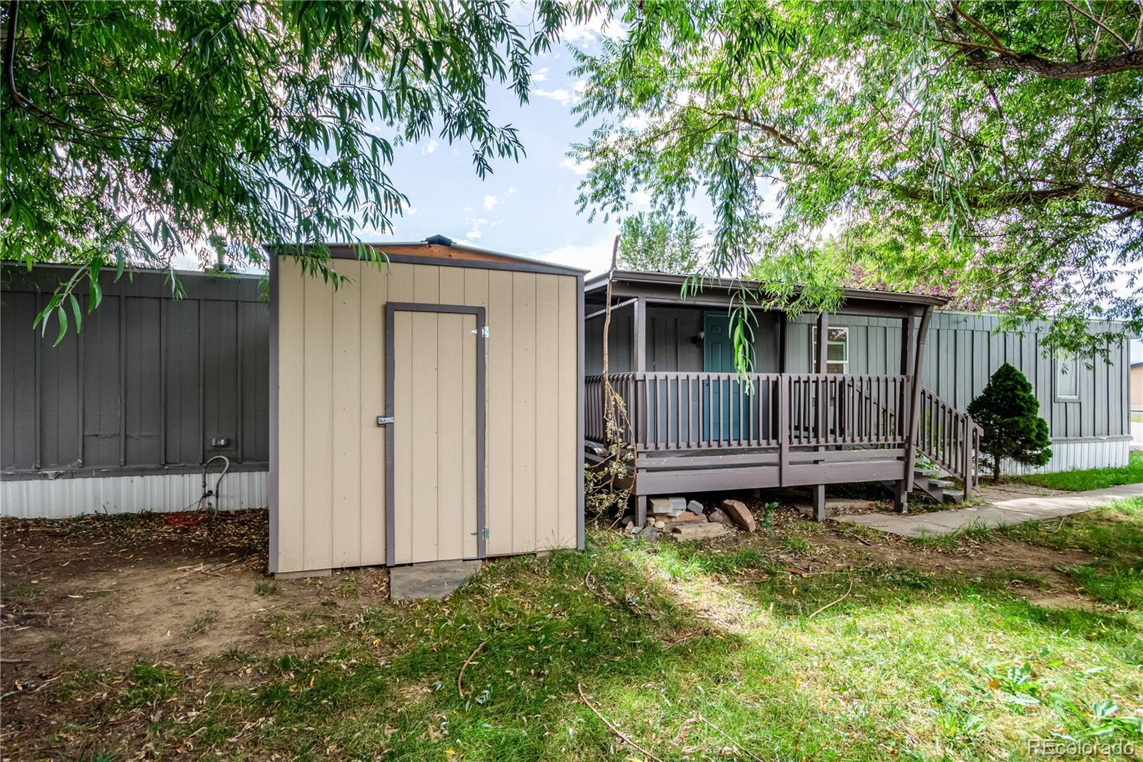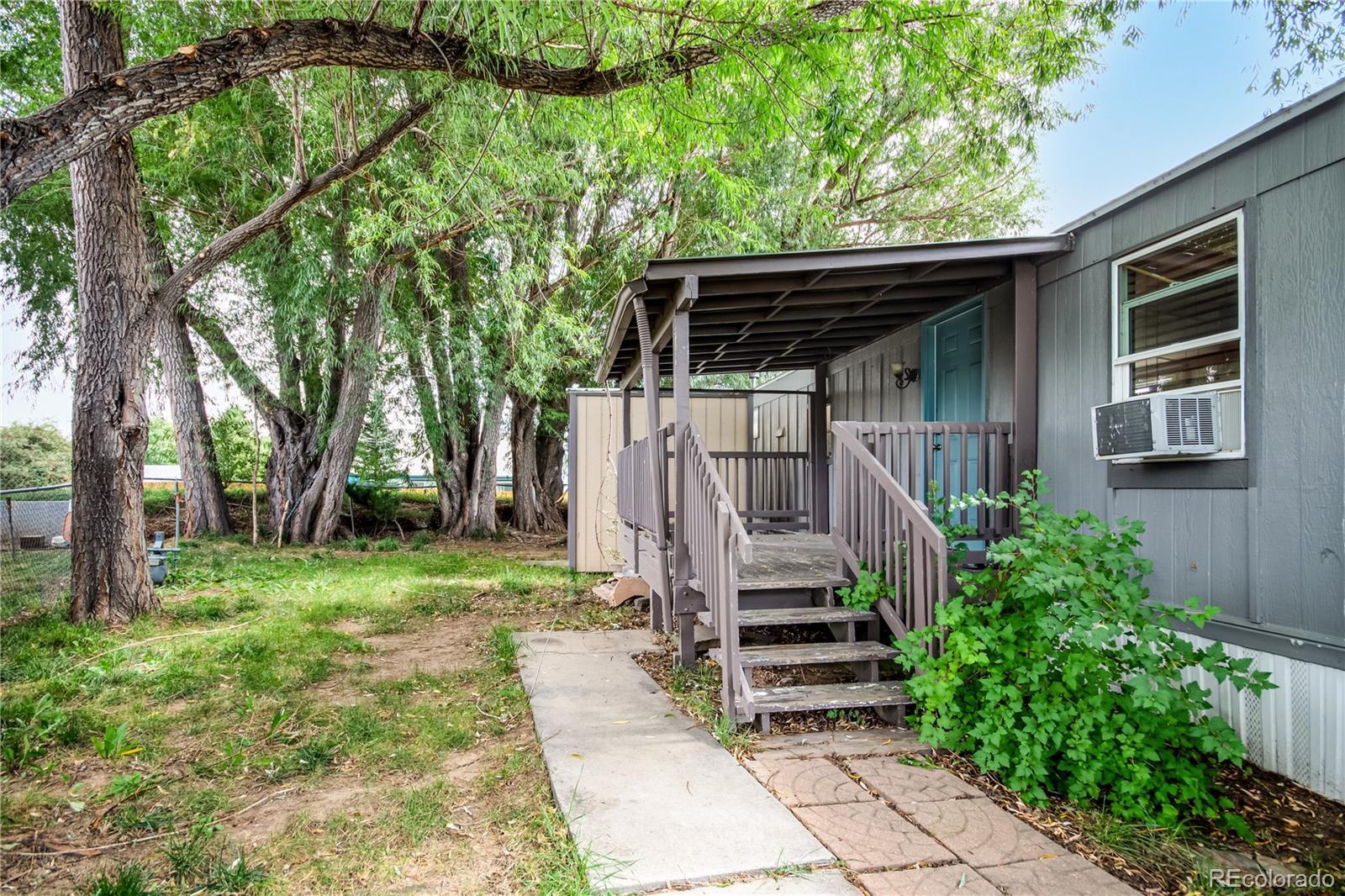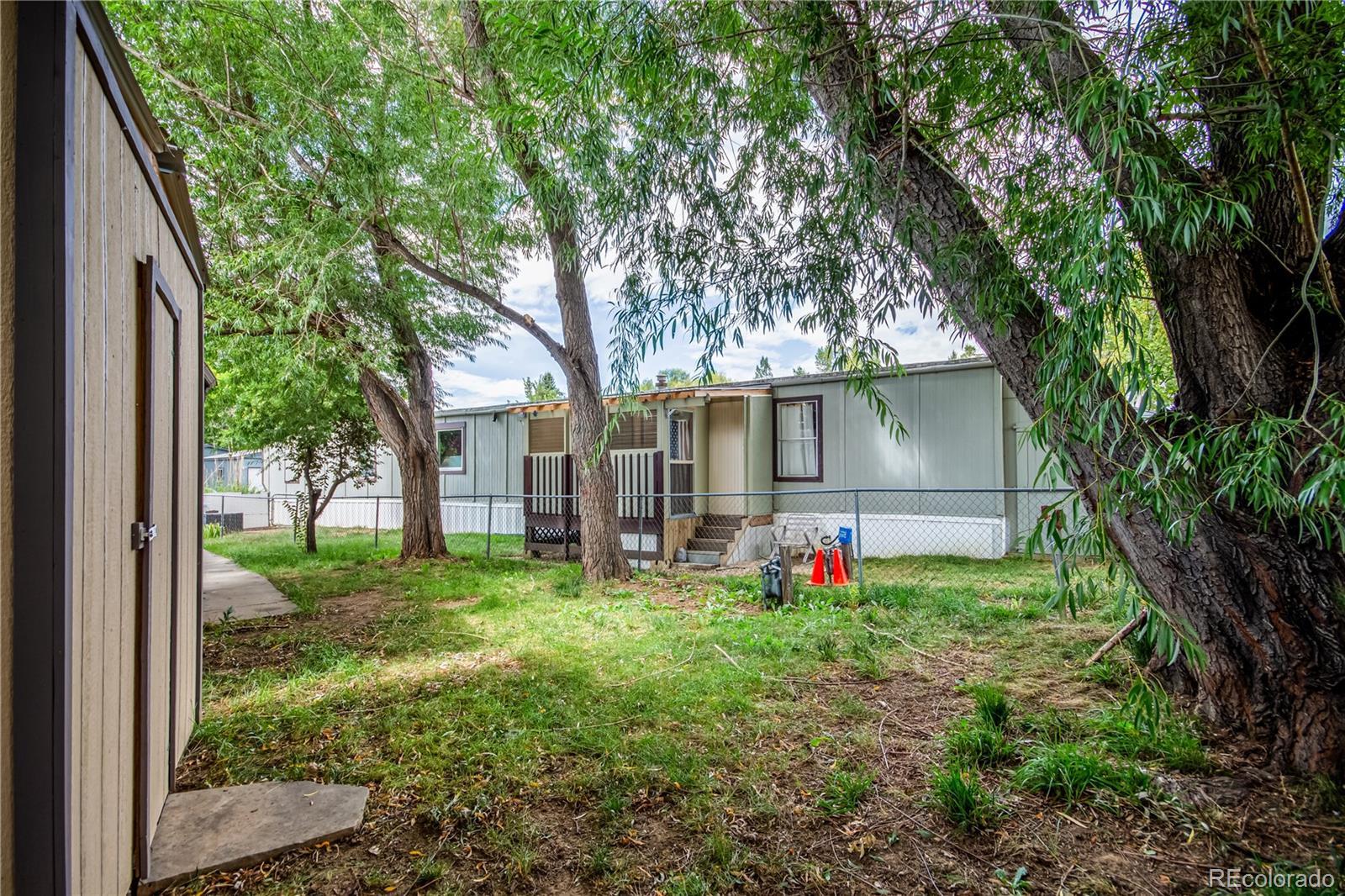 Fantastic opportunity to own this charming 2-bed, 2-bath manufactured home in Alpine Vista Village! PLUS! The home is nestled on a cul-de-sac and backs to mostly green space, offering an uninterrupted view & added tranquility. Conveniently minutes from shopping, dining options, and access to the Hwy 287. Don't miss out! Inviting interior showcases abundant natural light, wood-look flooring in all the right places, a neutral palette, and vaulted ceilings that add to the airy feel. The welcoming living room is adorned with a skylight, providing a charming focal point and enhancing the room's openness. The eat-in kitchen comes with built-in appliances, wood cabinetry, and a mosaic tile backsplash. Plush carpet adds comfort to the main bedroom! It boasts a full bathroom that features a soaking tub. If relaxing is on your mind, the cozy front porch is the ideal spot! This gem also includes a storage shed to ensure tools are organized. With many trees on your fully fenced yard, you can enjoy privacy and a refreshing outdoor space.