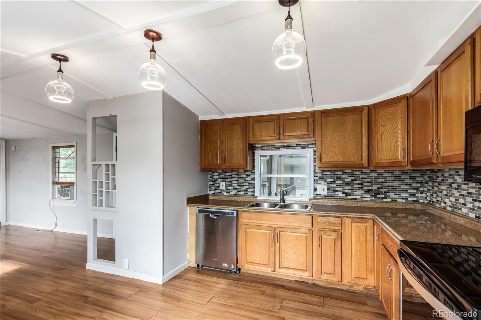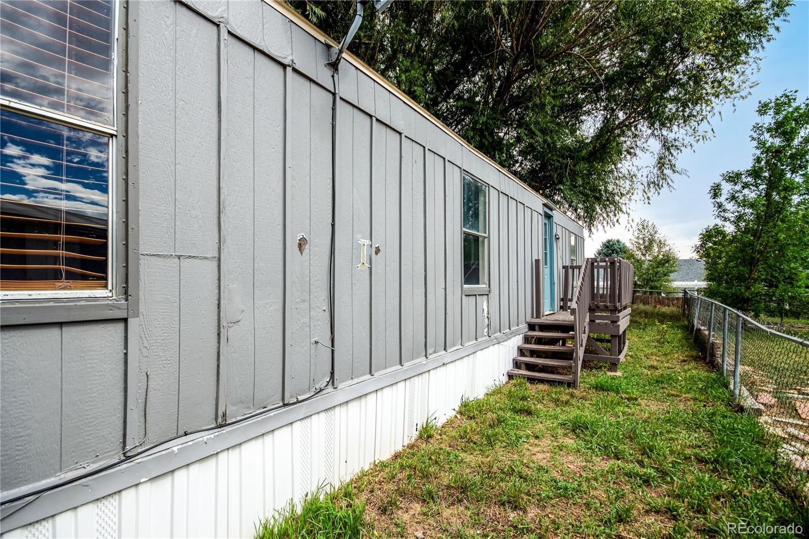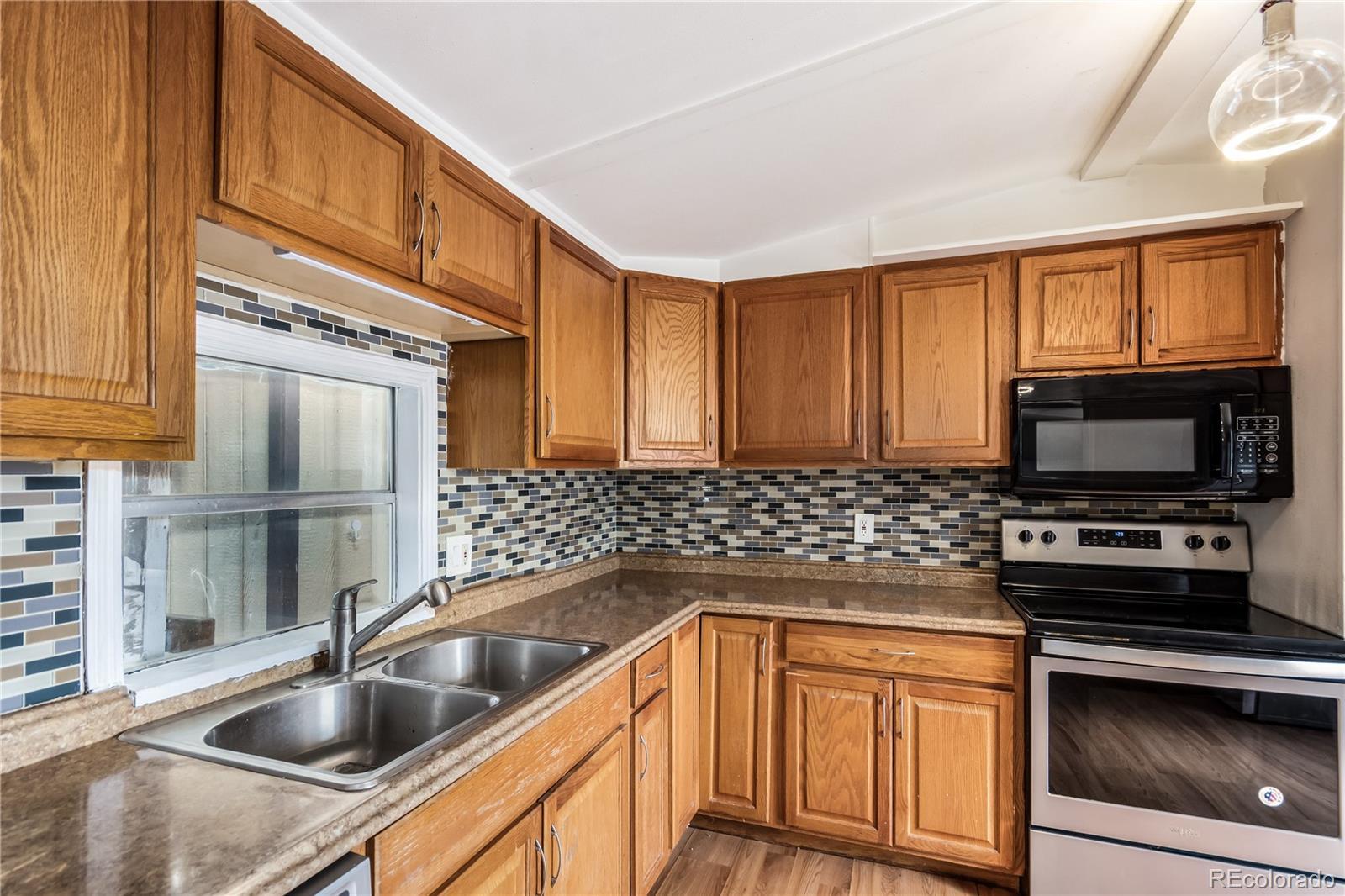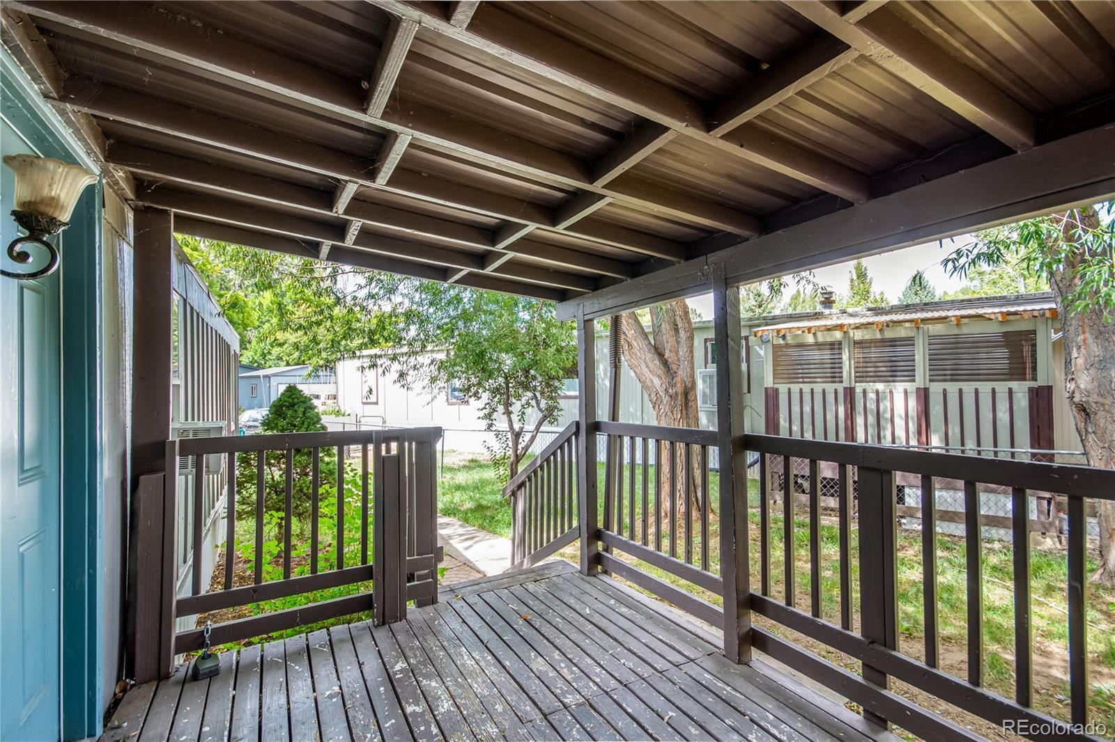 Fantastic opportunity to own this charming 2-bed, 2-bath manufactured home in Alpine Vista Village! PLUS! The home is nestled on a cul-de-sac and backs to mostly green space, offering an uninterrupted view & added tranquility. Conveniently minutes from shopping, dining options, and access to the Hwy 287. Don't miss out! Inviting interior showcases abundant natural light, wood-look flooring in all the right places, a neutral palette, and vaulted ceilings that add to the airy feel. The welcoming living room is adorned with a skylight, providing a charming focal point and enhancing the room's openness. The eat-in kitchen comes with built-in appliances, wood cabinetry, and a mosaic tile backsplash. Plush carpet adds comfort to the main bedroom! It boasts a full bathroom that features a soaking tub. If relaxing is on your mind, the cozy front porch is the ideal spot! This gem also includes a storage shed to ensure tools are organized. With many trees on your fully fenced yard, you can enjoy privacy and a refreshing outdoor space.