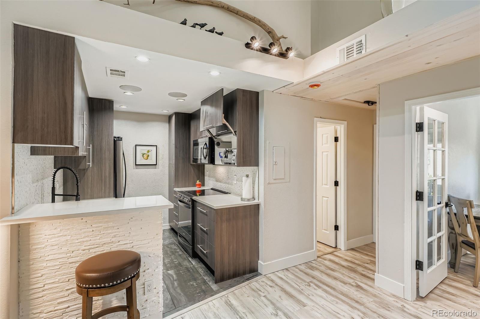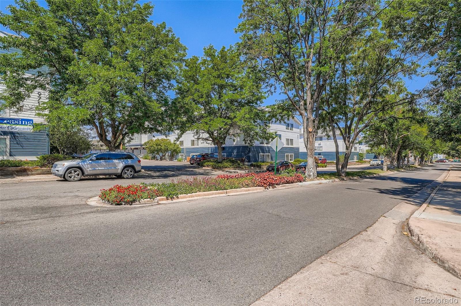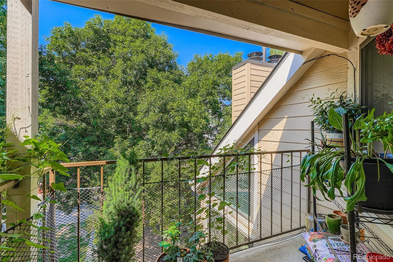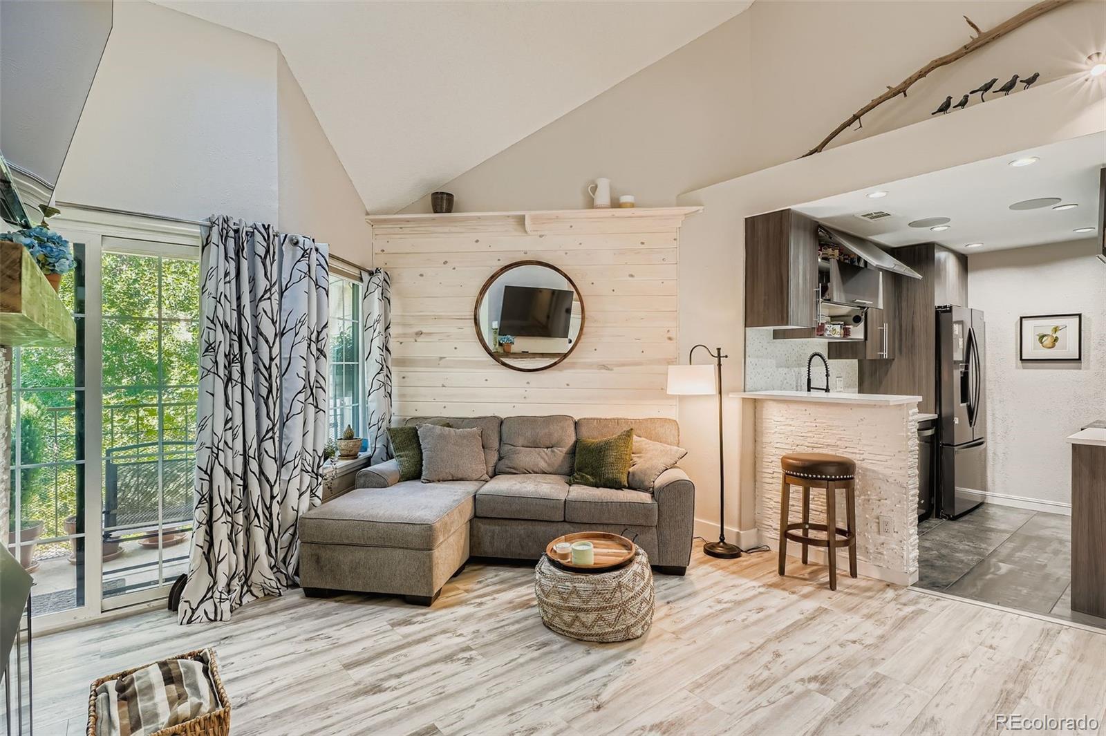 A GLENDALE BEAUTY! BRAND NEW BATHROOM AND NEWER SLEEK KITCHEN! No labor required in this unit, everything here is done for you. You won't want to miss seeing this turnkey tastefully remodeled penthouse condo with around $25K worth of upgrades! This property is ready for you to step in and instantly feel at home. This top floor unit boasts natural light with the vaulted ceiling and new sky light (2023). This unit is spacious and has been customed designed with some excellent features, from the built in shelving, the updated hardware, updated lighting, wall paneling, black out shades, wood burning fireplace, and a loft area with a ton of storage, the fully remodeled bathroom includes new vanity, mirrors, lighting, flooring, Bluetooth speaker and other design features. New flooring throughout, new designer paint throughout, new security/storm door etc. The primary bedroom has a new ceiling fan and the built in shelving provides for that extra bit of organizational need or decor. The secondary bedroom has French doors and can be utilized as a dining room, or a home office as well, you decide. The kitchen has IKEA cabinets which have a ton of storage. This unit comes with a new stackable washer/dryer and a new hot water heater, new roof (2023), newer windows (2018). The location of this complex can't be beat as you are close to commute access, parks, Cherry Creek Trail, Infinity Park, Glendale shops and the new upcoming Four Mile District - 10 acres of entertainment set to open late 2026 or early 2027. This city neighborhood is sure to make you feel at home the minute you step through the front door.