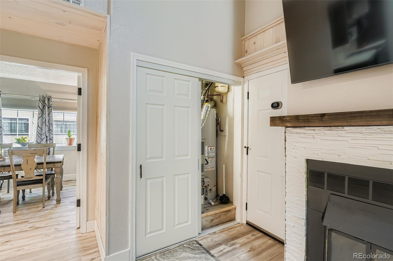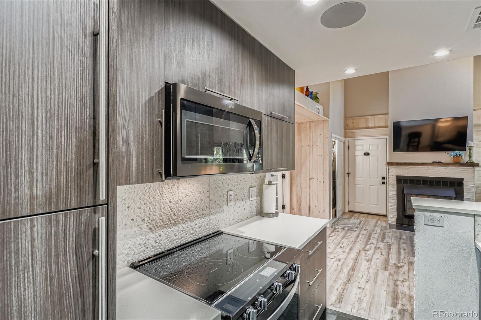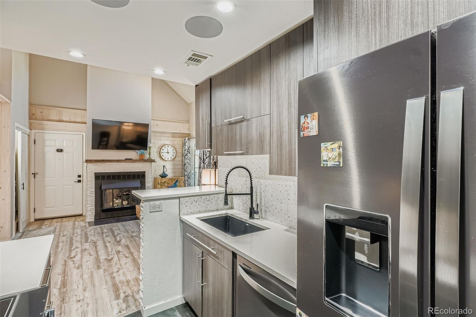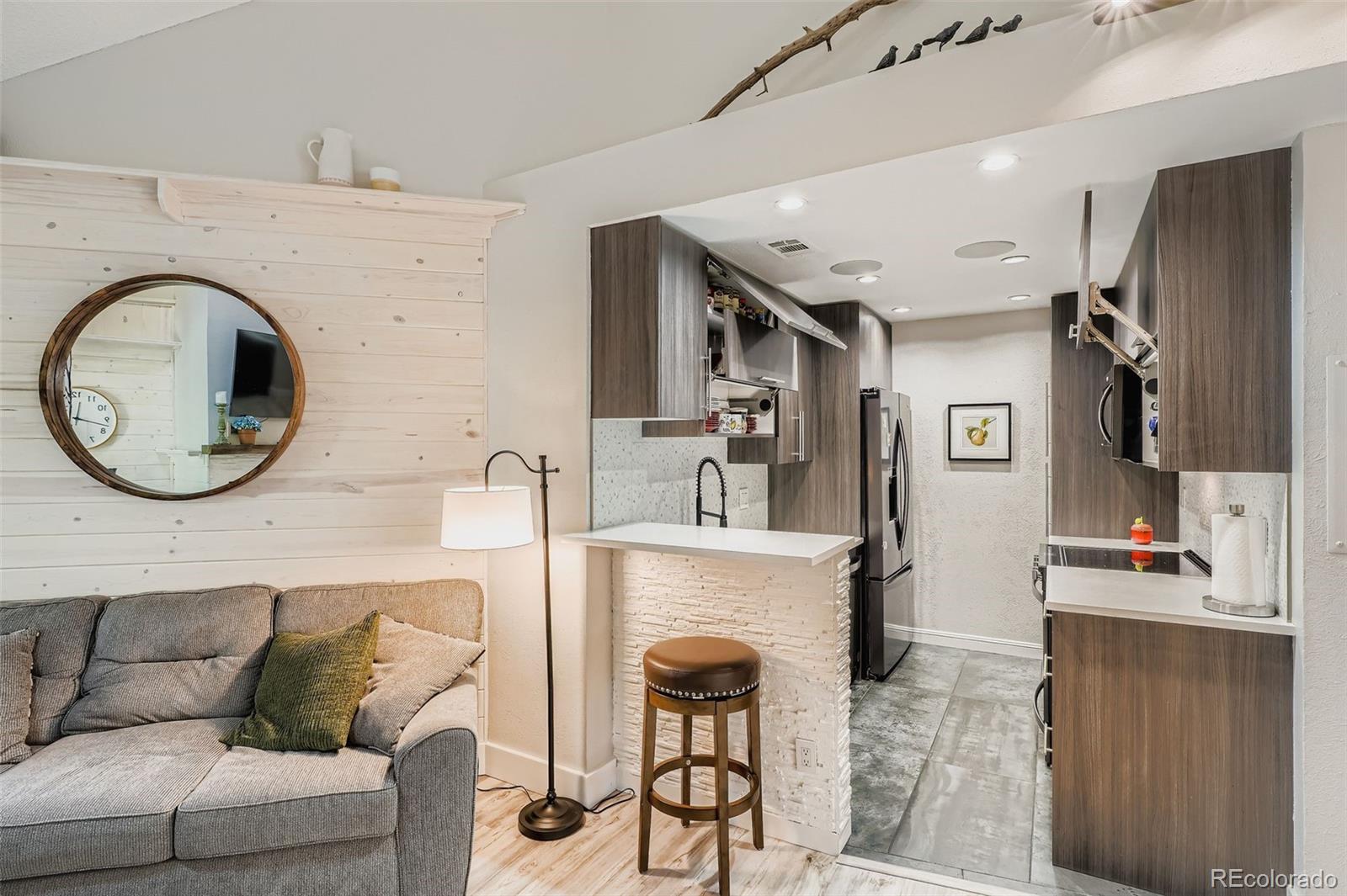 A GLENDALE BEAUTY! BRAND NEW BATHROOM AND NEWER SLEEK KITCHEN! No labor required in this unit, everything here is done for you. You won't want to miss seeing this turnkey tastefully remodeled penthouse condo with around $25K worth of upgrades! This property is ready for you to step in and instantly feel at home. This top floor unit boasts natural light with the vaulted ceiling and new sky light (2023). This unit is spacious and has been customed designed with some excellent features, from the built in shelving, the updated hardware, updated lighting, wall paneling, black out shades, wood burning fireplace, and a loft area with a ton of storage, the fully remodeled bathroom includes new vanity, mirrors, lighting, flooring, Bluetooth speaker and other design features. New flooring throughout, new designer paint throughout, new security/storm door etc. The primary bedroom has a new ceiling fan and the built in shelving provides for that extra bit of organizational need or decor. The secondary bedroom has French doors and can be utilized as a dining room, or a home office as well, you decide. The kitchen has IKEA cabinets which have a ton of storage. This unit comes with a new stackable washer/dryer and a new hot water heater, new roof (2023), newer windows (2018). The location of this complex can't be beat as you are close to commute access, parks, Cherry Creek Trail, Infinity Park, Glendale shops and the new upcoming Four Mile District - 10 acres of entertainment set to open late 2026 or early 2027. This city neighborhood is sure to make you feel at home the minute you step through the front door.