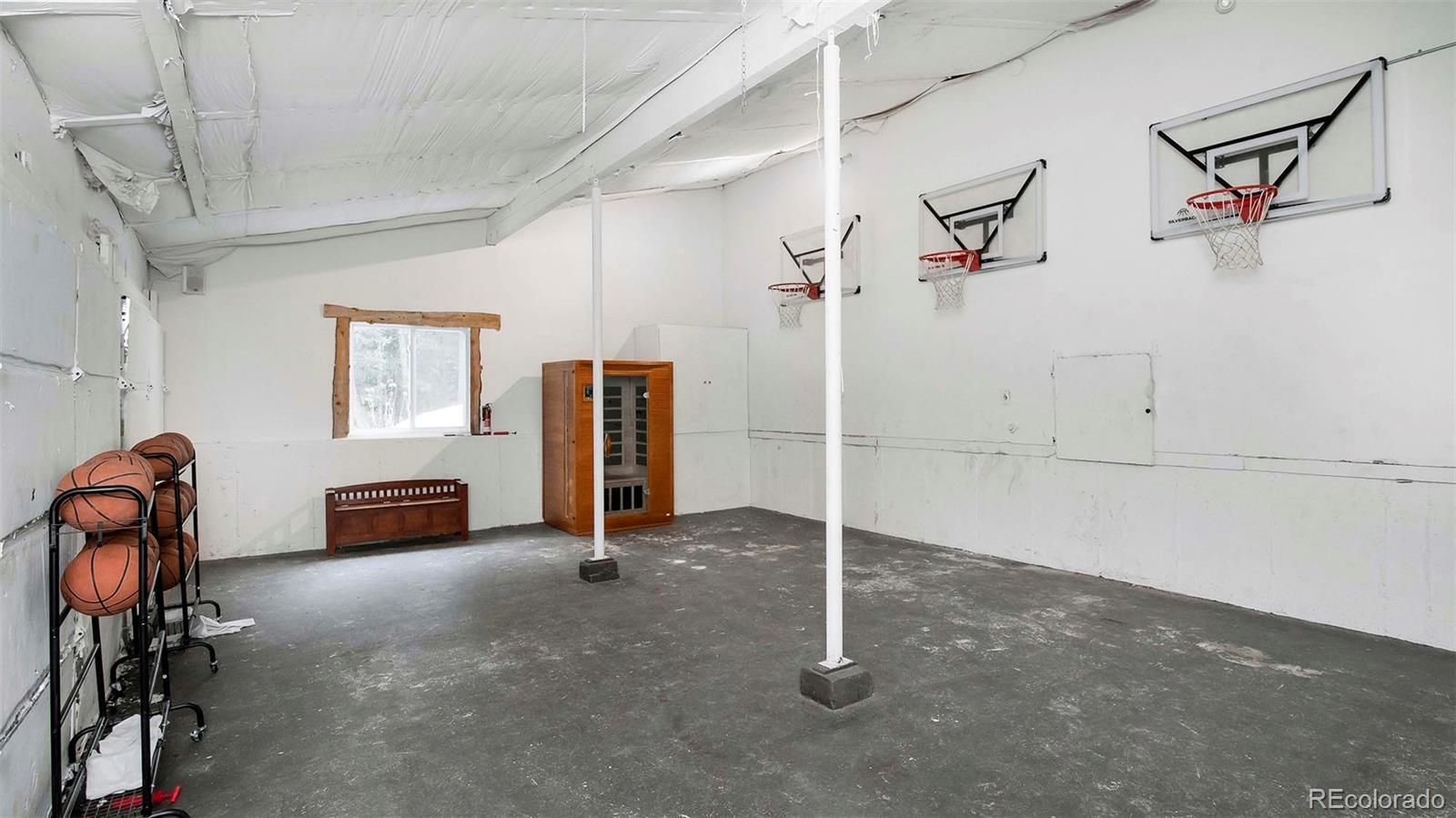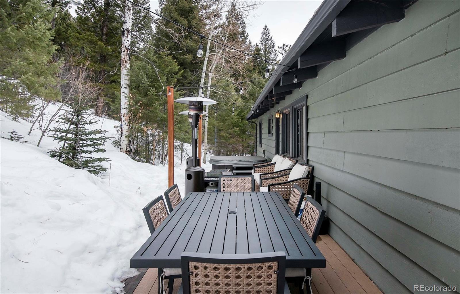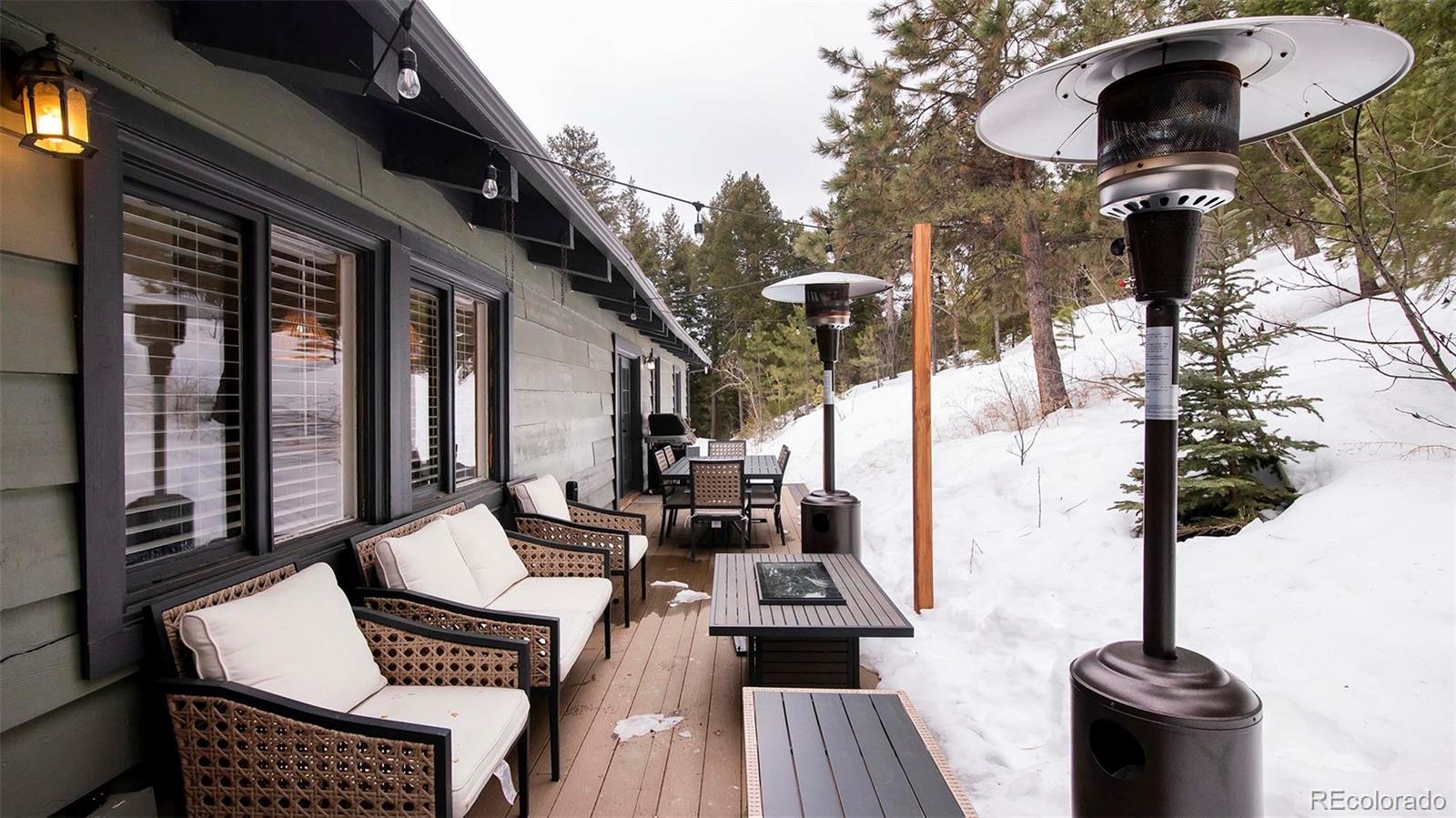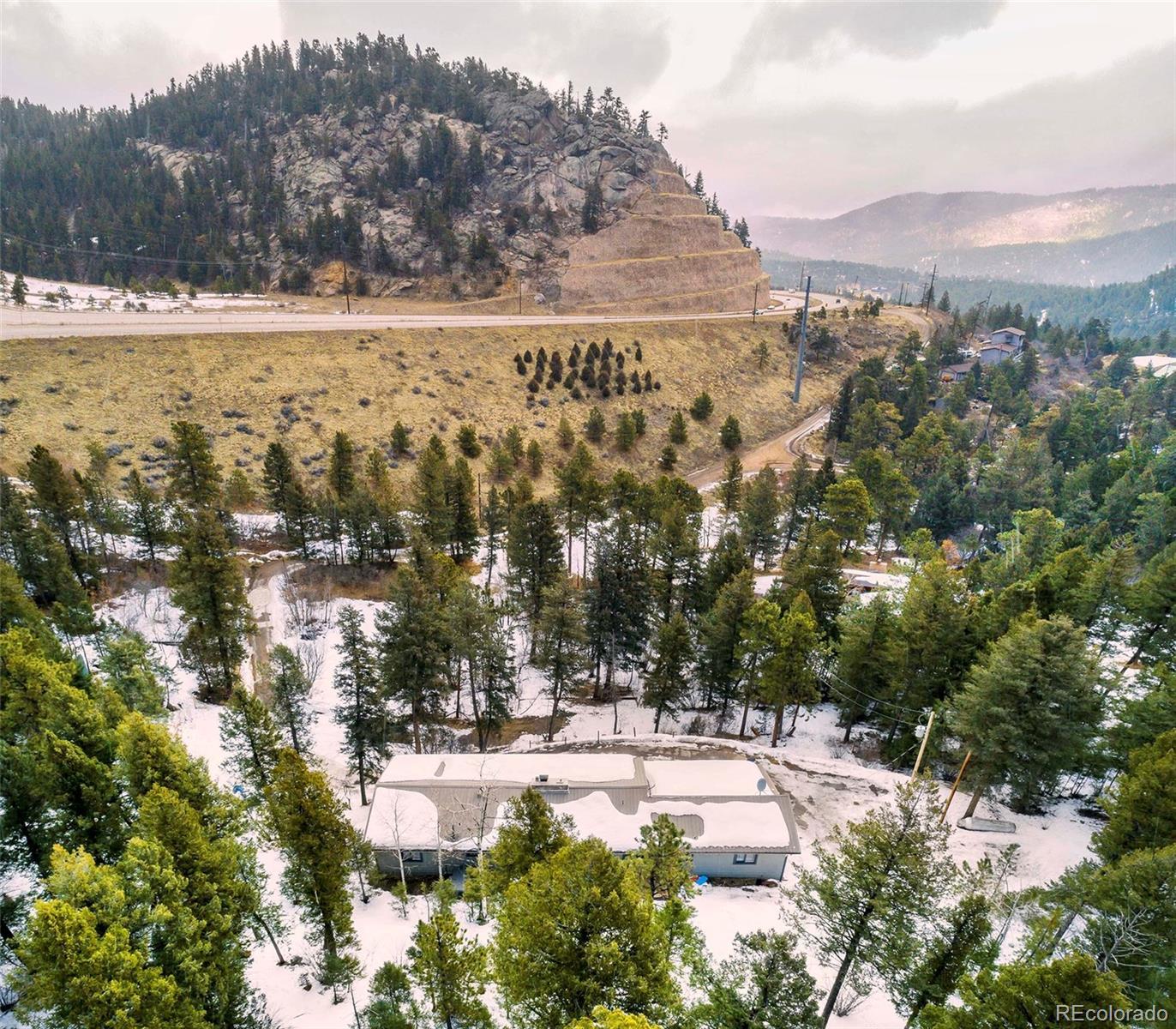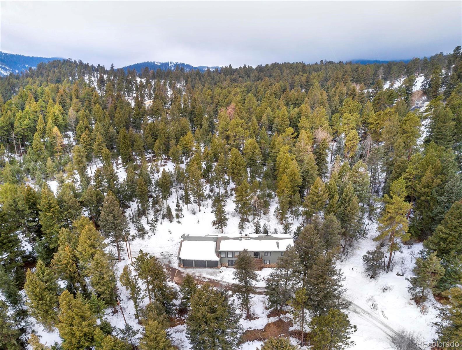 Experience stylish mountain living on 3+ acres just 30 minutes from Denver. Raw edge wood ceilings emanate a woodland atmosphere while a chic double-sided fireplace connects the living space to the formal dining area. Ample space to entertain is found throughout — from a renovated kitchen with high-top seating to an additional dining nook immersed in natural light. Each upper-level bedroom is a brightly lit escape nestled beneath vaulted ceilings and equipped with timeless shared bathrooms. Retreat to the lower level to discover a continuation of the upper-level fireplace, expansive recreation/leisure areas and additional guest spaces. For more entertaining possibilities, wander into the garage — where three full-size basketball hoops and a sauna await. Dining and relaxing al fresco is a breeze on a wide back deck complete with a hot tub and surrounded by a serene forest. An accessible location brings residents closer to both the amenities of the city and the adventure of the mountains.