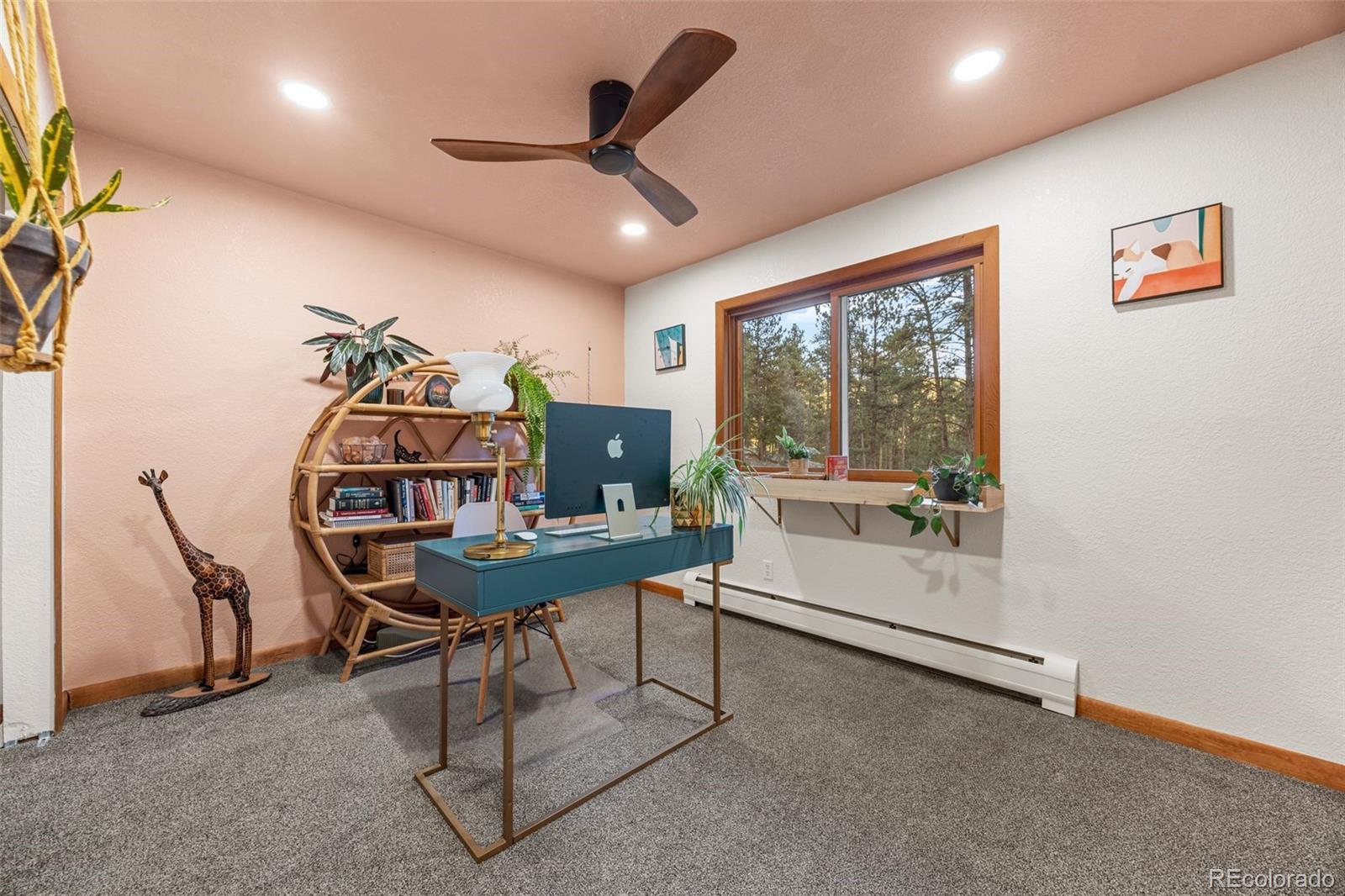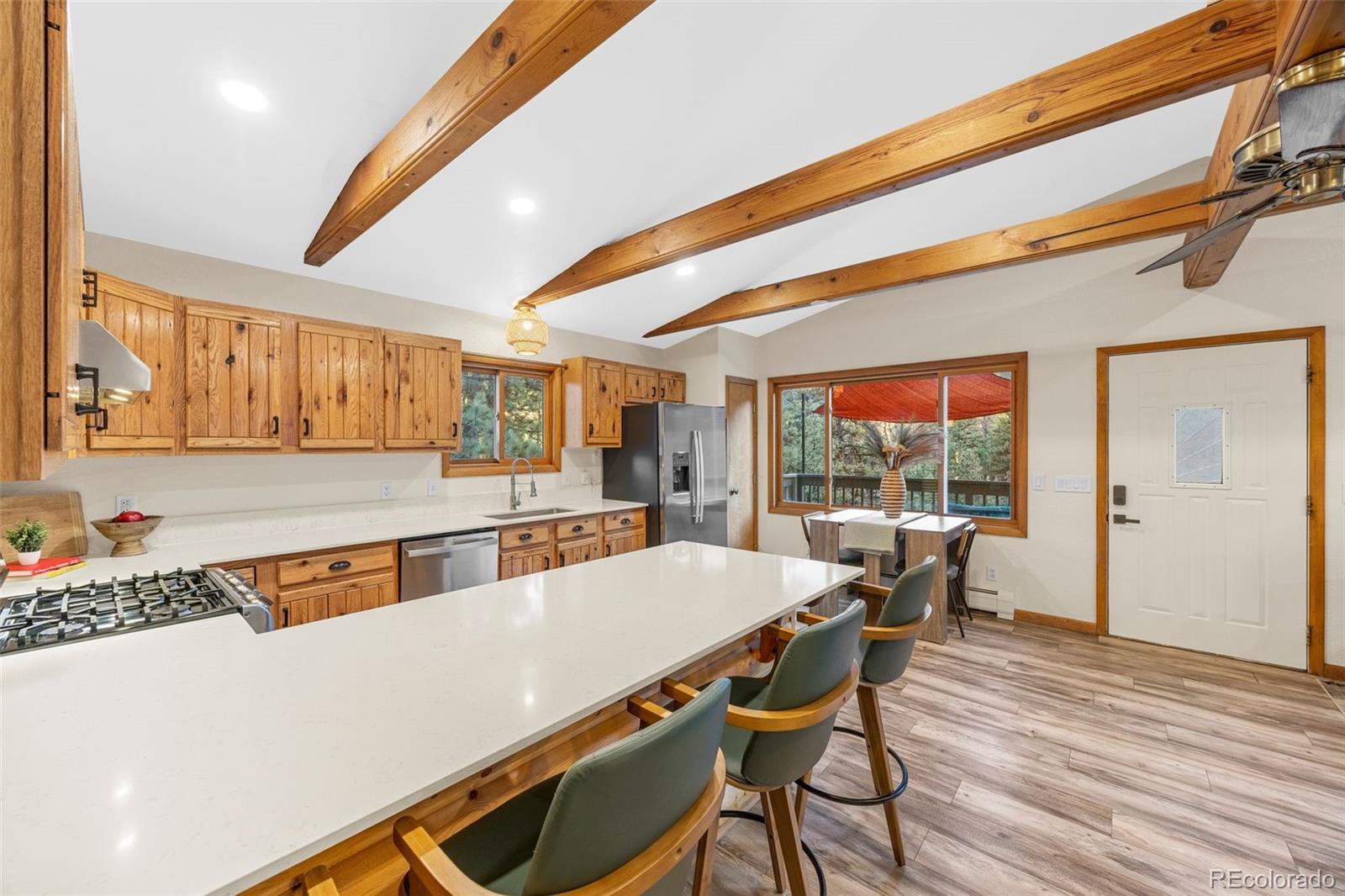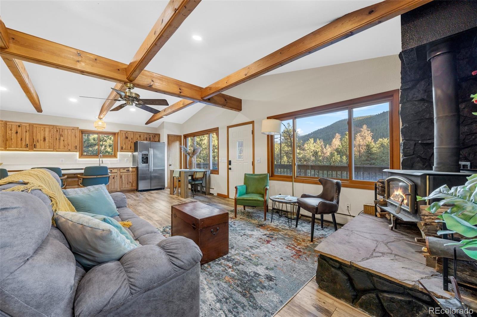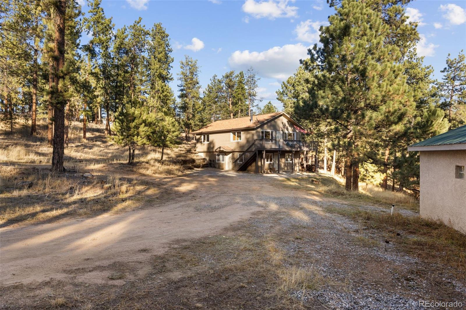 Step into your very own mountain sanctuary on 2.19 acres at 22 Driver Road, bordering the national forest for ultimate privacy and serenity. Just 2 miles from US-285 and around the corner from the charming town of Bailey, Colorado, you’ll enjoy the perfect blend of secluded retreat and easy access to Denver and mountain adventures. No 4-wheel drive needed, the county plows the road and with a school around the corner they stay on top of the snowfall to make mountain living accessible. This beautifully updated 4-bedroom, 2-bath South facing home with walk-out basement delivers authentic mountain living, vaulted ceilings with dramatic wood beams, a cozy wood-burning fireplace, and a brand-new quartz-top kitchen that brings a fresh, elegant vibe without losing rustic charm. Kitchen appliances, flooring, and both bathrooms all remodeled in 2023 as well as an almost brand new boiler for ease of life upon moving in. Starlink has been installed so working from home is never an issue. Outdoors, your private deck overlooks a tranquil panorama of tall pines and the forest beyond, the quiet is unparalleled. For outdoor lovers, you’re spoiled: trails like the Tanglewood Trail and the Rosalie Trail wind through the nearby wilderness, and the scenic Lost Creek Wilderness area is within reach for big-nature outings. Anglers will appreciate nearby access to the scenic North Fork of the South Platte River or head to Kenosha Pass and Wellington Lake close-by. The home has an outbuilding with 1-car garage for storage and an extra basement area underneath the garage that could be converted into an extra workshop or livable space. Whether you’re looking for a primary mountain home or a weekend escape, this property offers the rare trifecta: privacy, nature, and convenience, it truly doesn’t get better than this.