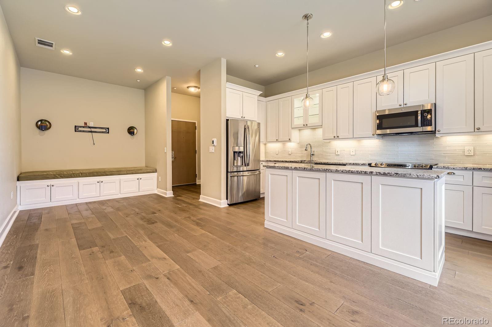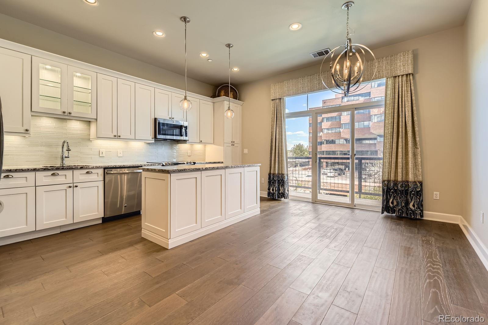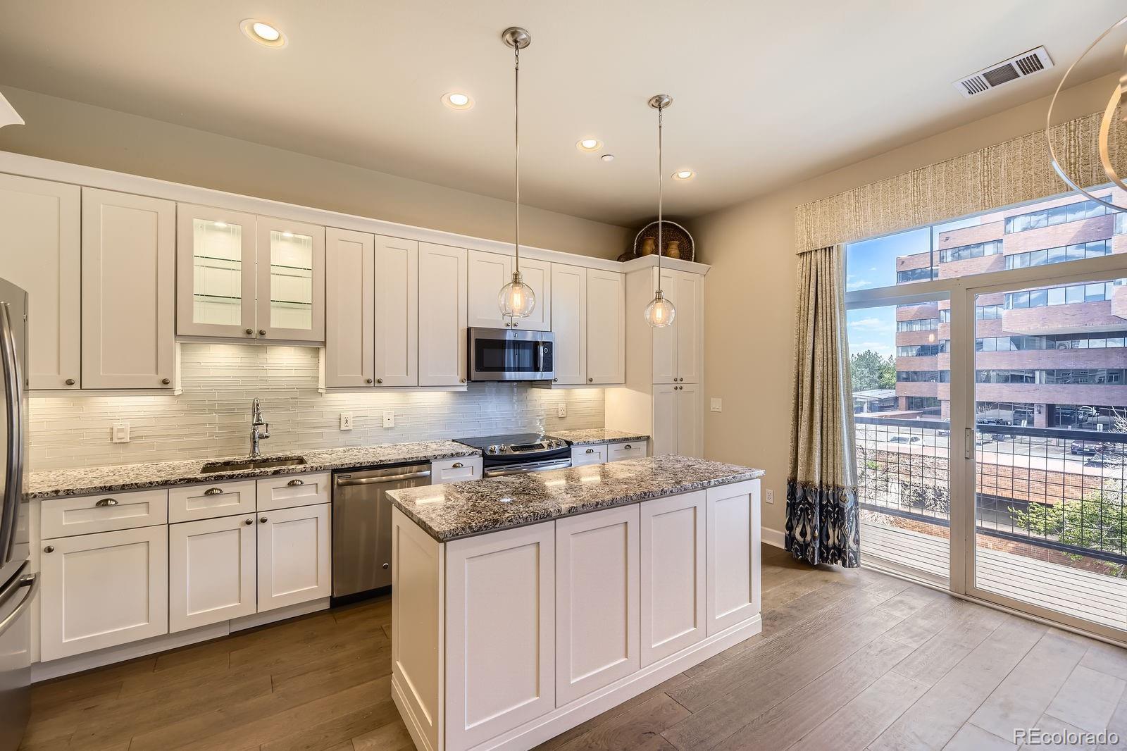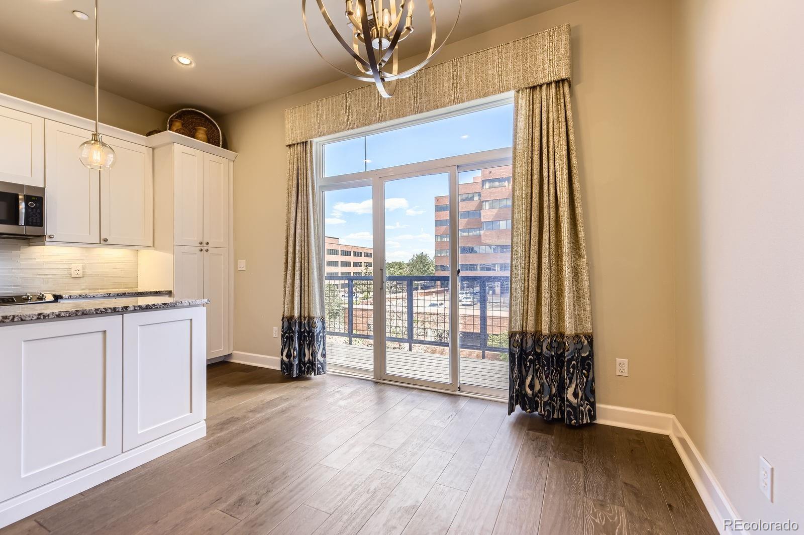 Hurry to this prime DTC location. As you enter this updated top floor condo you will immediately notice the premium finishes. The awesome kitchen remodel includes extended soft close cabinets, granite counters, stainless appliances, island and pantry. The full bathroom has brand new tile installed in the tub/shower and updated granite vanity. There is an entertainment wall in the living area with a built-in feature below that includes additional storage and cushion for reading, relaxing and sleeping. The large glass slider brings in natural light to the open, spacious living area with high volume ceilings. You can exit on to the deck which features a gas grill hook-up. The walk-in utility room features a new HVAC system in 2023, a new water heater in 2020 and a hook-up for a stackable washer/dryer. The secured building with elevator is an alternative to the stairs. Enjoy the clubhouse, fitness area, pool and hot tub. There is a secured heated undergound garage that provides a private parking space with an option to add a storage area if buyer desires. There is additional outdoor parking for guests. Exceptional location with quick access to restaurants, shops, entertainment, I-25, Crescent Park and Goldsmith Gulch Trail. Cherry Creek schools.