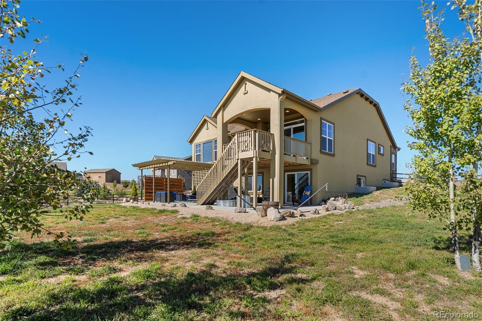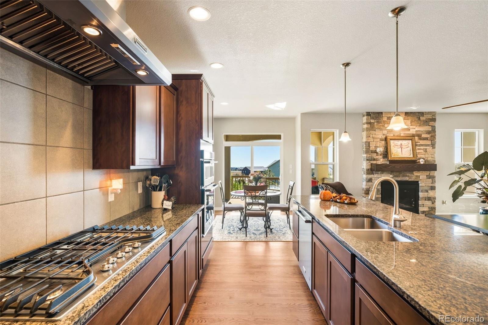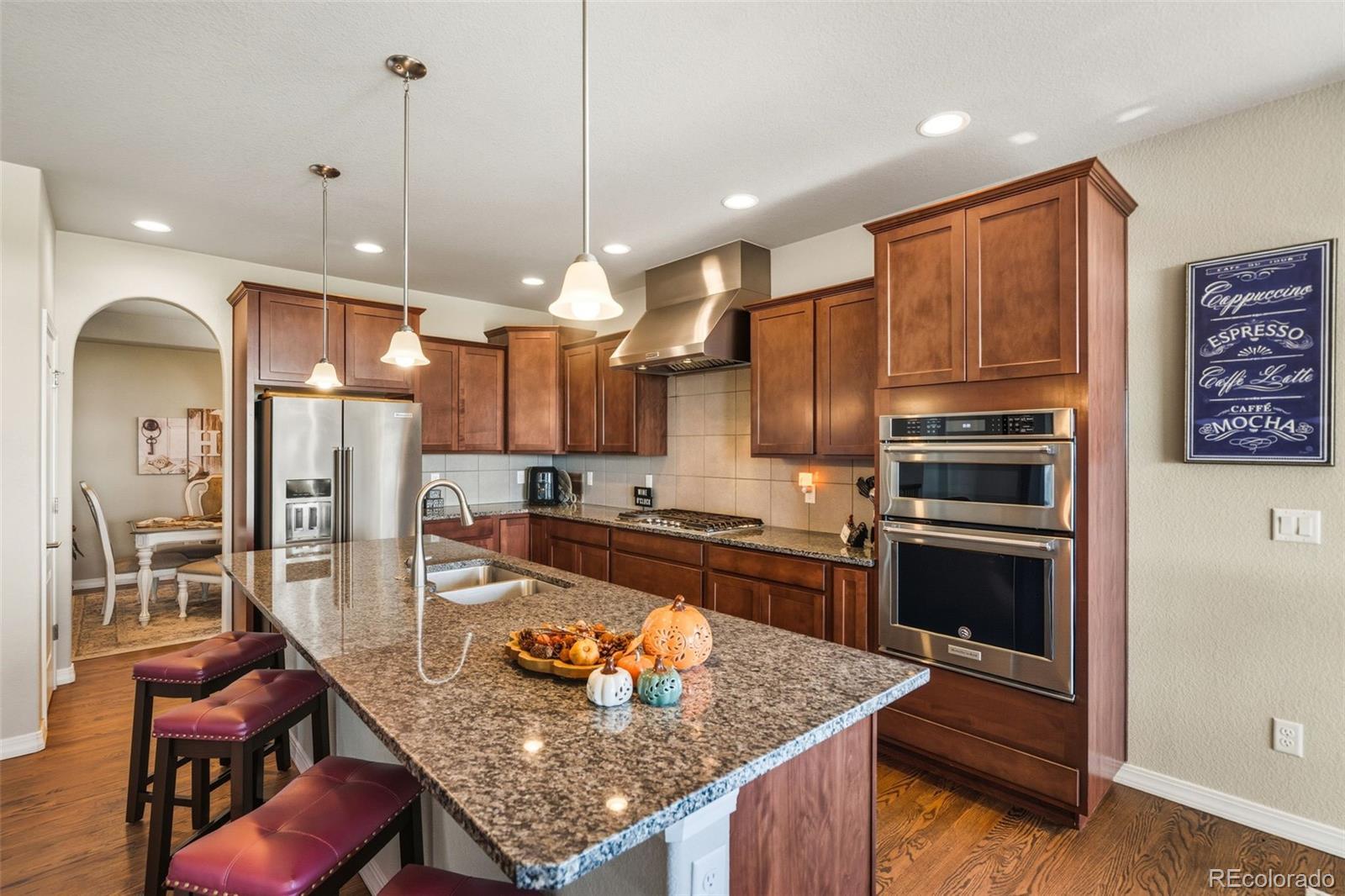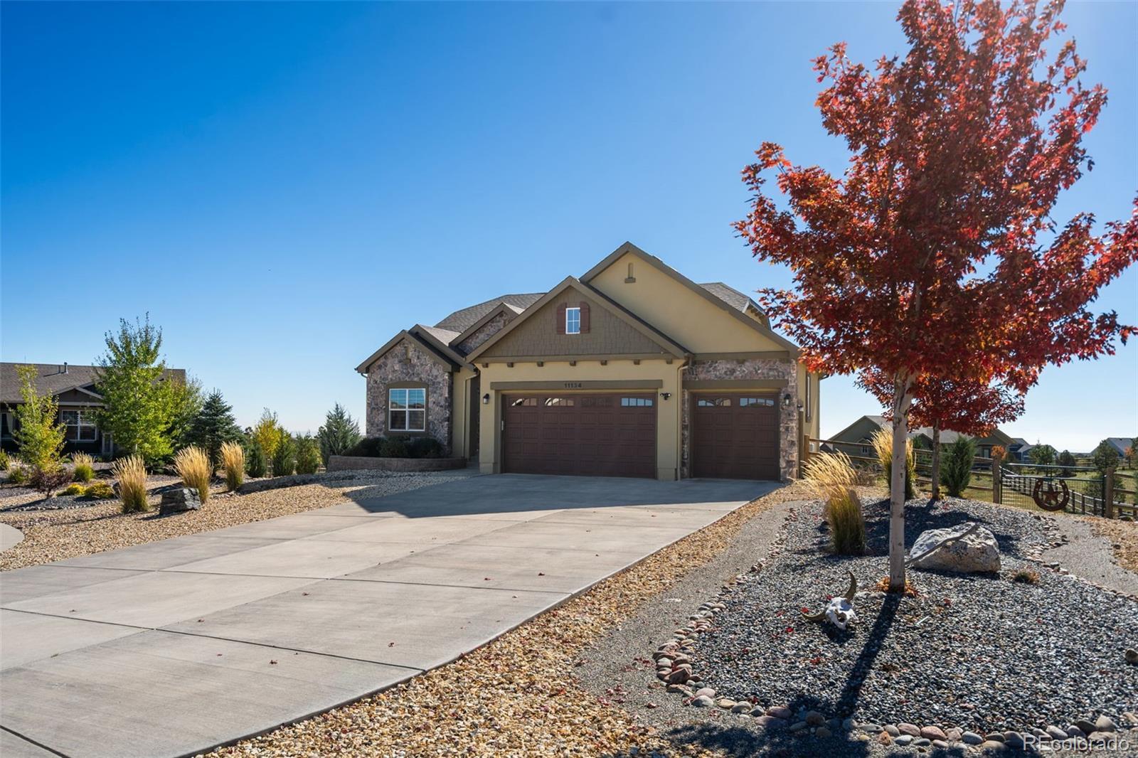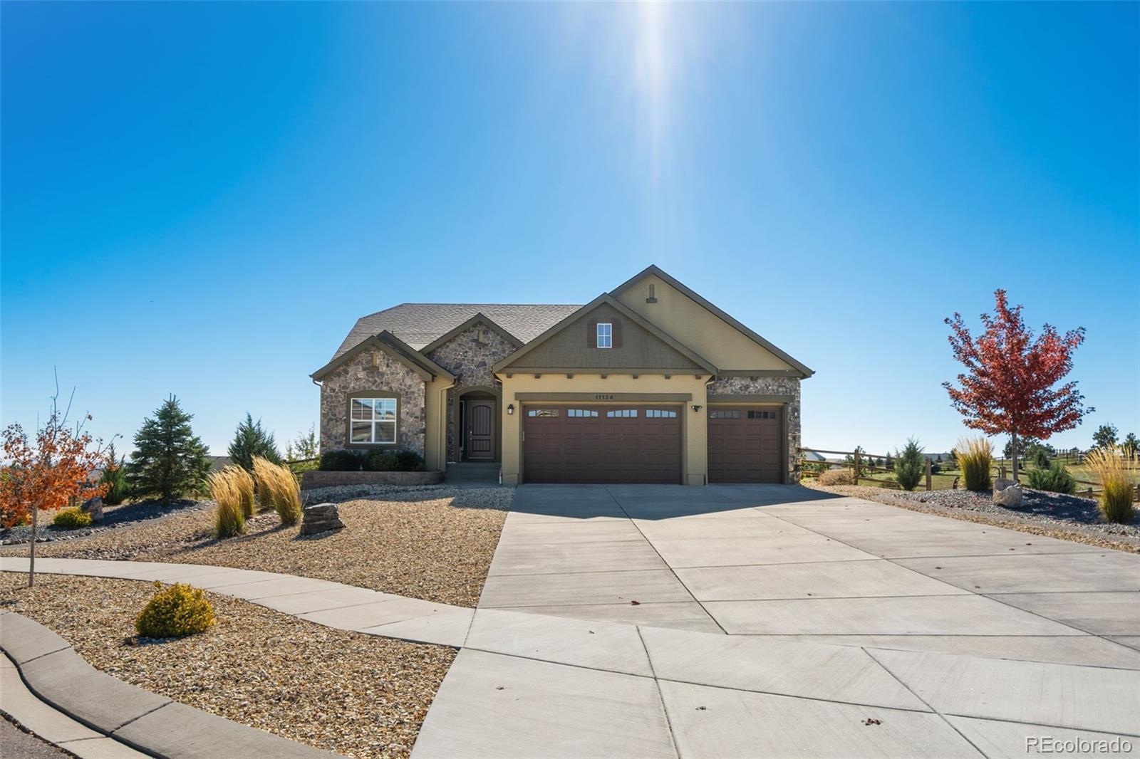 Located on a quiet cul-de-sac in sought-after Meridian Ranch Estates, this immaculate Campbell Homes ranch offers main-level living on a spacious 1-acre lot with beautifully designed landscaping and a finished walk-out basement. Step inside to find gleaming natural hardwood floors, neutral paint tones, custom window coverings, and abundant natural light throughout. The open-concept main level includes a formal dining room, a spacious living room with stacked-stone gas fireplace, and a chef’s kitchen featuring a huge central island with bar seating, rich cherry cabinetry, stainless appliances, gas cooktop with hood, and a wall oven/microwave combo. A sunny breakfast nook opens to the covered back deck, perfect for morning coffee or evening relaxation. The primary suite features a 5-piece bath and walk-in closet, with two additional main-level bedrooms, a full bath, and laundry conveniently located nearby. The finished walk-out basement adds tremendous versatility with a large rec room, wet bar, cozy wine nook, two additional bedrooms, and a full bath making this space ideal for guests or multi-generational living. Outside, the backyard is an oasis with mature trees, decorative rock, river rock borders, a covered deck, and a large patio with pergola, perfect for entertaining or enjoying Colorado sunsets. Residents of Meridian Ranch enjoy miles of walking trails, neighborhood parks, indoor and outdoor pools, a rec center with fitness facilities, and community events, all within minutes of shopping, dining, and highly rated schools. Meticulously maintained and move-in ready, this home perfectly blends privacy, comfort, and convenience.