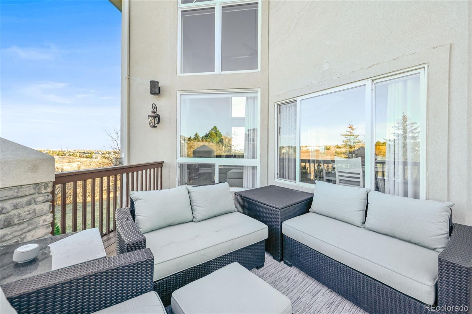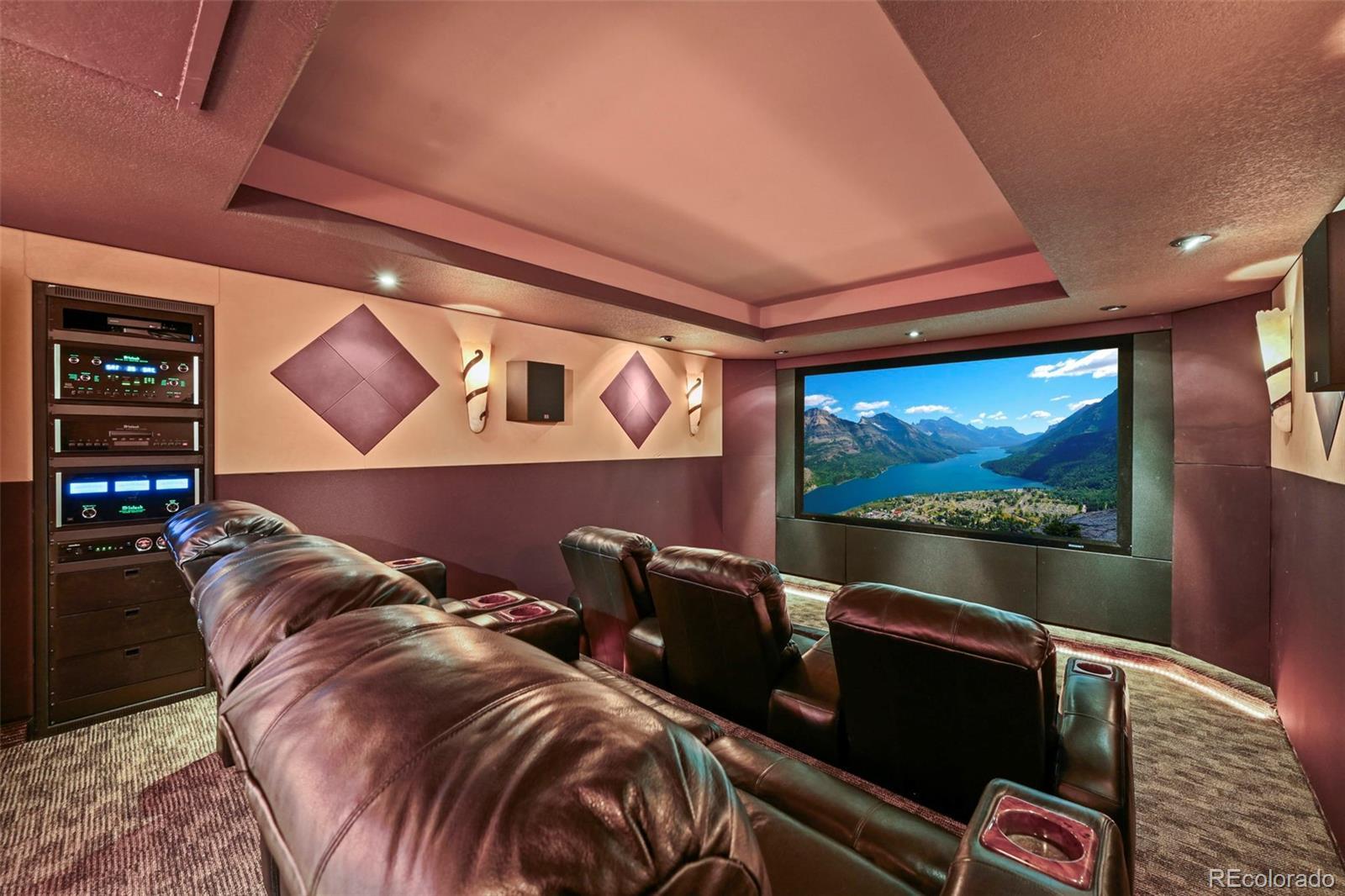 Nestled within the coveted enclave of Diamond Ridge Estates, this gorgeous custom home sits on a 1.38-acre lot backing to more than 64 acres of open space, offering both privacy and breathtaking views. Step inside to a grand two-story foyer with a soaring 19-foot ceiling and luxury vinyl flooring throughout the main level. Just off the entry, a spacious office with French doors provides the perfect work-from-home setting, while the formal dining room impresses with its tray ceiling and convenient dry bar. The formal living room is equally elegant, featuring a tray ceiling, tiled gas fireplace, and a large window framing serene open-space views. The gourmet kitchen is a chef’s dream, boasting quartz countertops, a center island with breakfast bar, stainless steel appliances along with a large pantry and sunny dining nook that opens to a private deck. The adjoining family room serves as the heart of the home, where a dramatic 20-foot ceiling, cozy gas fireplace, and walls of windows create a bright and inviting space with direct access to an expansive deck, ideal for entertaining or simply enjoying the outdoors. Upstairs, the luxurious primary suite offers a retreat-like atmosphere with a tray ceiling, bow window overlooking open space, a massive walk-in closet, and a five-piece bath featuring travertine floors, a dual-head walk-in shower, jetted tub, and dual sinks. The finished walkout basement expands the living space with a large recreation room, private bedroom, and full bath. Wine enthusiasts will appreciate the custom wine room with wet bar, while movie lovers will be drawn to the state-of-the-art theatre room with 110-inch screen, as featured in Colorado Homes Magazine. The basement also opens to a covered patio. Completing the home is a fully finished, heated 4-car oversized garage with epoxy flooring and built-in cabinets. The community amenities include a pool, tennis and pickleball courts, and scenic neighborhood trails.