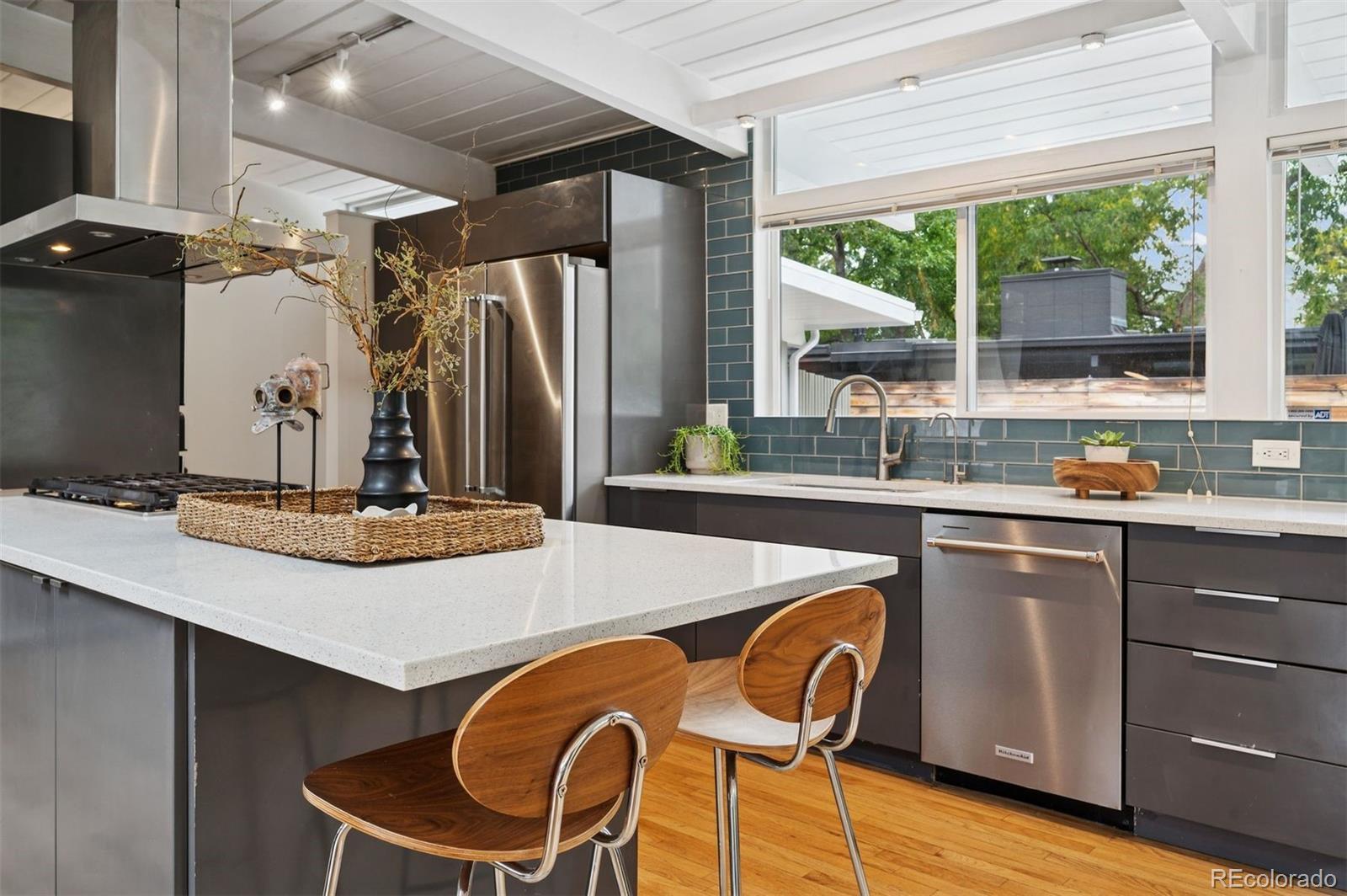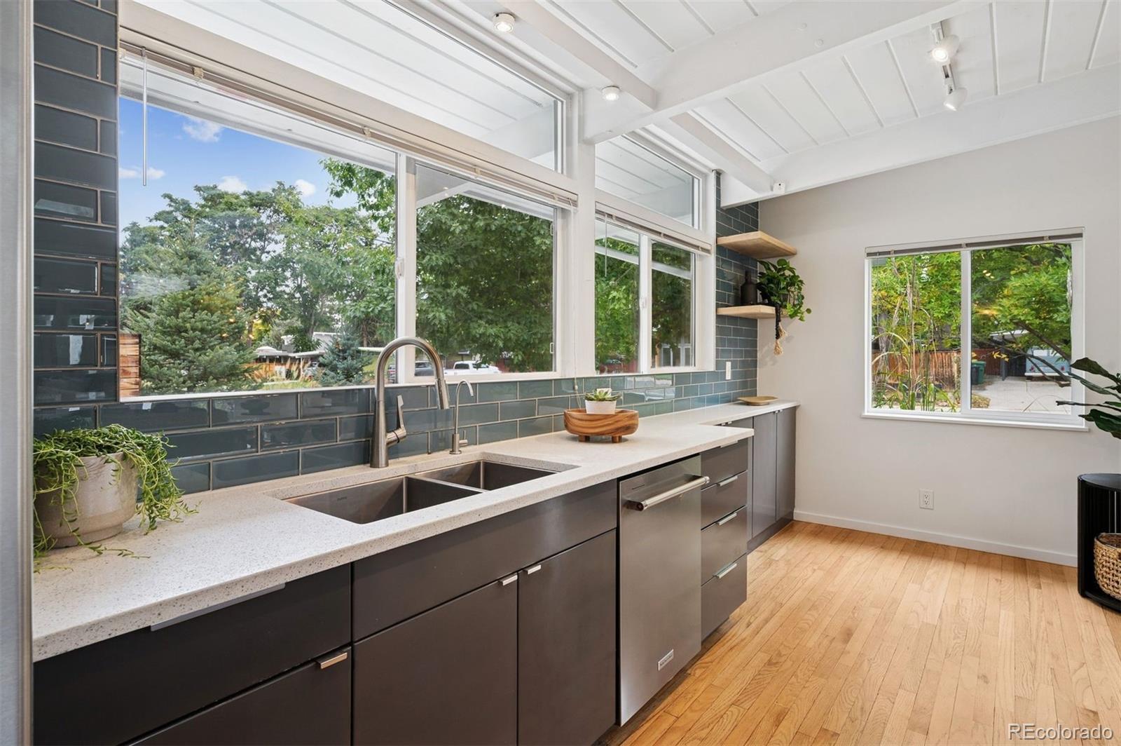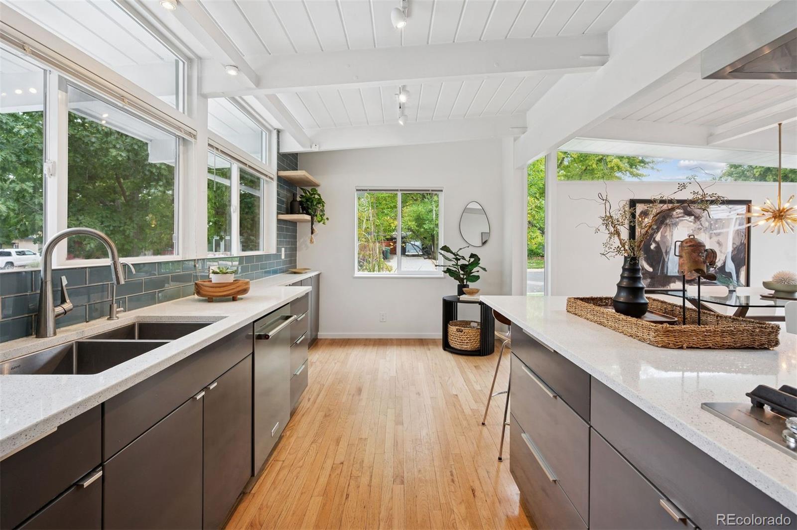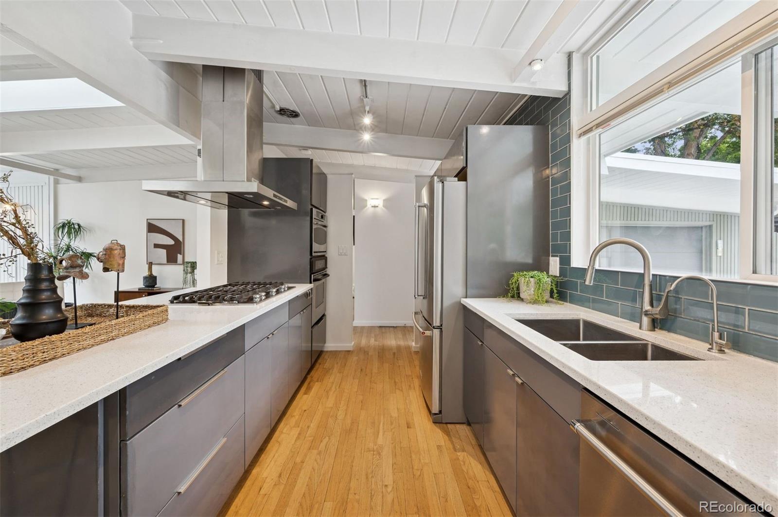 Welcome to the heart of Krisana Park, Denver's Premiere Mid-Mod enclave. Located on a larger lot directly in the epicenter of this coveted neighborhood, 1355 S Elm St boasts all the original Eichler-inspired charm, with the added overlay of tasteful updating for both style and livability. The requisite clerestory windows, pristine mid-mod lines, streaming light and classic form all stand true, while the oversized one car garage, multiple skylights, full kitchen/bath updates, rare expanded lanai, modern landscaping, new fixtures and finishes all optimize the experience. Garden beds and multiple outdoor living spaces complete the meld of indoor and outdoor living and entertaining. The last full remodel was down to the studs with added insulation, all new windows, new kitchen/baths, skylights and landscaping. Brand new fresh paint inside and out, radon mitigation, upgraded electrical ready for EV charging, Nest thermostat, Racchio sprinklers, reverse osmosis water filtration system, high-end luxury hot tub, additional professional landscaping/hardscaping, new driveway, and newer systems/appliances throughout. This prime SE Denver location is close to parks, trails, shopping, restaurants, and transit with quick access to I-25 to downtown and the mountains. Winner of the Mayor's Design Award, Krisana Park is truly a special place to call home.