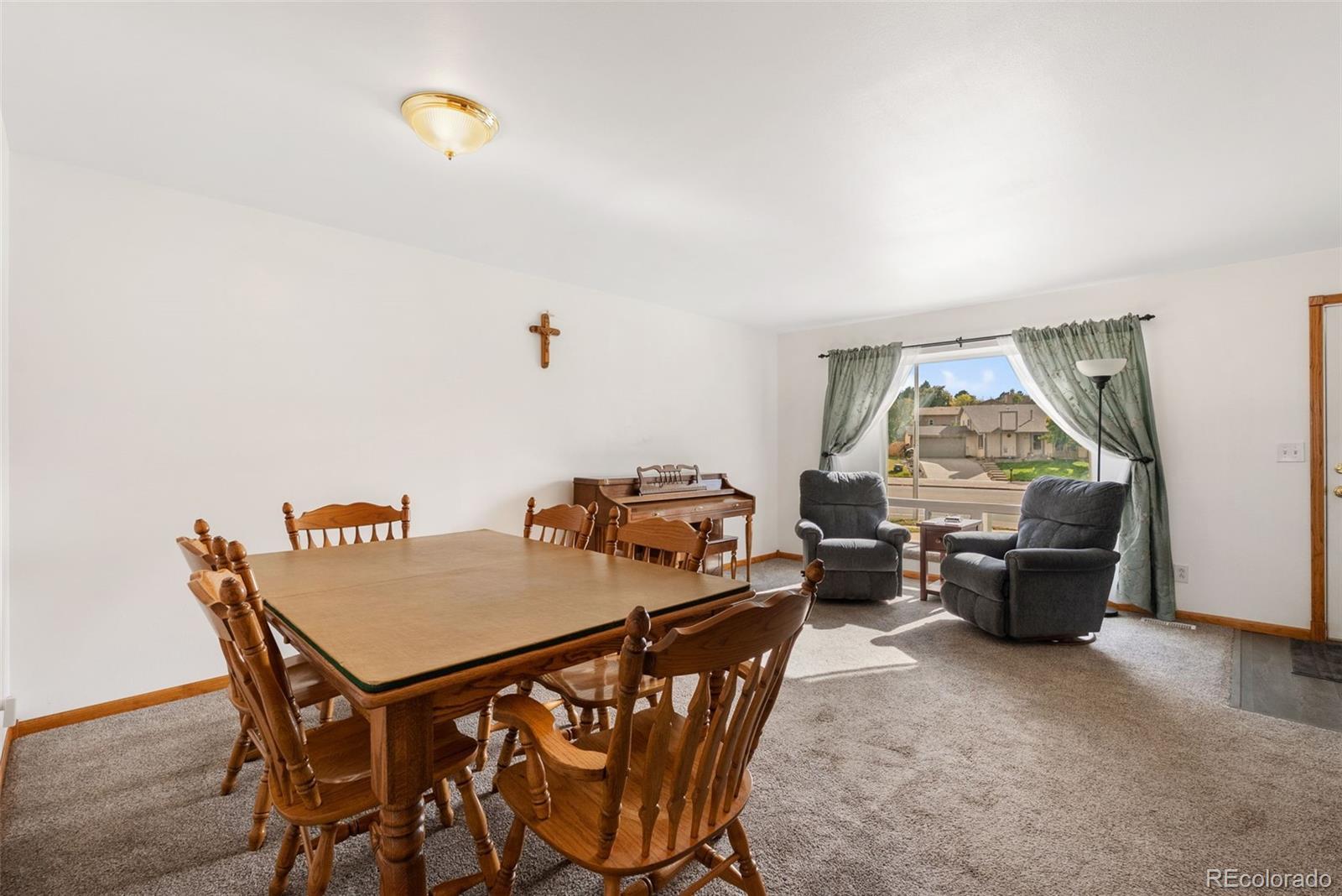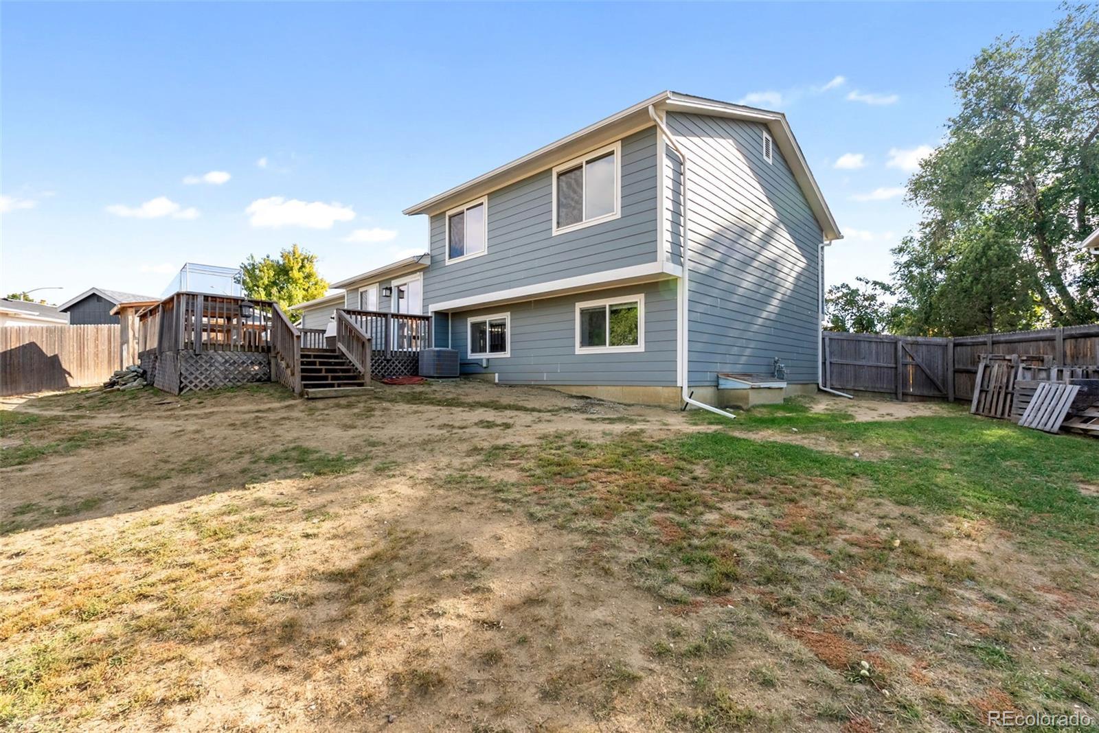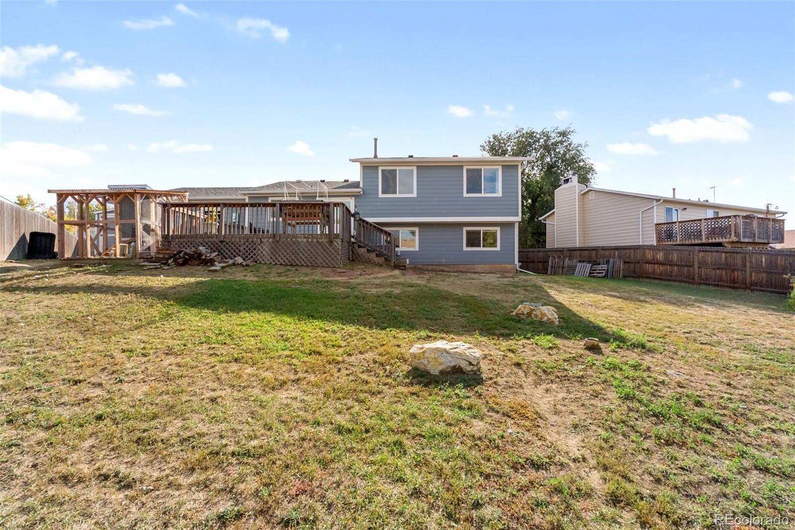 Welcome to a 4-bedroom, 2-bath tri-level home in the heart of Colorado Springs! Offering over 2,200 total square feet on a spacious 0.24-acre lot, this home combines classic comfort with thoughtful updates and a layout designed for easy living. Step inside to find a bright, open living room with added dining area that continues to the kitchen featuring luxury vinyl plank flooring, dark marble-look laminate countertops, a glass-top electric range, and a double stainless sink that overlooks the backyard. The kitchen’s sliding glass door walkout opens to a 17’x17’ wood deck, perfect for entertaining or enjoying peaceful mornings with mountain views. Upstairs, the primary bedroom boasts two large front-facing windows that fill the room with natural light, an included Liberty safe and an adjoining bathroom with a free-standing shower. To complete the upper level are two other carpeted bedrooms with windows overlooking the backyard and a full-sized bathroom. The lower-level family room offers a spacious and versatile area with garden-level windows, creating a bright space for relaxing or entertaining. Outside, the property truly shines — the fully fenced backyard includes raised garden beds, a storage shed, and a custom-built chicken coop that’s as functional as it is impressive, featuring its own solar power system, automatic feeder, and self-watering setup. The front yard is beautifully landscaped with white split rail fencing and a driveway that connects to a convenient pull-off road parallel to Dublin Blvd. With its fiber cement siding, brick façade, and Class IV hail-resistant roof (2023), this home offers durability and lasting curb appeal. Located just under a mile West of Cottonwood Creek Park, excellent District 11 schools, and minutes from both I-25 and Powers Blvd, this home offers the perfect blend of comfort, character, and convenience.