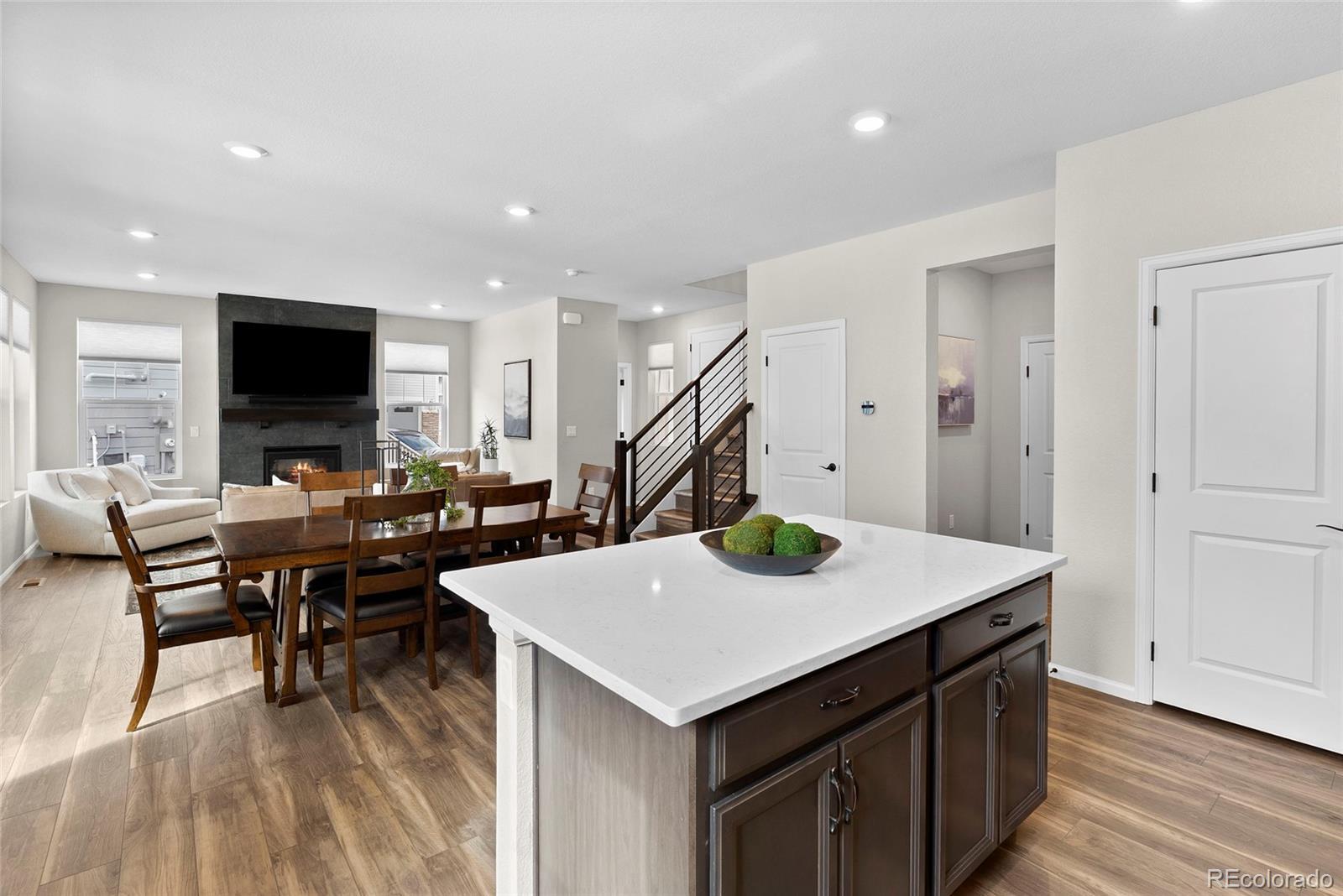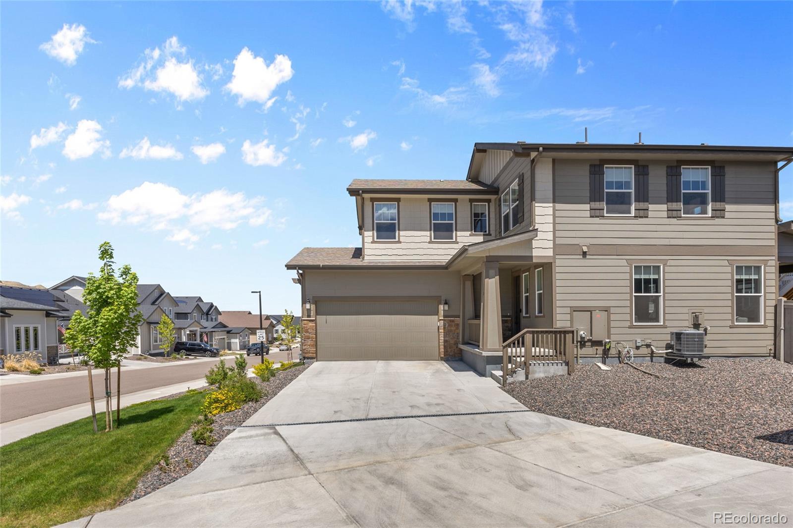 This pristine modern two-story home offers nearly 2,100 sq ft of open-concept living with high-end finishes throughout. The main level showcases durable wide-plank luxury vinyl flooring, creating a seamless flow into the gourmet kitchen—perfect for entertaining. Highlights include an island, sleek Quartz countertops, upgraded cabinetry, and premium KitchenAid stainless steel appliances featuring a 5-burner gas cooktop, hood, dual ovens with convection/microwave, dishwasher, and refrigerator. A spacious dining area and oversized pantry add both style and function. The great room is anchored by a striking gas log fireplace with floor-to-ceiling modern tile. The main floor also includes a laundry/mudroom, powder bath, and exceptional storage with an under-stair closet, and spacious crawl space. Upstairs, a versatile loft offers ideal space for a home office, gym, or playroom. The primary suite is a private retreat with a walk-in closet and beautiful spa-inspired en-suite featuring dual Quartz vanities, upgraded tile, and an oversized shower with bench. Two additional bedrooms share a stylish full bath with Quartz countertops. Additional features include a spacious two-car garage with overhead storage, central A/C, added water softener, and an amazing low-maintenance covered deck. Located in The Meadows, just minutes from the Phillip S. Miller Park & Rec Center and park, with access to The Meadows pools, parks, trails, and tennis courts nearby!