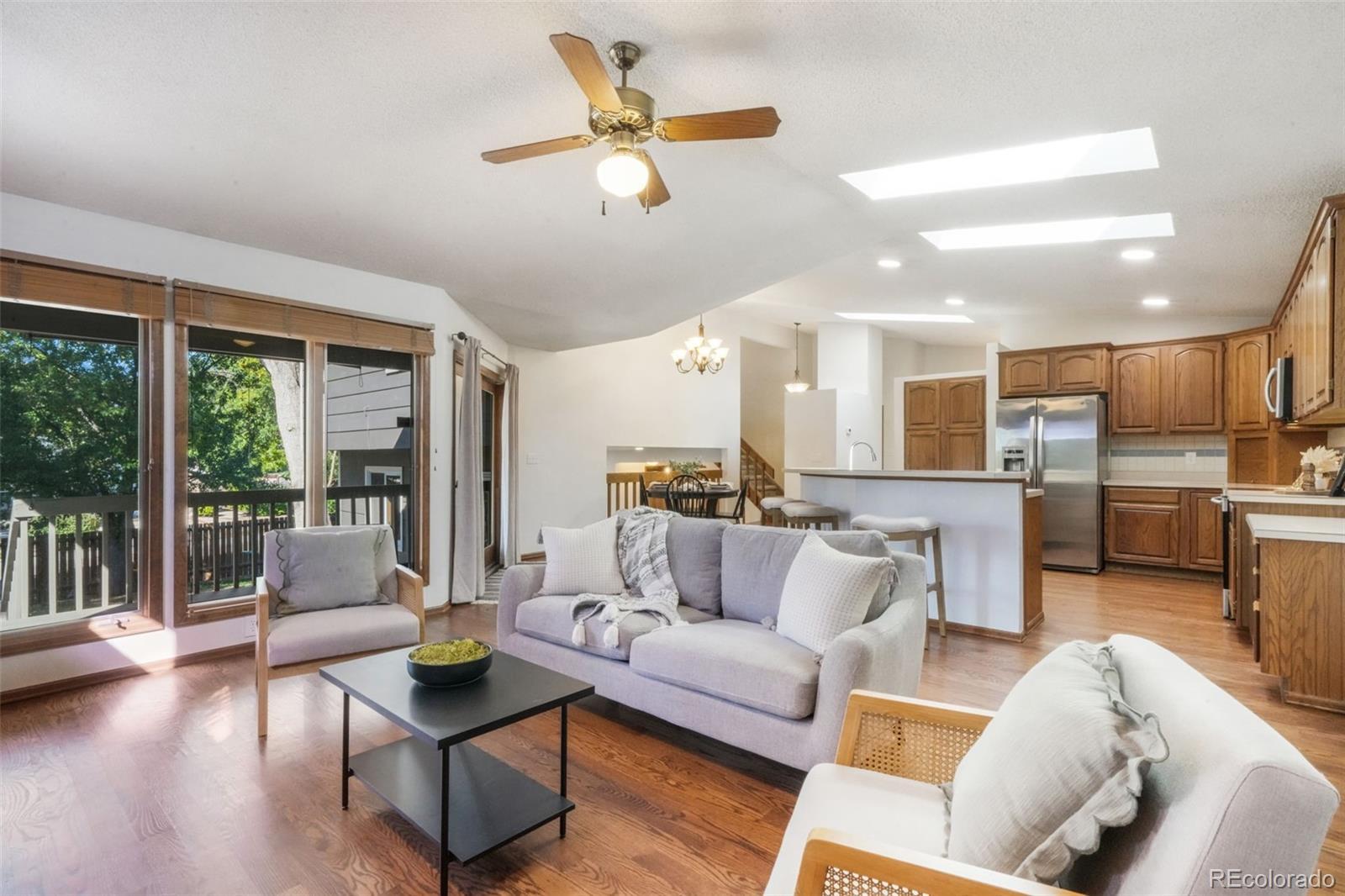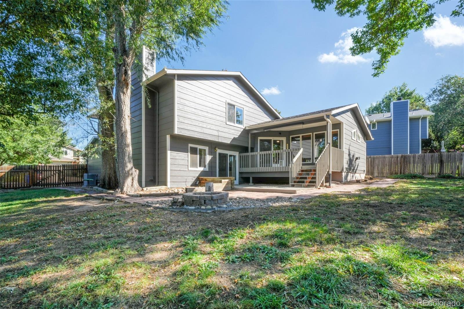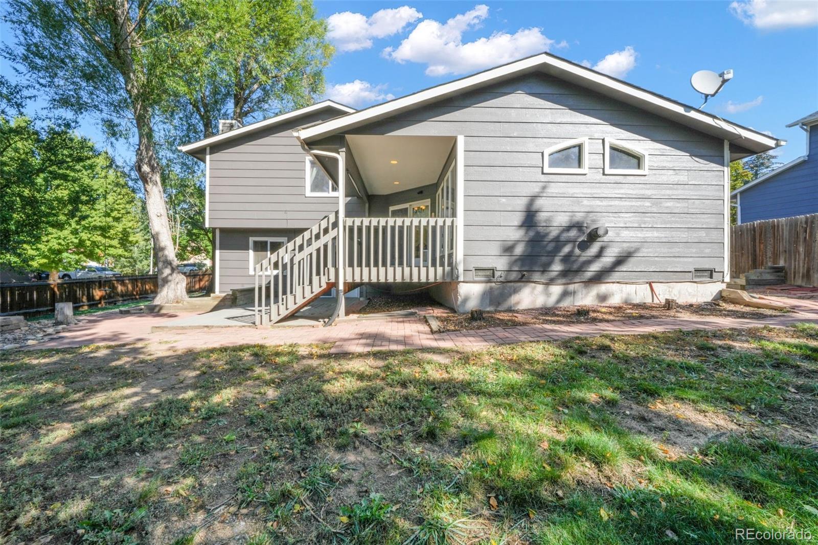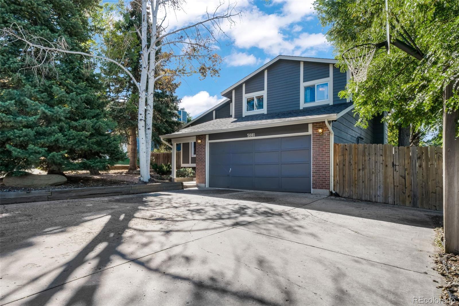 Welcome to this beautiful 4-bedroom, 3-bath tri-level home with a basement in the highly sought-after Old Farm neighborhood. Situated on a large corner lot in a cul-de-sac, this property features mature trees, a fenced backyard, and plenty of space to enjoy inside and out. Step inside to soaring vaulted ceilings, wood flooring, and a bright dining room that flows into the open-concept kitchen. The kitchen includes a large center island, stainless steel appliances, abundant cabinetry, a farm sink, and skylights that provide abundant natural light. The attached eating nook and formal living room create an ideal gathering space, with the formal living room offering a gas fireplace and access to the back deck. Upstairs, the spacious primary suite features a barn door entry to the attached bath, with large walk-in closet, and three-quarter shower. Two additional bedrooms and a full bath complete the upper level. On the lower level, enjoy a large family room with a beautiful brick-surround gas fireplace with built-in wood shelving, backyard access through the sliding door and a laundry room/bathroom combo with a shower. The basement includes a large sitting room, mechanical room, storage closet, oversized 5 ft crawlspace for storage, and another bedroom. The fenced backyard is a retreat with a covered deck, stone fireplace, tree swing, and mature landscaping. Additional highlights include a two-car garage, newer furnace and A/C (2021), upgraded electrical panel, covered gutters, space for RV parking, and winter views of Pikes Peak. Conveniently located near the Powers Corridor with easy access to shopping, restaurants, schools, and medical facilities. Location, updates, and charm—this Old Farm home has it