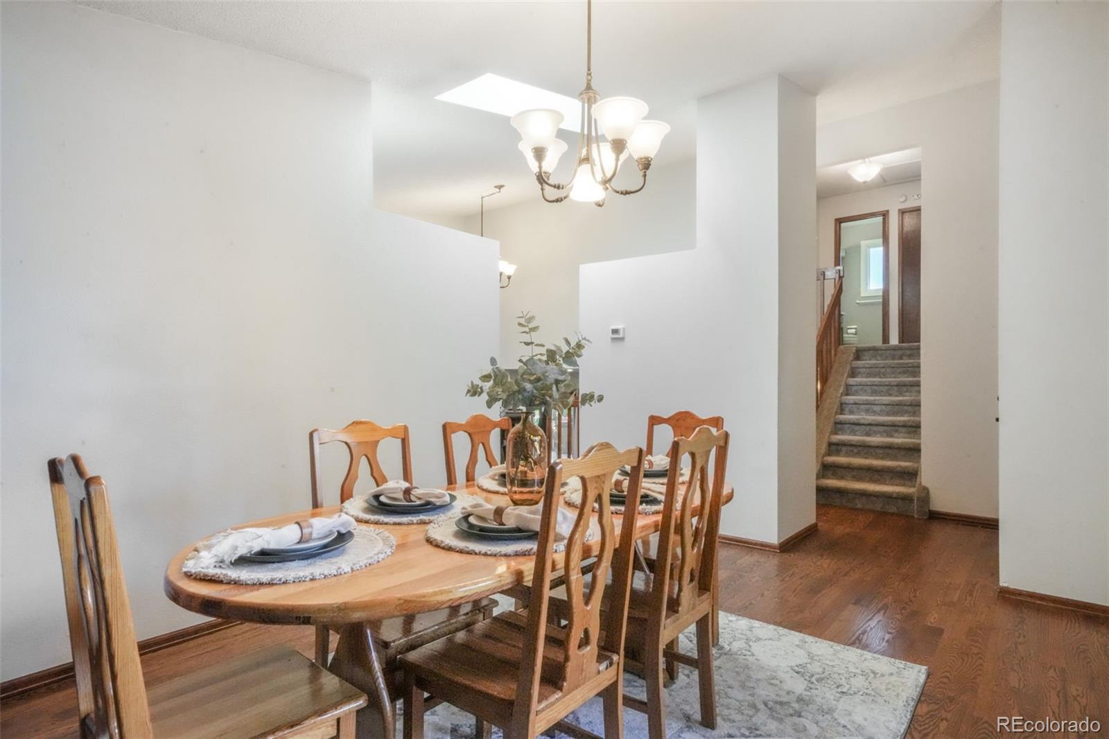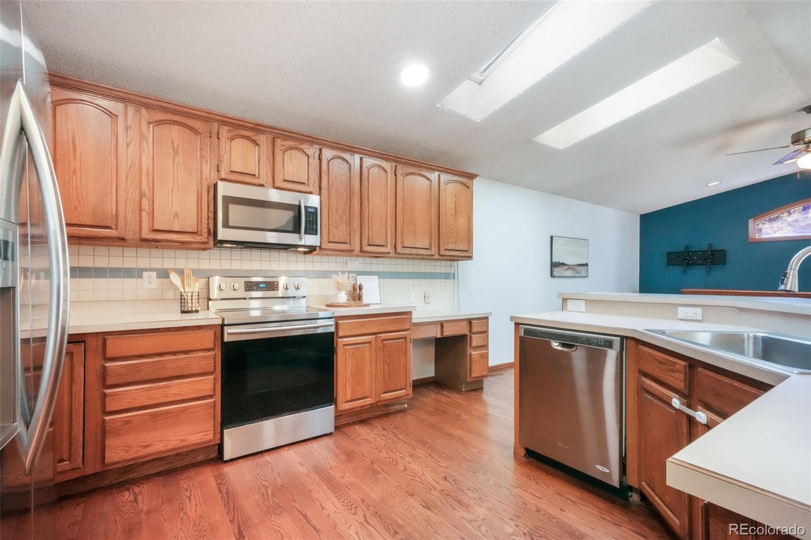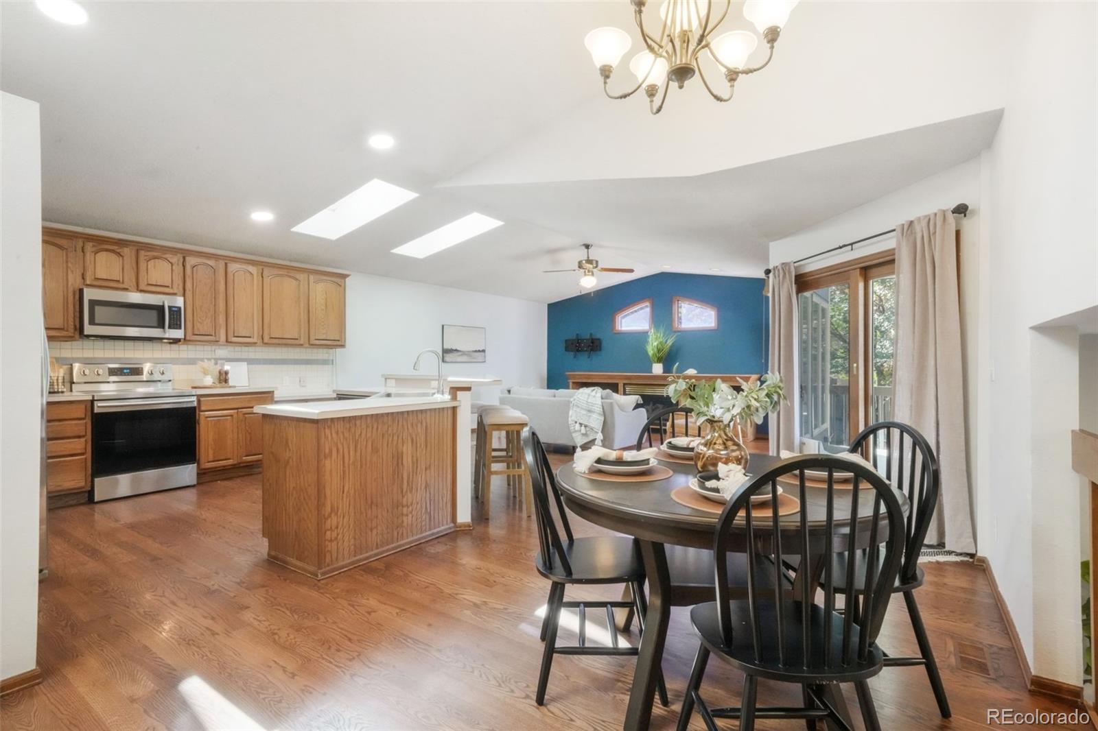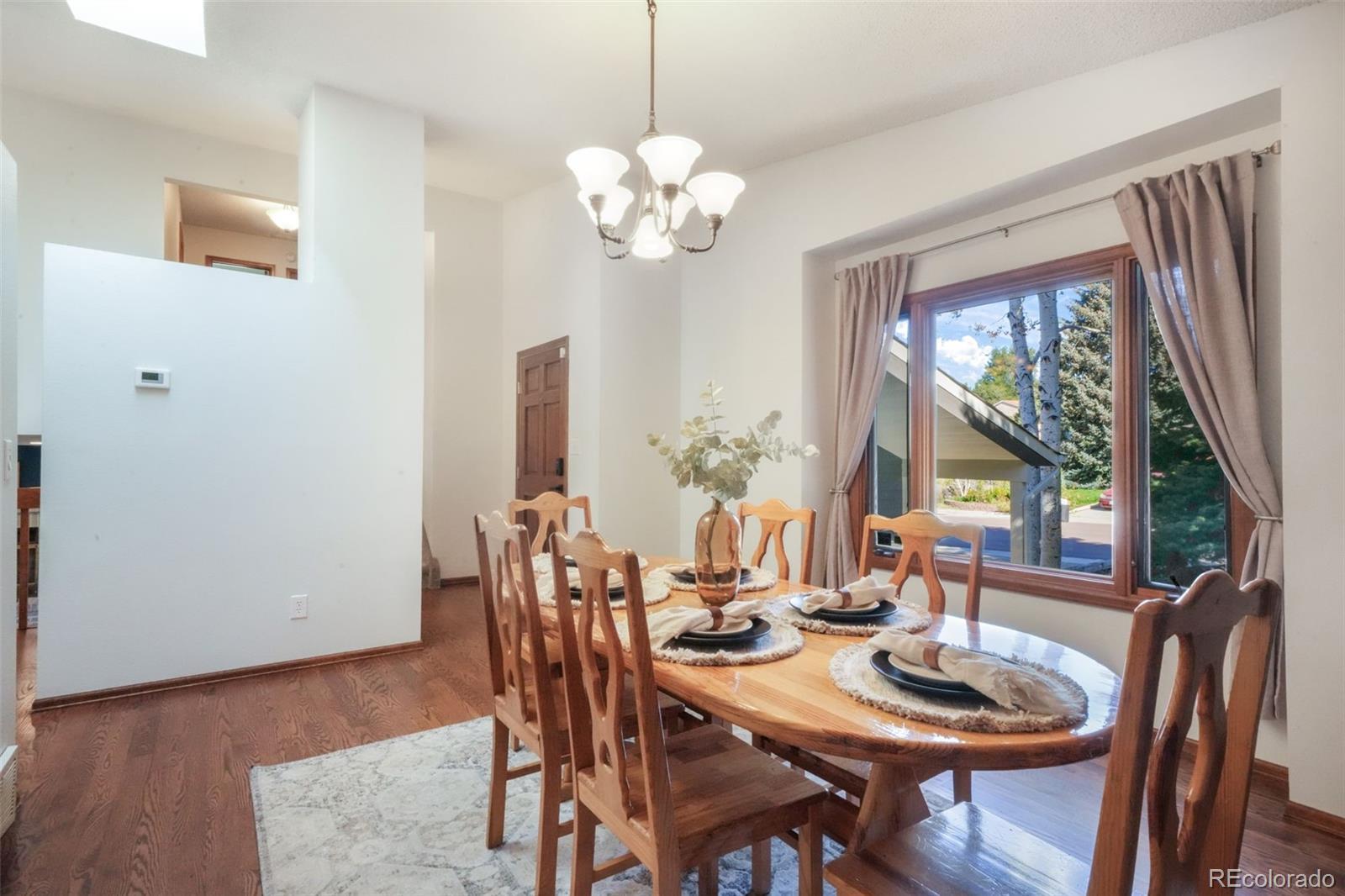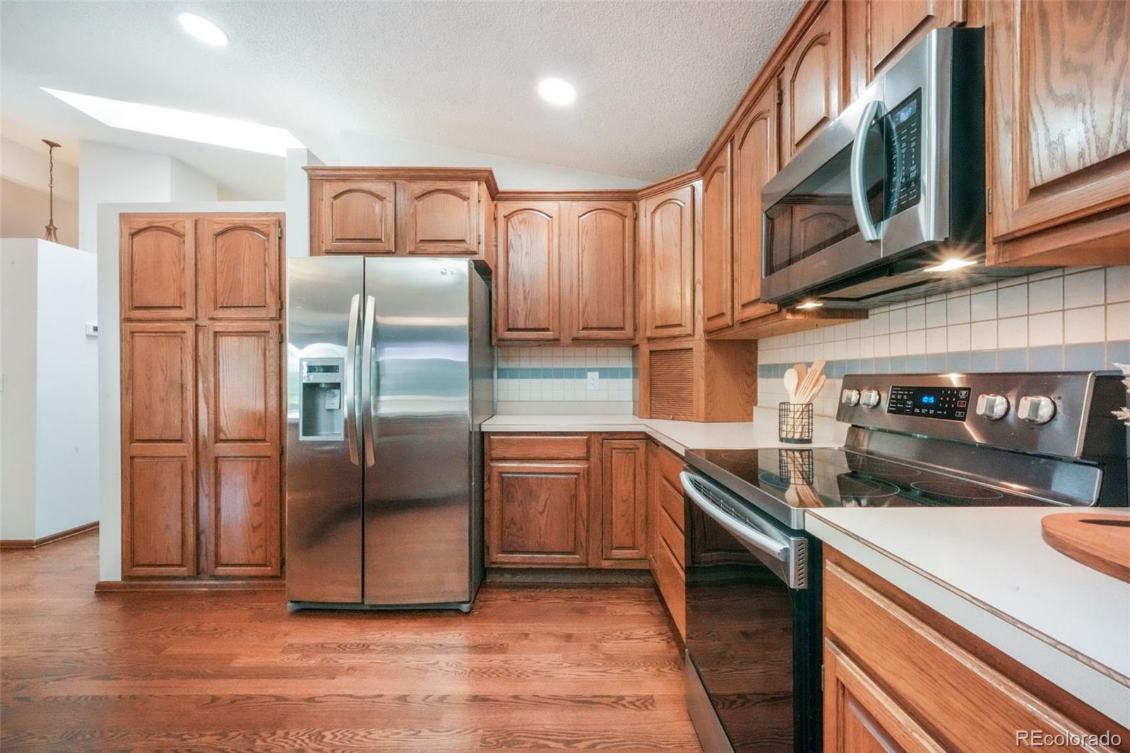 Welcome to this beautiful 4-bedroom, 3-bath tri-level home with a basement in the highly sought-after Old Farm neighborhood. Situated on a large corner lot in a cul-de-sac, this property features mature trees, a fenced backyard, and plenty of space to enjoy inside and out. Step inside to soaring vaulted ceilings, wood flooring, and a bright dining room that flows into the open-concept kitchen. The kitchen includes a large center island, stainless steel appliances, abundant cabinetry, a farm sink, and skylights that provide abundant natural light. The attached eating nook and formal living room create an ideal gathering space, with the formal living room offering a gas fireplace and access to the back deck. Upstairs, the spacious primary suite features a barn door entry to the attached bath, with large walk-in closet, and three-quarter shower. Two additional bedrooms and a full bath complete the upper level. On the lower level, enjoy a large family room with a beautiful brick-surround gas fireplace with built-in wood shelving, backyard access through the sliding door and a laundry room/bathroom combo with a shower. The basement includes a large sitting room, mechanical room, storage closet, oversized 5 ft crawlspace for storage, and another bedroom. The fenced backyard is a retreat with a covered deck, stone fireplace, tree swing, and mature landscaping. Additional highlights include a two-car garage, newer furnace and A/C (2021), upgraded electrical panel, covered gutters, space for RV parking, and winter views of Pikes Peak. Conveniently located near the Powers Corridor with easy access to shopping, restaurants, schools, and medical facilities. Location, updates, and charm—this Old Farm home has it