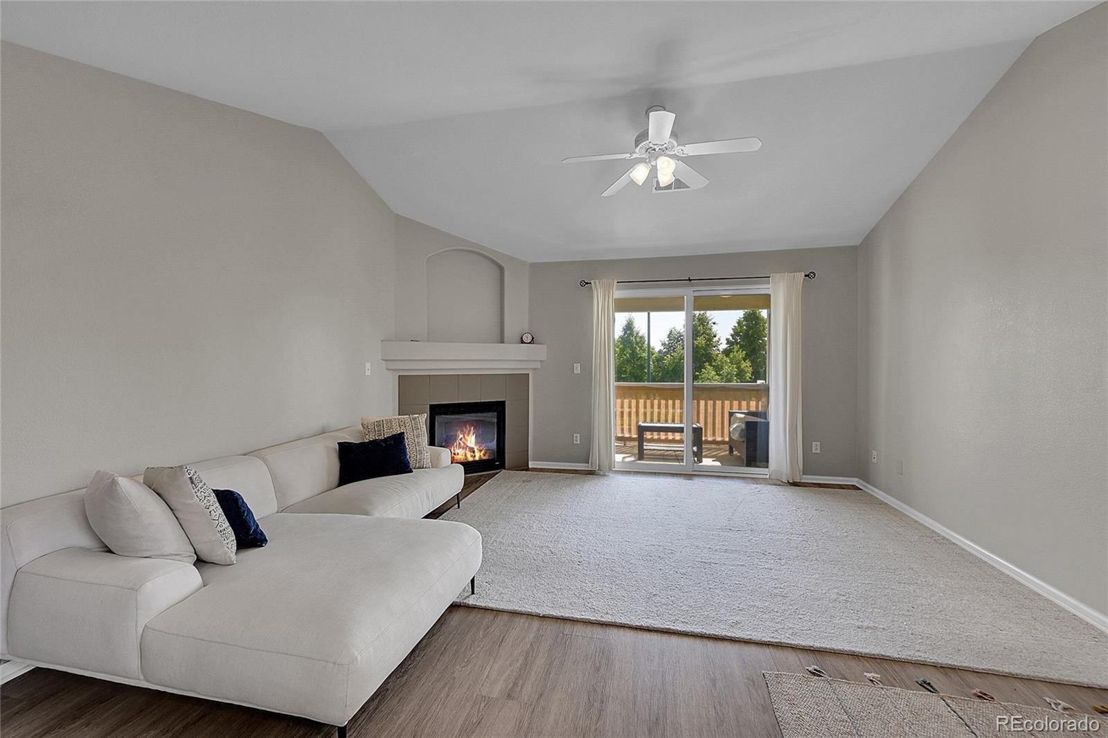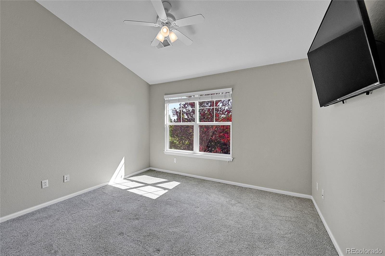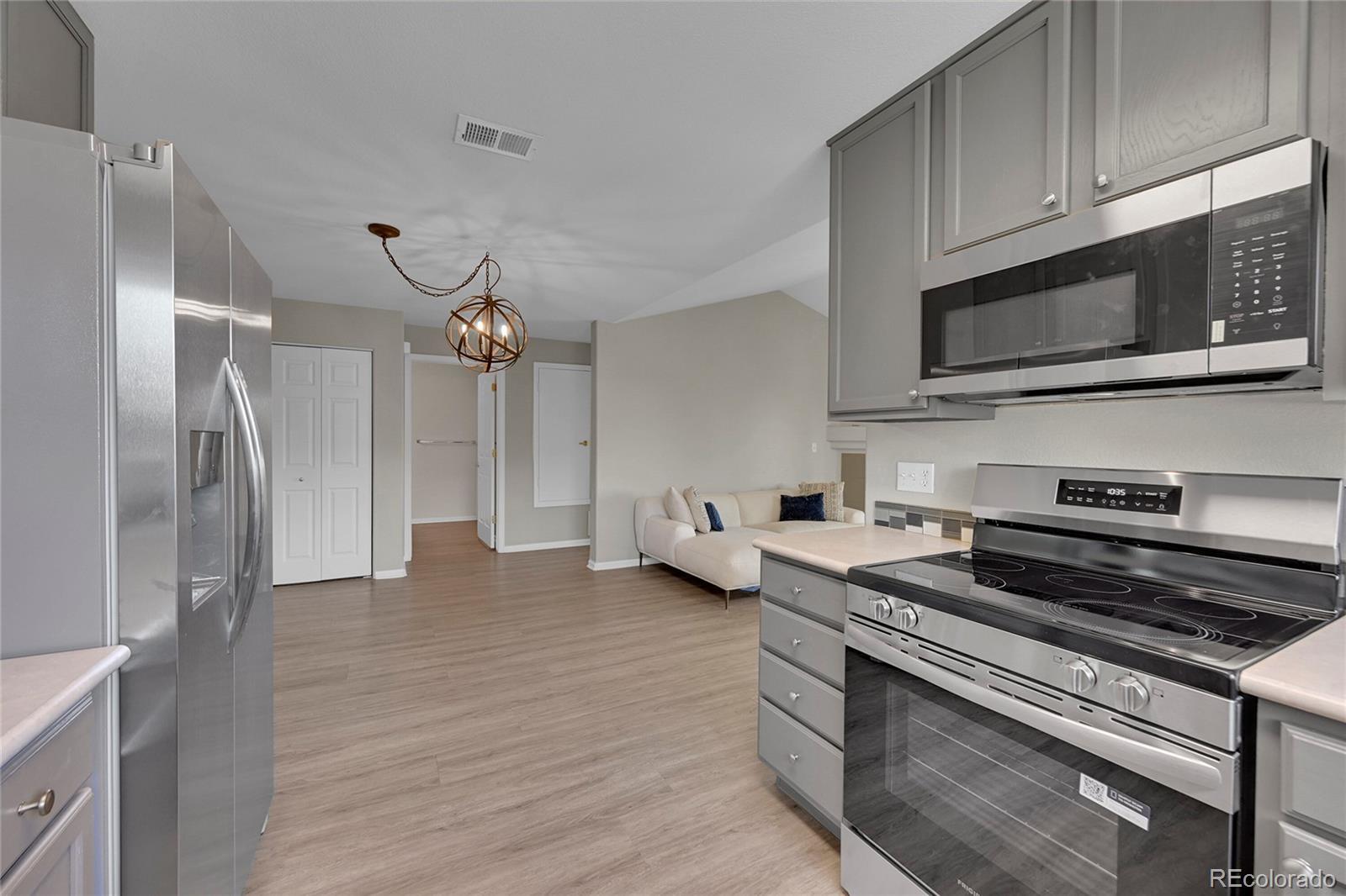 New appliances, new fixtures, and fresh paint throughout make this exquisite top-floor corner condominium in Denver’s desirable Tapestry community truly move-in ready. Offering 1,024 square feet of thoughtfully designed living space, this two-bedroom, two-bath home blends modern style with everyday comfort. The open floorplan and abundant natural light create an inviting atmosphere, with the living room flowing seamlessly into a chef’s kitchen featuring stainless steel appliances, sleek gray cabinetry, light countertops, and an elegant chandelier. The primary suite boasts vaulted ceilings, a walk-in closet, and a luxurious ensuite with a double vanity and shower/tub combination, while the second bedroom provides a peaceful retreat for family, guests, or a home office. Step outside to your private balcony overlooking the park—perfect for enjoying morning coffee or evening sunsets. Additional highlights include private garage parking and a prime Lowry location just steps from Montclair Rec Center, shops, restaurants, bike lanes, and miles of park trails. Residents also enjoy proximity to Lowry Dog Park, Common Ground Golf Course, and the Lowry Sports Complex, along with easy access to downtown Denver and major medical centers including Anschutz, the VA, and Denver Health.