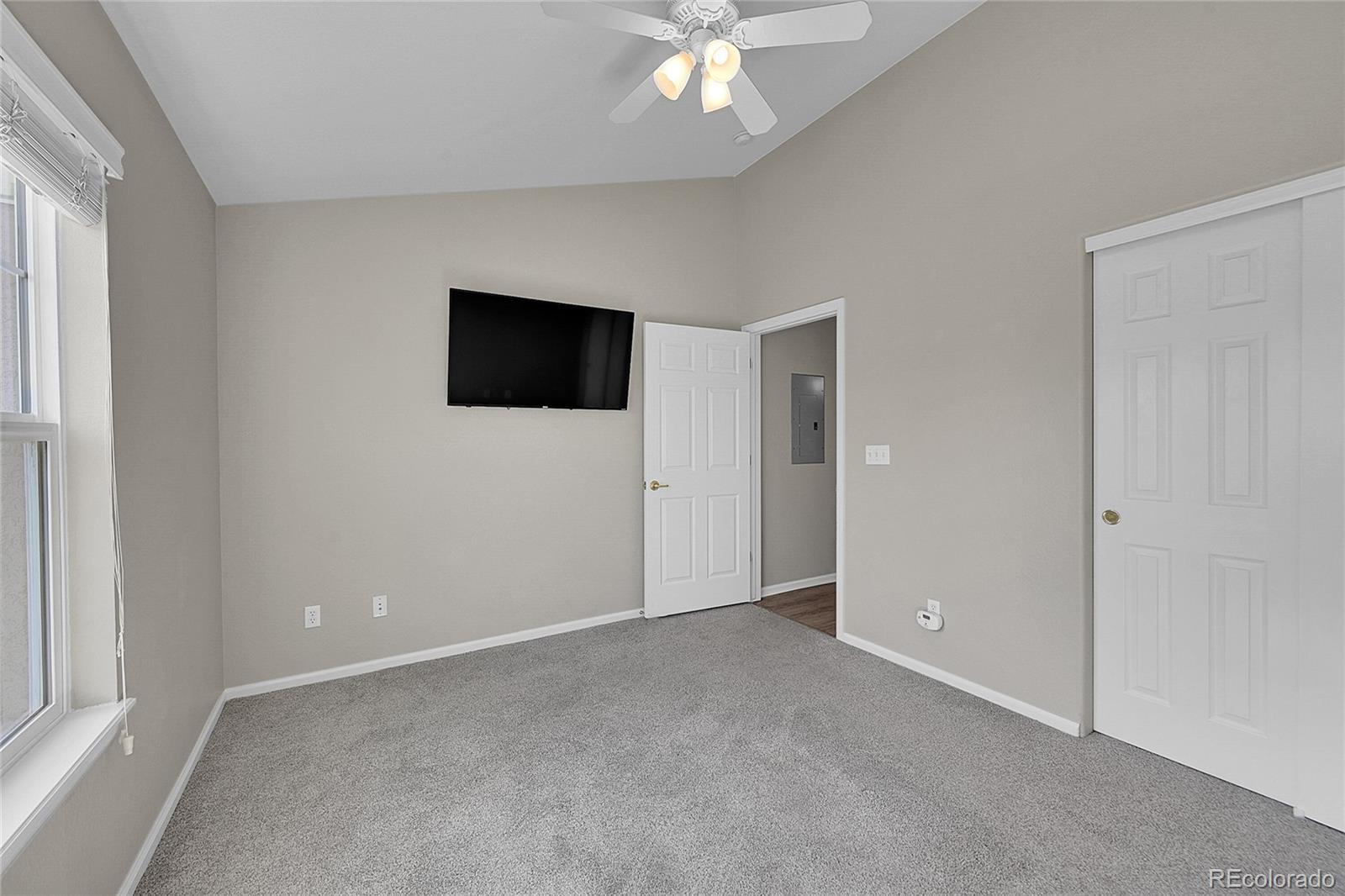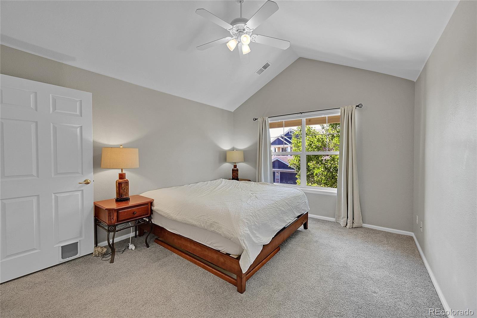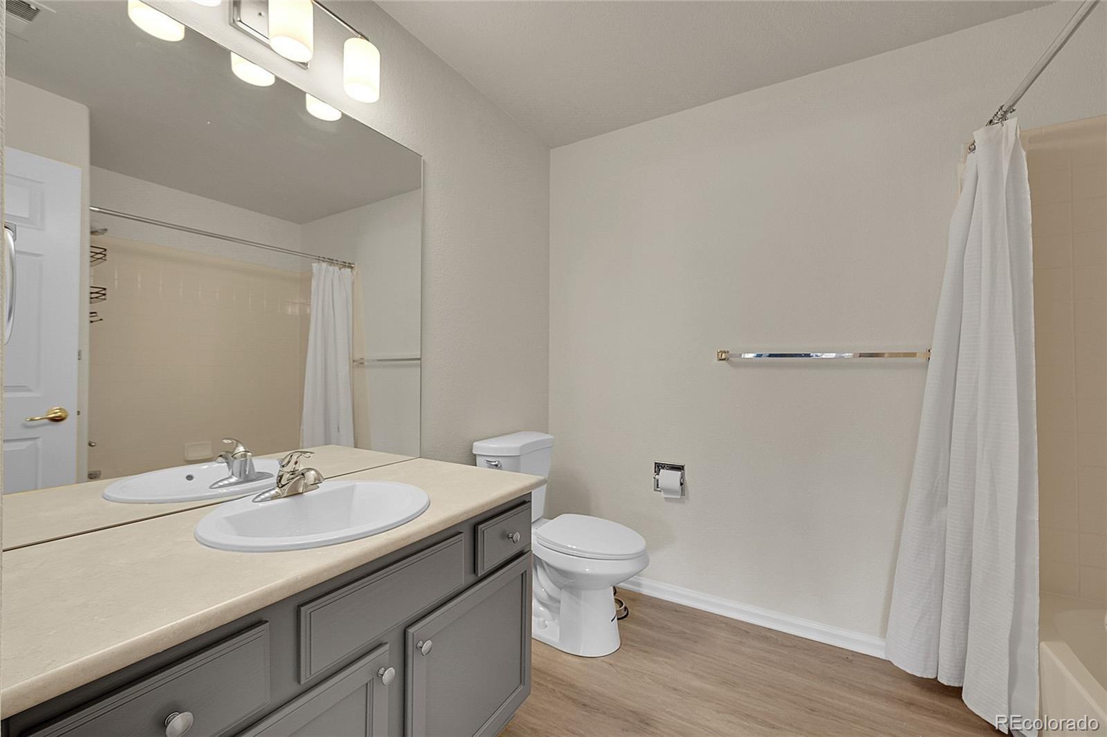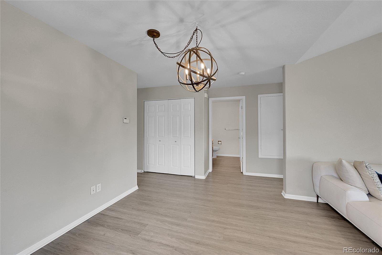 New appliances, new fixtures, and fresh paint throughout make this exquisite top-floor corner condominium in Denver’s desirable Tapestry community truly move-in ready. Offering 1,024 square feet of thoughtfully designed living space, this two-bedroom, two-bath home blends modern style with everyday comfort. The open floorplan and abundant natural light create an inviting atmosphere, with the living room flowing seamlessly into a chef’s kitchen featuring stainless steel appliances, sleek gray cabinetry, light countertops, and an elegant chandelier. The primary suite boasts vaulted ceilings, a walk-in closet, and a luxurious ensuite with a double vanity and shower/tub combination, while the second bedroom provides a peaceful retreat for family, guests, or a home office. Step outside to your private balcony overlooking the park—perfect for enjoying morning coffee or evening sunsets. Additional highlights include private garage parking and a prime Lowry location just steps from Montclair Rec Center, shops, restaurants, bike lanes, and miles of park trails. Residents also enjoy proximity to Lowry Dog Park, Common Ground Golf Course, and the Lowry Sports Complex, along with easy access to downtown Denver and major medical centers including Anschutz, the VA, and Denver Health.