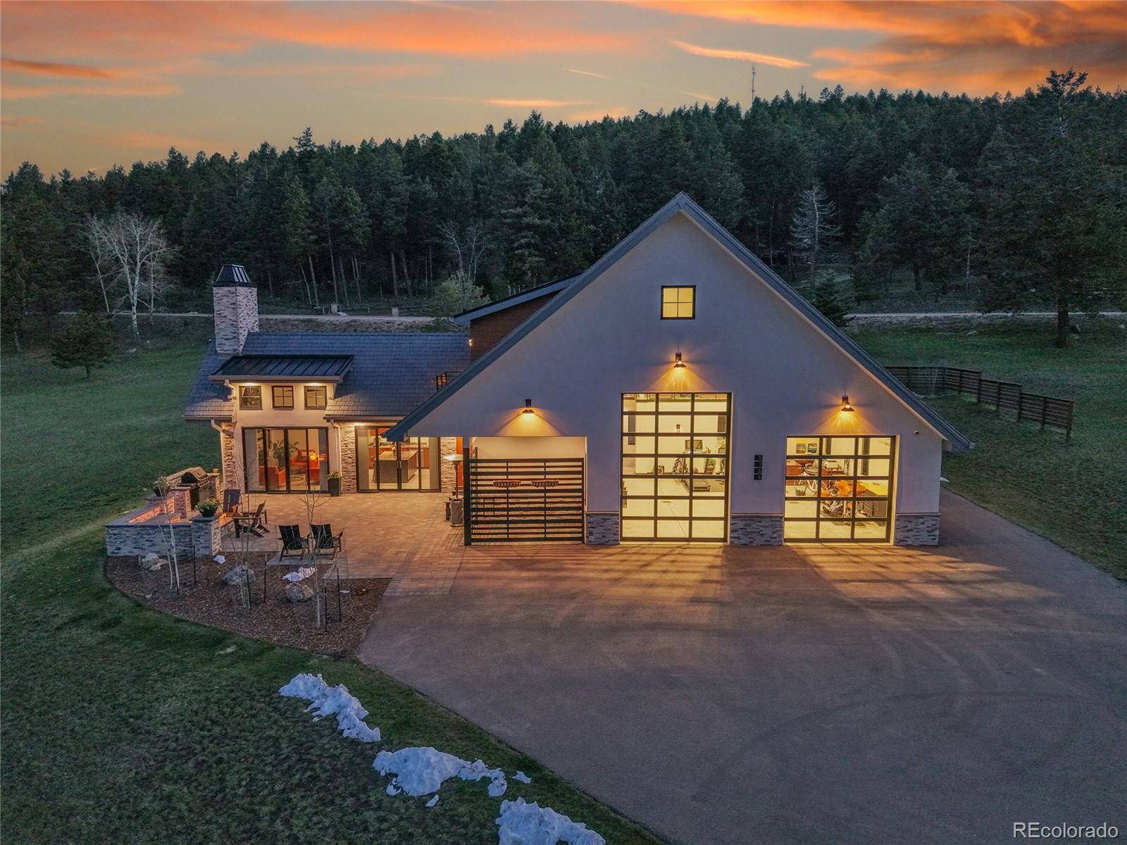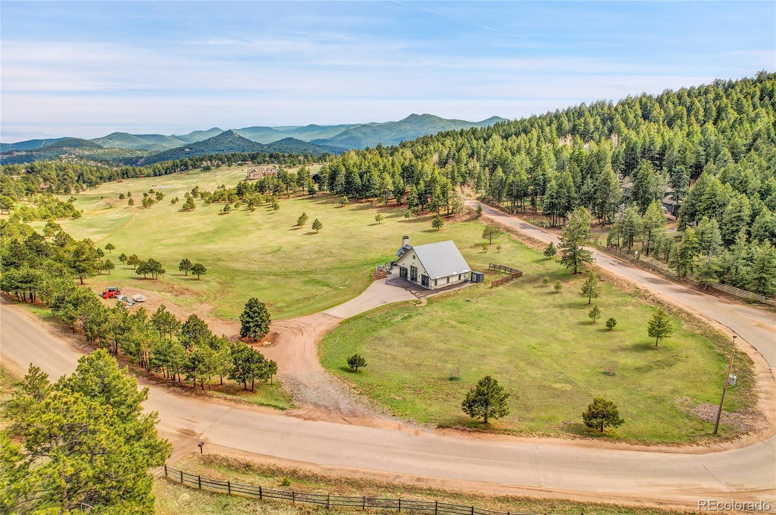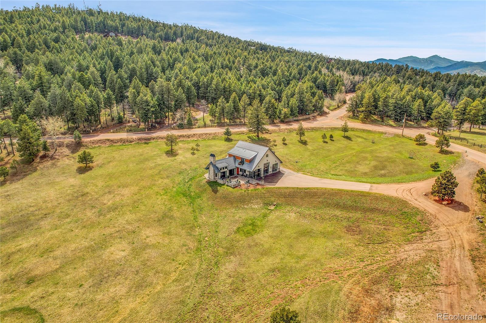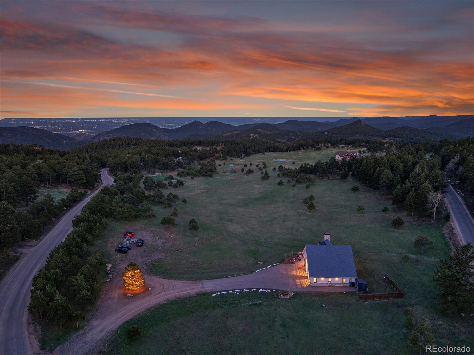 Discover 8.54 acres of park-like, usable land with sweeping mountain and city views—ideally located with county-maintained, paved road access. SIGNATURE FEATURES: 1,199 sq ft PLUS 1,199 sq ft garage - oversized finished garage; NEWER build designed to meet modern fire prevention standards, featuring a fire suppression system and hardened exterior materials; CUSTOM maple doors, maple cabinets and trim complement vaulted ceiling(s) and a striking stone fireplace. PROPERTY HIGHLIGHTS: Modern 2 bedroom/2 bath home on 8.54 acres in Bear Mountain Vista – ideal for buyers seeking space, style, and future potential. Vaulted ceilings, stone fireplace, quartzite kitchen counters, and expansive outdoor living with built-in seating, gas fire pit, and a custom stone gas grill alcove. The oversized garage mirrors the square footage of the home and is equally impressive, offering finished interior space, radiant heat, hot and cold water with (2) floor drains. Designed for future ADU conversion this home offers stylish, move-in-ready living while you explore the property's full potential—whether you simply want to enjoy the land and home as is, build your dream mountain estate, enjoy it as a private retreat or guest house, or considering subdivision opportunities). A 7-bedroom septic system and electric are in place, supporting future development. Preliminary plans for a 5,400+ sq ft main residence are also included, offering a head start on your vision. (All development and land use subject to county and state approval). 5166 Bear Mountain Drive delivers an exceptional blend of readiness, versatility, and natural beauty—all just minutes from Evergreen’s charming town center and endless outdoor recreation. Live, build, and thrive in Colorado’s mountain lifestyle. Property website can be viewed at: https://v1tours.com/listing/56960/