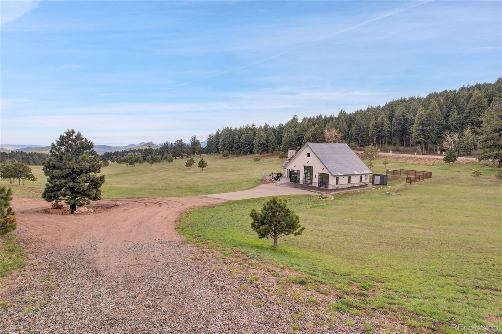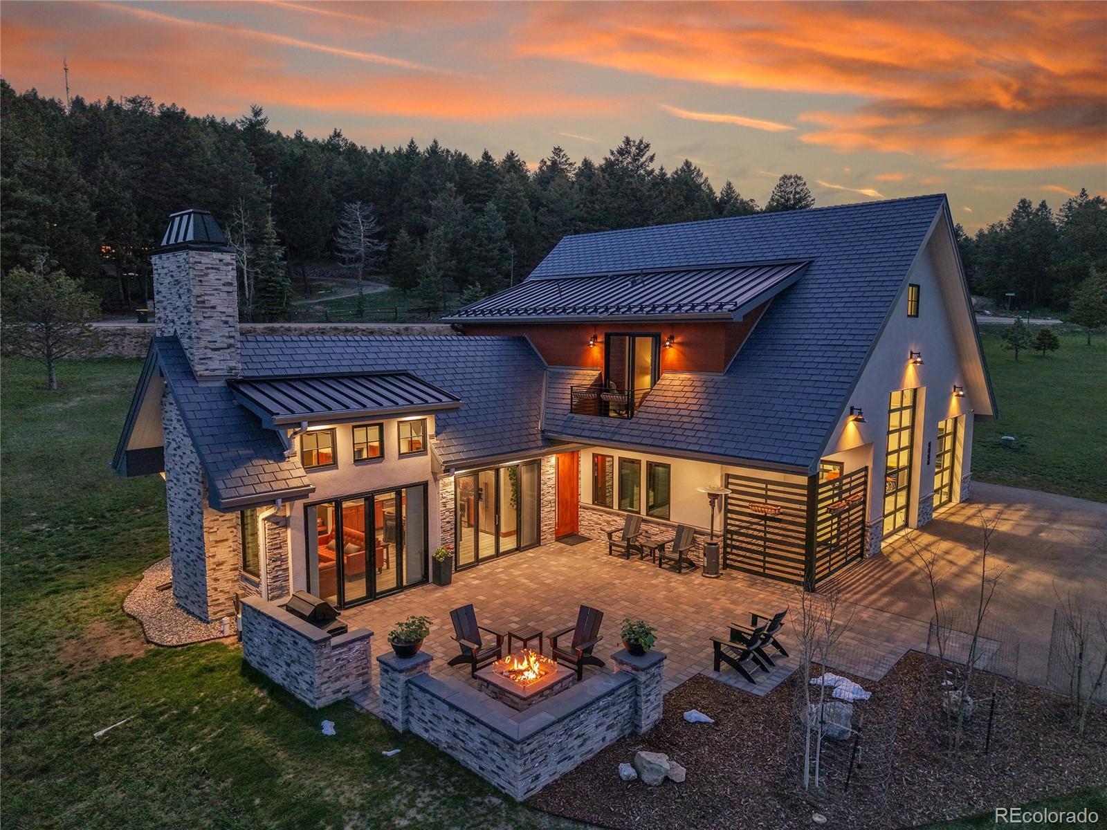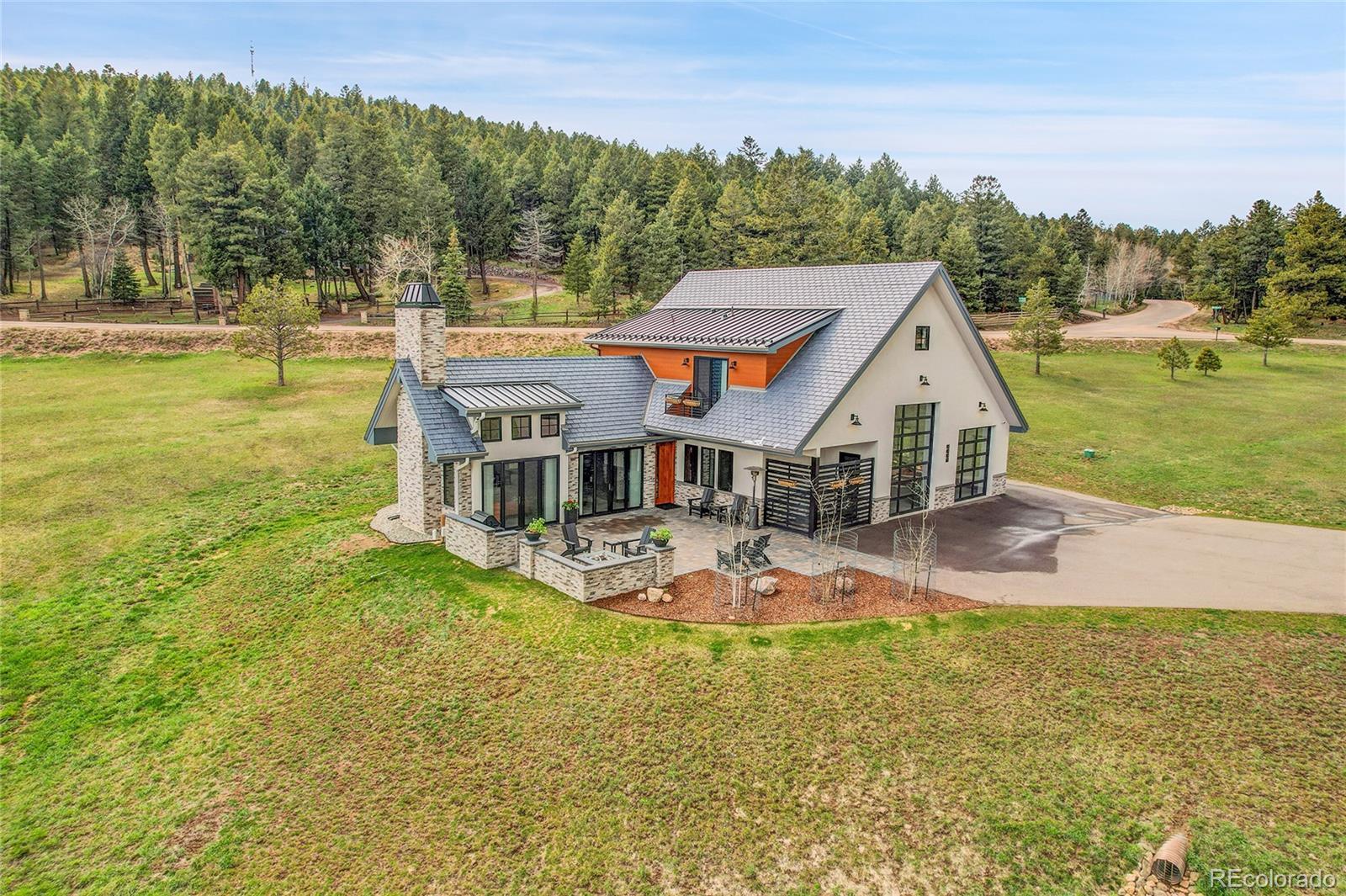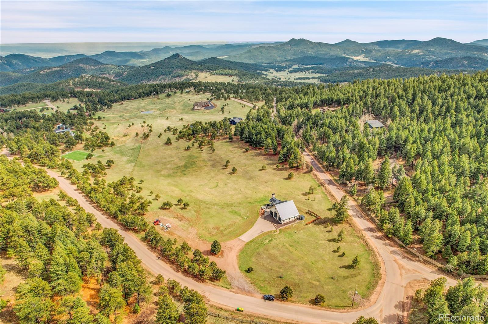 Discover 8.54 acres of park-like, usable land with sweeping mountain and city views—ideally located with county-maintained, paved road access. SIGNATURE FEATURES: 1,199 sq ft PLUS 1,199 sq ft garage - oversized finished garage; NEWER build designed to meet modern fire prevention standards, featuring a fire suppression system and hardened exterior materials; CUSTOM maple doors, maple cabinets and trim complement vaulted ceiling(s) and a striking stone fireplace. PROPERTY HIGHLIGHTS: Modern 2 bedroom/2 bath home on 8.54 acres in Bear Mountain Vista – ideal for buyers seeking space, style, and future potential. Vaulted ceilings, stone fireplace, quartzite kitchen counters, and expansive outdoor living with built-in seating, gas fire pit, and a custom stone gas grill alcove. The oversized garage mirrors the square footage of the home and is equally impressive, offering finished interior space, radiant heat, hot and cold water with (2) floor drains. Designed for future ADU conversion this home offers stylish, move-in-ready living while you explore the property's full potential—whether you simply want to enjoy the land and home as is, build your dream mountain estate, enjoy it as a private retreat or guest house, or considering subdivision opportunities). A 7-bedroom septic system and electric are in place, supporting future development. Preliminary plans for a 5,400+ sq ft main residence are also included, offering a head start on your vision. (All development and land use subject to county and state approval). 5166 Bear Mountain Drive delivers an exceptional blend of readiness, versatility, and natural beauty—all just minutes from Evergreen’s charming town center and endless outdoor recreation. Live, build, and thrive in Colorado’s mountain lifestyle. Property website can be viewed at: https://v1tours.com/listing/56960/