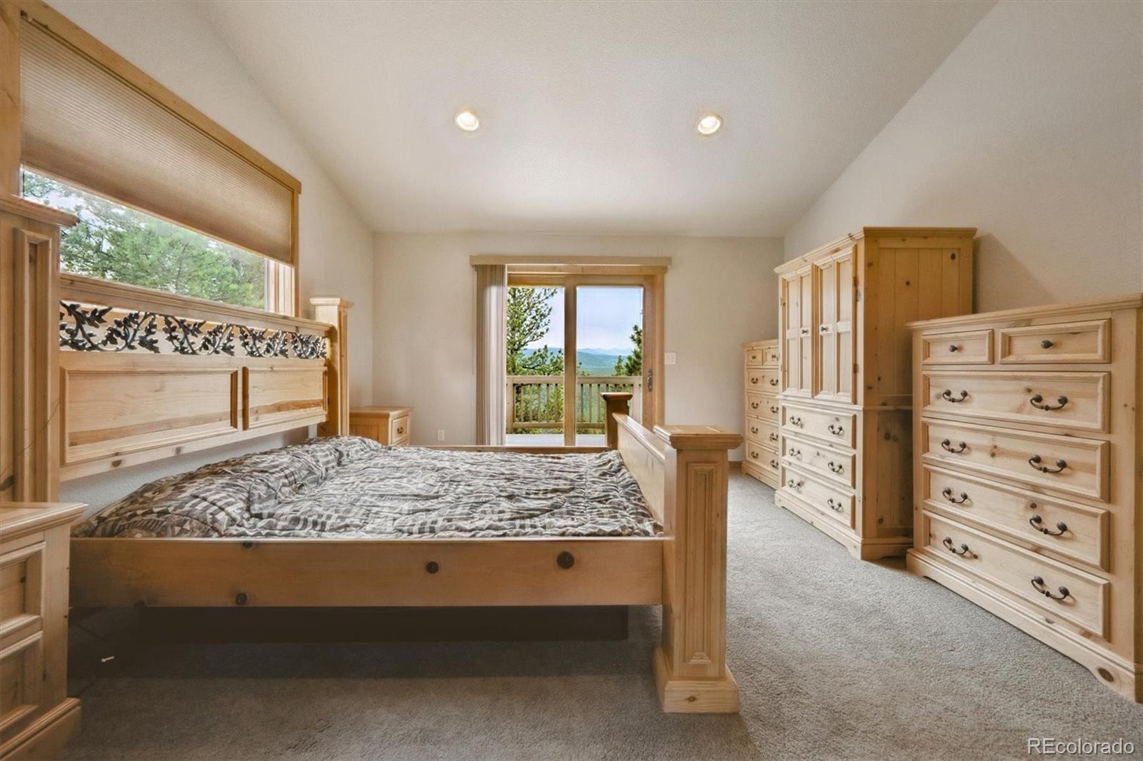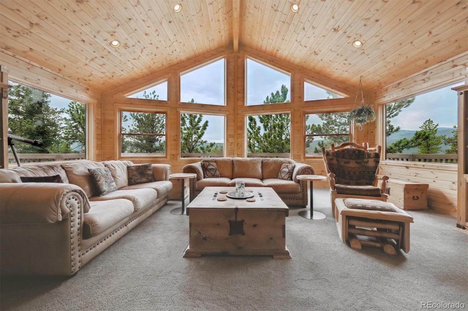 This fantastic mountain property, nestled in the mountains of Gilpin County, offers incredible views of Mount Blue Sky, Torreys, Gray and James Peaks. The spacious home features four bedrooms (two up, two main), three full bathrooms, two large living ares, and a pool table/game room. The downstairs bath, fireplace area, and exercise room have California Gold slate adding to the rustic feel. The kitchen, dining and laundry/pantry have rustic tumbled travertine stone enhancing the mountain feel of the rooms. The master bath features travertine tile and the upstairs bath has exotic quartzite tile giving each room a special and unique atmosphere. The kitchen has pine green granite countertops and the laundry room/pantry has an area for a freezer or extra refrigerator. The upstairs living room is the showcase of the home boasting vaulted ceilings and a prow with large windows to enhance your incredible views of the vast Colorado terrain. The room also has a gas fireplace to enhance your mountain experience. Knotty pine wood panels adorn the upstairs ceiling of the kitchen and living room. The downstairs living room has the same knotty pine wood ceiling, a prow with large windows and a wood burning stove. The house is hot water heated throughout, with four separate zones to regulate the areas heated. The 832 sq ft oversized three car grated wired with a 220 outlet and a work bench area. There is an additional 12 x 20 room off the garage that is finished Minutes away from trails and Golden Gate Canyon State Park. A 10 minute drive puts you in the heart of historic Blackhawk, CO , featuring casinos, spas, and fine dining. Easy access to I-70 to multiple ski resorts or an easy drive north to Eldora.