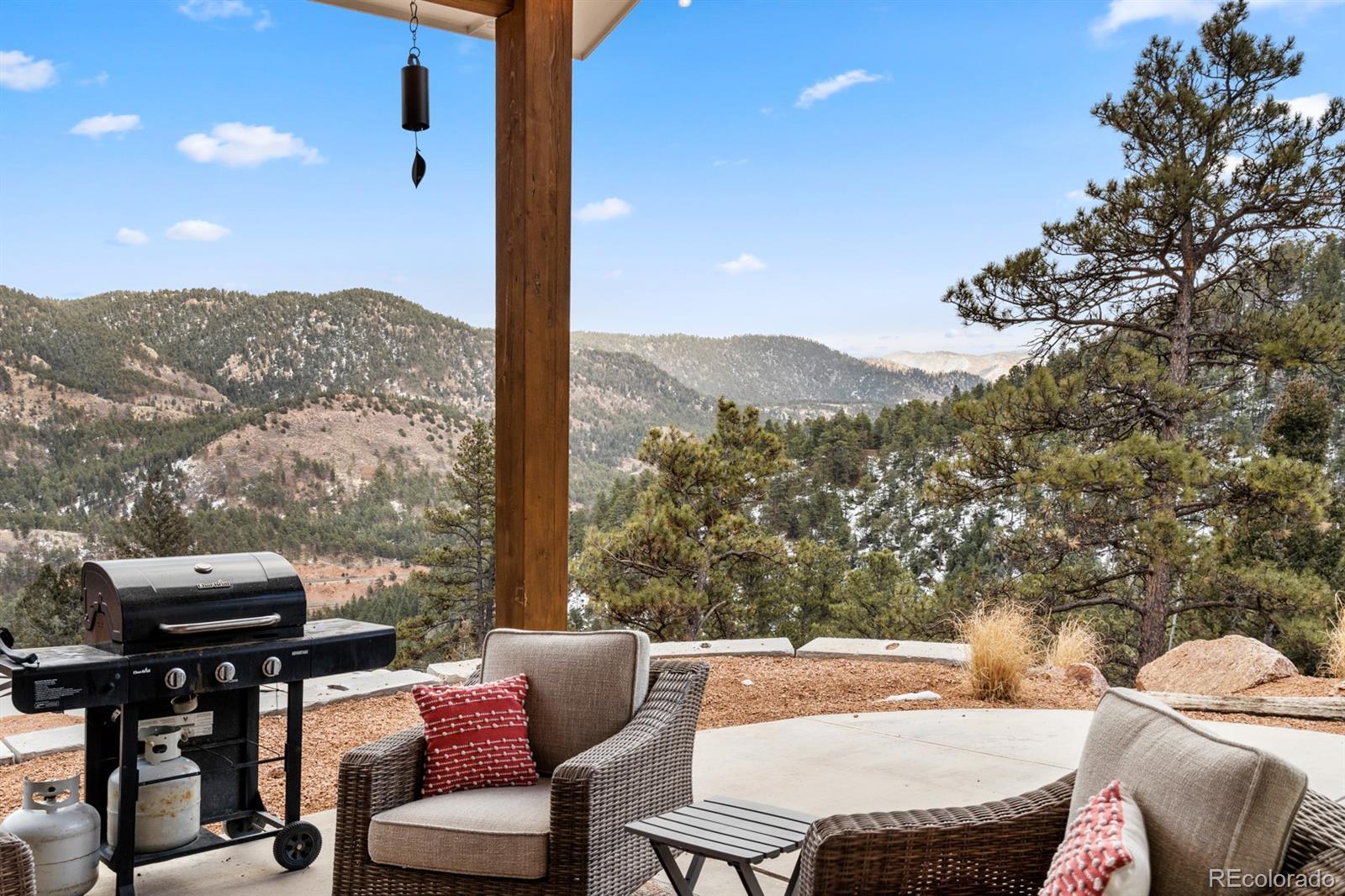 Escape to Peaceful Pines, a newly custom built luxury mountain retreat on 9.19 acres bordering national forest and just 20–25 minutes from downtown Colorado Springs! This secluded, rustic-modern home offers breathtaking views through floor-to-ceiling windows, custom sawblade fir floors, huge rustic beams, and a stunning great room with a wood-burning stove and 16 ft ceilings! The chef’s kitchen features Bosch appliances, black hood, quartz countertops, oversized island with integrated sink, custom pecan shelving, pot filler, Sharp pull-out microwave, and a walk-in pantry with custom wood shelving. The main-level primary suite includes a fireplace, sliding doors to the flagstone patio & hot tub, a spa-like bath with heated tile floors, double quartz vanity, designer tile, oversized walk-in shower with rainfall head and quartz bench, and a custom walk-in closet. Additional highlights include: Office with sliding doors to covered patio with tongue-and-groove ceiling, Custom alder wood barn doors throughout, 10 ft ceilings on main level; 9 ft basement ceilings, Dry bar + wet bar hookup, custom low-pile carpet, surround-sound wiring, 20×30 unfinished area ready for additional bedrooms and bathrooms, Oversized 2-car garage (feels like 3-car) with 8 ft doors and has been pre-plumbed for heat, 400 amp service + 200 amp subpanel, as well as a 50 amp RV hookup, Two furnaces, two water heaters, radon system, 1000-gal buried propane tank, Jellyfish lighting, heating cables on north side roof, south-facing driveway, Hardie board siding, concrete window wells, dog run, keypad entry, abundant wildlife, zoned for horses...the list goes on! Located just 2 minutes from Hwy 24. No Airbnb restrictions & currently a short-term rental with perfect ratings. With city conveniences like Amazon delivery and pizza at your doorstep — yet total privacy with no possibility of neighbors building around you — this home delivers the best of both worlds and is the perfect Colorado retreat!