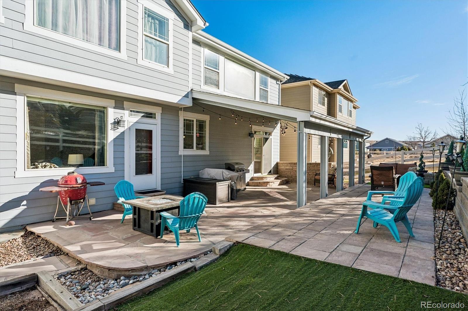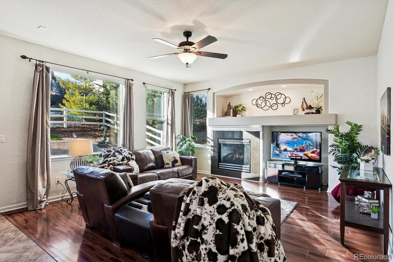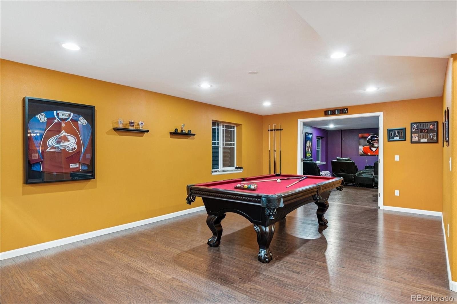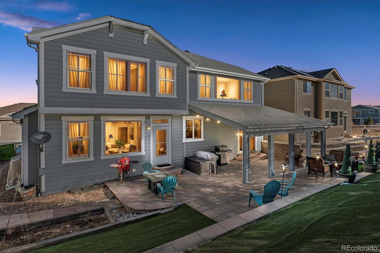 Freshly painted & full of character, this Castle Rock home makes an unforgettable first impression with a 2 story foyer & an eye-catching curved staircase with wrought-iron railings that immediately draws you in. A warm blend of wood & tile floors carries you through the living & dining rooms, where a sun-filled bay window & a stylish butler’s pantry add both charm & function. The kitchen is truly the heart of the home, designed to be lived in & loved, featuring a large island with bar seating, trendy pendant lighting, granite countertops with tile backsplash, gas cooktop, double ovens, breakfast bar, inviting dining nook, & built-in desk area perfect for homework or working from home. The family room flows from kitchen & is light & bright with a cozy gas fireplace, while a main-floor office provides a quiet workspace. The laundry room is conveniently located on the main level with a sink & built-in cabinetry. Upstairs, a spacious loft opens the door to endless possibilities, from a second office to a play or creative space. The primary suite feels like a private escape with double French doors, a sitting area, a 3 way fireplace shared with the bath, & soaking tub positioned perfectly for winding down by the fire, along with beautiful tile finishes & a generous walk-in closet. 3 additional bedrooms complete the upper level, including one with a private ensuite bath & two connected by a Jack-&-Jill bath. Downstairs, the finished basement becomes the ultimate hangout with an enclosed theater room for movie nights or game day, a wet bar ready for evenings with friends, a large recreation area, an exercise room or flex space, & a convenient ¾ bath. Completing the picture are a newer furnace, A/C, & roof, a three-car garage, & a backyard designed for relaxation with low-maintenance turf & a large covered patio, all set within a neighborhood offering parks, a pool, a fitness center, & even a nearby coffee spot to start your mornings right.