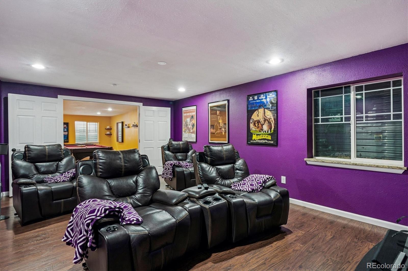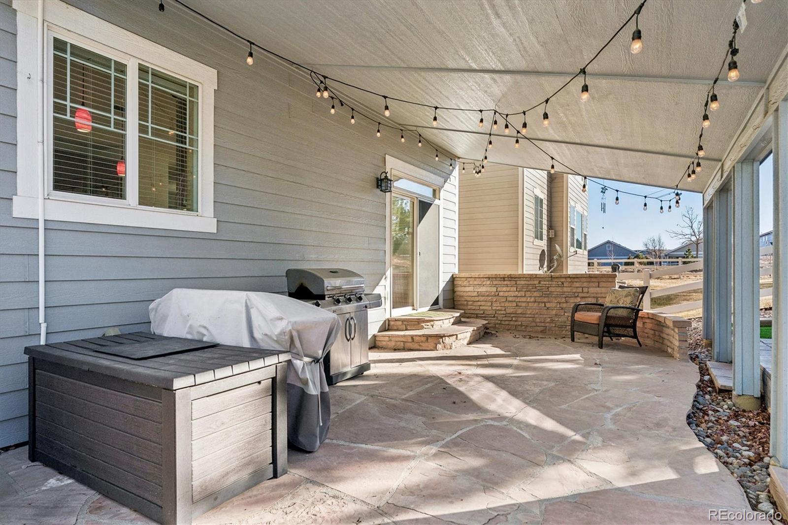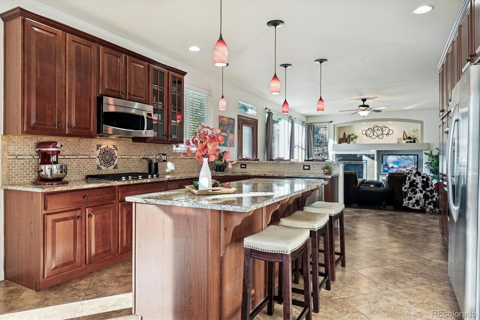Freshly painted & full of character, this Castle Rock home makes an unforgettable first impression with a 2 story foyer & an eye-catching curved staircase with wrought-iron railings that immediately draws you in. A warm blend of wood & tile floors carries you through the living & dining rooms, where a sun-filled bay window & a stylish butler’s pantry add both charm & function. The kitchen is truly the heart of the home, designed to be lived in & loved, featuring a large island with bar seating, trendy pendant lighting, granite countertops with tile backsplash, gas cooktop, double ovens, breakfast bar, inviting dining nook, & built-in desk area perfect for homework or working from home. The family room flows from kitchen & is light & bright with a cozy gas fireplace, while a main-floor office provides a quiet workspace. The laundry room is conveniently located on the main level with a sink & built-in cabinetry. Upstairs, a spacious loft opens the door to endless possibilities, from a second office to a play or creative space. The primary suite feels like a private escape with double French doors, a sitting area, a 3 way fireplace shared with the bath, & soaking tub positioned perfectly for winding down by the fire, along with beautiful tile finishes & a generous walk-in closet. 3 additional bedrooms complete the upper level, including one with a private ensuite bath & two connected by a Jack-&-Jill bath. Downstairs, the finished basement becomes the ultimate hangout with an enclosed theater room for movie nights or game day, a wet bar ready for evenings with friends, a large recreation area, an exercise room or flex space, & a convenient ¾ bath. Completing the picture are a newer furnace, A/C, & roof, a three-car garage, & a backyard designed for relaxation with low-maintenance turf & a large covered patio, all set within a neighborhood offering parks, a pool, a fitness center, & even a nearby coffee spot to start your mornings right.