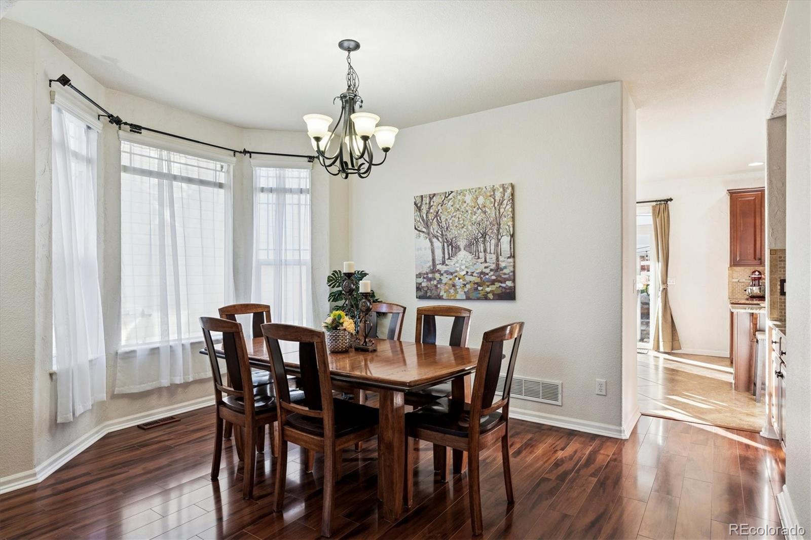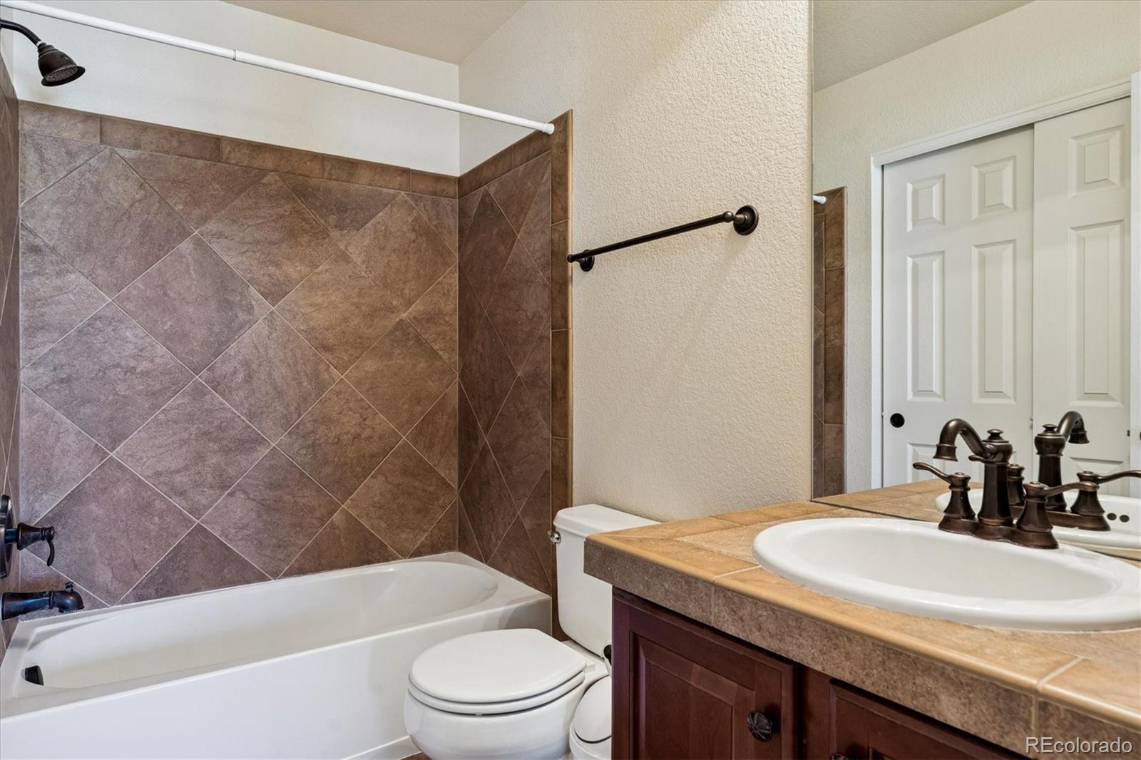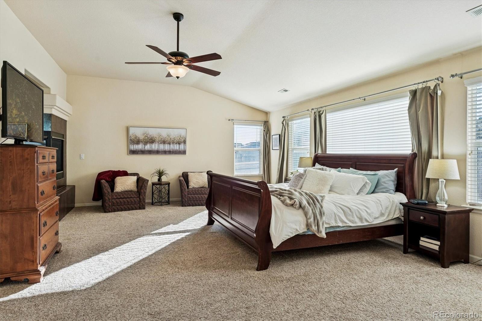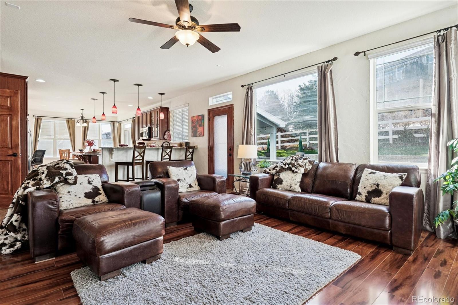 Freshly painted & full of character, this Castle Rock home makes an unforgettable first impression with a 2 story foyer & an eye-catching curved staircase with wrought-iron railings that immediately draws you in. A warm blend of wood & tile floors carries you through the living & dining rooms, where a sun-filled bay window & a stylish butler’s pantry add both charm & function. The kitchen is truly the heart of the home, designed to be lived in & loved, featuring a large island with bar seating, trendy pendant lighting, granite countertops with tile backsplash, gas cooktop, double ovens, breakfast bar, inviting dining nook, & built-in desk area perfect for homework or working from home. The family room flows from kitchen & is light & bright with a cozy gas fireplace, while a main-floor office provides a quiet workspace. The laundry room is conveniently located on the main level with a sink & built-in cabinetry. Upstairs, a spacious loft opens the door to endless possibilities, from a second office to a play or creative space. The primary suite feels like a private escape with double French doors, a sitting area, a 3 way fireplace shared with the bath, & soaking tub positioned perfectly for winding down by the fire, along with beautiful tile finishes & a generous walk-in closet. 3 additional bedrooms complete the upper level, including one with a private ensuite bath & two connected by a Jack-&-Jill bath. Downstairs, the finished basement becomes the ultimate hangout with an enclosed theater room for movie nights or game day, a wet bar ready for evenings with friends, a large recreation area, an exercise room or flex space, & a convenient ¾ bath. Completing the picture are a newer furnace, A/C, & roof, a three-car garage, & a backyard designed for relaxation with low-maintenance turf & a large covered patio, all set within a neighborhood offering parks, a pool, a fitness center, & even a nearby coffee spot to start your mornings right.