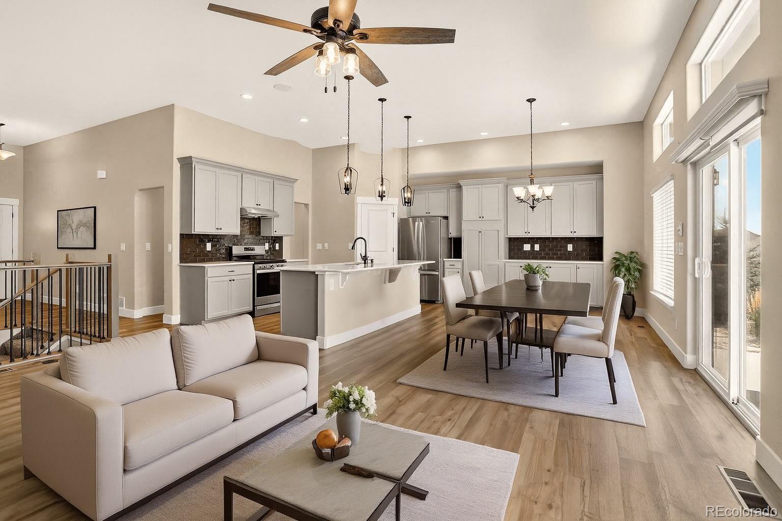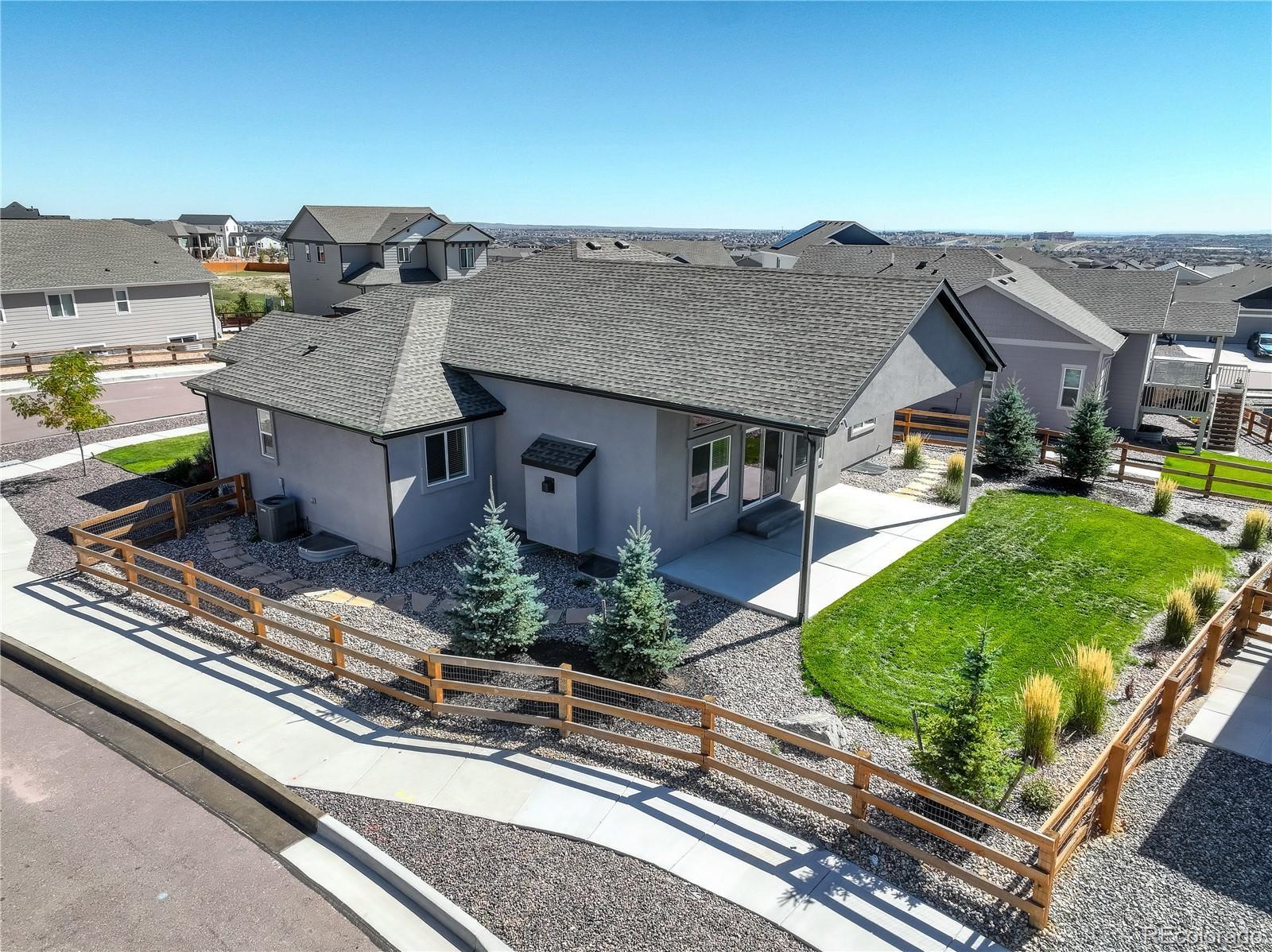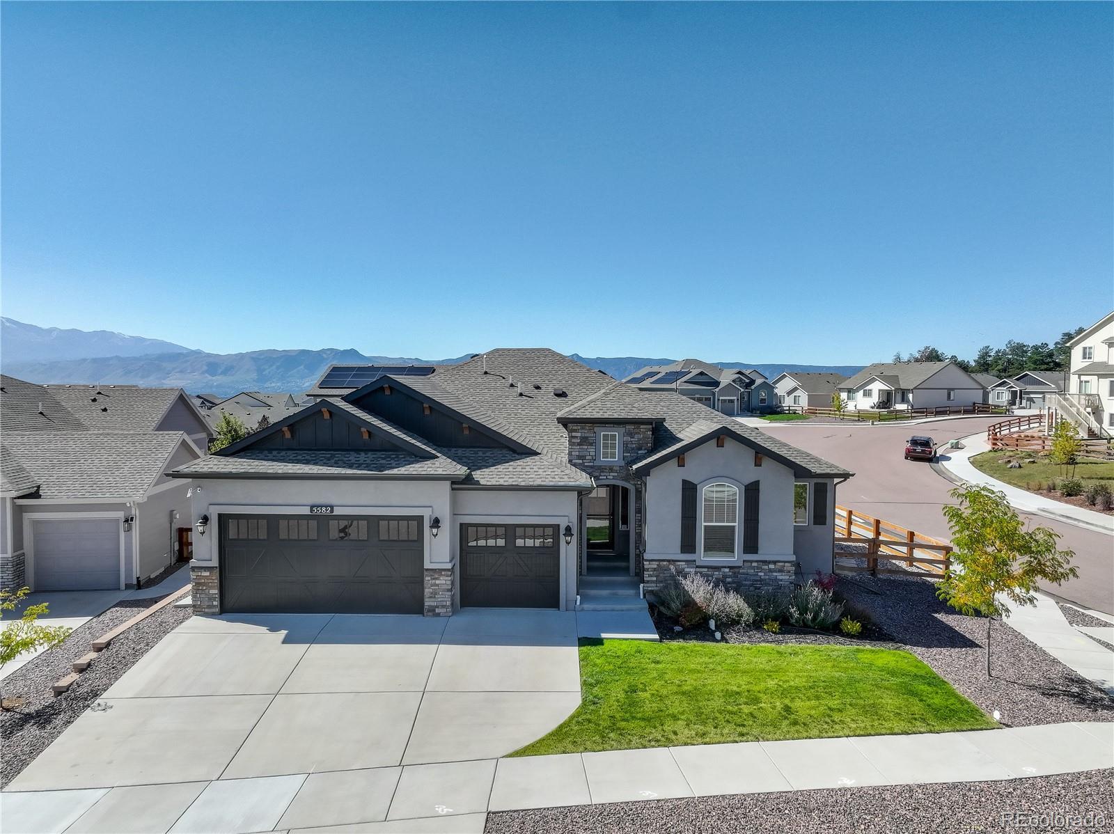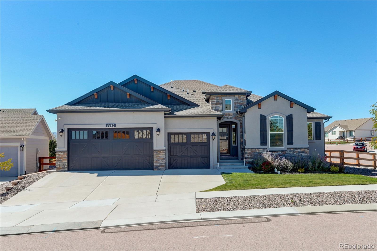 This newer home is ideally located on a corner lot in Bradley Ranch, and better yet, it’s decked out with all the thoughtful upgrades that will have you sighing, “It’s good to be home.” The 3,720 square-foot ranch home features every important comfort, including a 5-piece master bath with a jetted tub, ceiling fans in every bedroom, quartz counters in the bathrooms, a gas fireplace, and of course, mountain views. Kick back or cook up a storm in the open living space, including the upgraded gourmet kitchen with high-end finishes, premium soft-close cabinetry, quartz countertops, pantry, large island, and beautiful tile backsplash. Curl up by the gas fireplace in chilly months, or let your socializing spill onto the huge 28’ X 12’ covered back patio when the Colorado weather is really showing off. The backyard is fenced and professionally landscaped. The whole-house humidifier, high efficiency furnace and water heater, sump pump, and central A/C will give you peace of mind and comfort all year. Spread out in five bedrooms and three bathrooms and never worry about storage thanks to the large unfinished basement storage room and the finished space below the stairs. The 3-car garage is equipped with its own storage system and bike hangers so there’s space for all of your gear and decor. Between the whole-house sound system with built-in equipment and the huge granite basement wet bar, you’re ready to relax or entertain in any part of the home. From the master bedroom’s crown molding to the basement’s fabulous wet bar, this home is move-in ready and still beautifully new. Use your VA Eligibility to assume this attractive VA loan! See it before it’s gone!