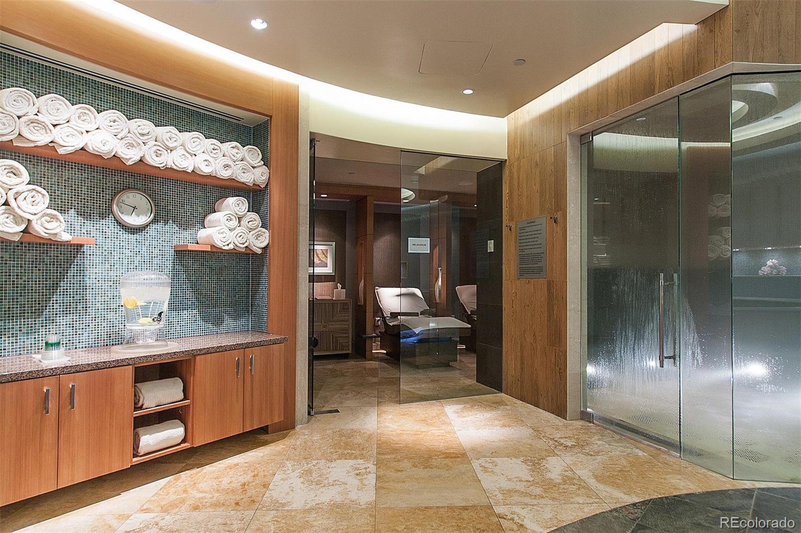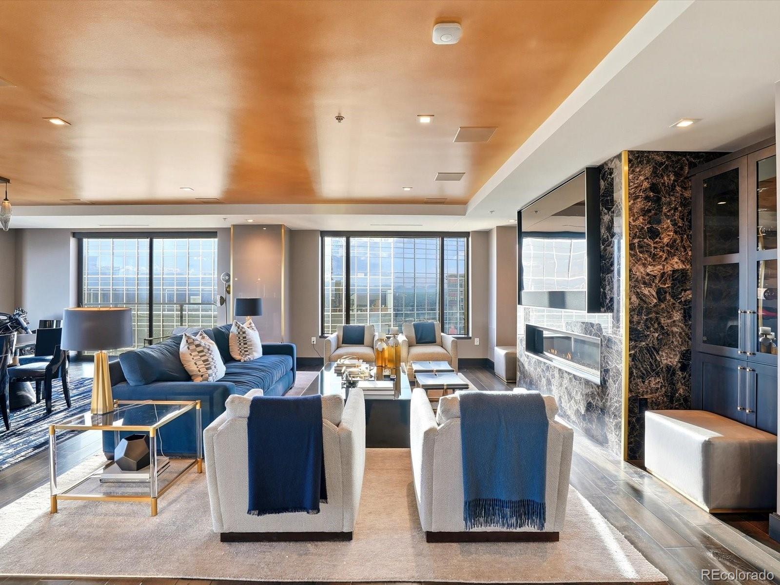 Welcome to Residence 2320 at the Four Seasons Private Residences Denver—a rare, fully turnkey, designer-furnished home paired with the legendary Four Seasons lifestyle. Completely reimagined with nearly $1M invested in finishes, systems, and furnishings, this no-compromise renovation delivers a residence that feels brand new, with fewer than 100 total days of occupancy. The showpiece great room features an oversized gas fireplace wrapped in full-slab onyx, custom quartz columns with brass accents, a bespoke gold-leaf ceiling, and a built-in wine & spirits display. The kitchen was designed as a true “club” style entertaining space with a French La Cornue range, Sub-Zero refrigeration, Wolf microwave, Miele dishwasher, Brizo faucet, Ann Sacks backsplash, custom cabinetry with brass hardware, Black shagreen leather custom designed bar, and a dramatic waterfall-edge black-granite countertop with integrated sink. Smart-home lovers, rejoice: the residence includes a fully integrated Crestron system with multi-room AV, and integrated HVAC and lighting controls. The primary suite is a private retreat with automated shades and a spa-inspired bath wrapped in Calcutta slab granite and marble, Ann Sacks tile flooring, and high-end Kohler & Waterworks fixtures—finished with a glass-enclosed shower and elevated, hotel-level polish. The guest bedroom features stunning panoramic views of the Rocky Mountains and is equipped with a nicely appointed ensuite bath. Ownership here is about more than a beautiful home, it’s about the Four Seasons lifestyle: 24-hour concierge, valet, security and engineering, plus access to signature amenities including two fitness centers, outdoor pool, spa facilities, and a residents-only house car, with a-la-carte services like housekeeping and in-home dining. Luxury. Turnkey. Iconic. This home delivers the feel of a private, newly-built designer residence wrapped in the service, discretion, and convenience that only Four Seasons can provide.