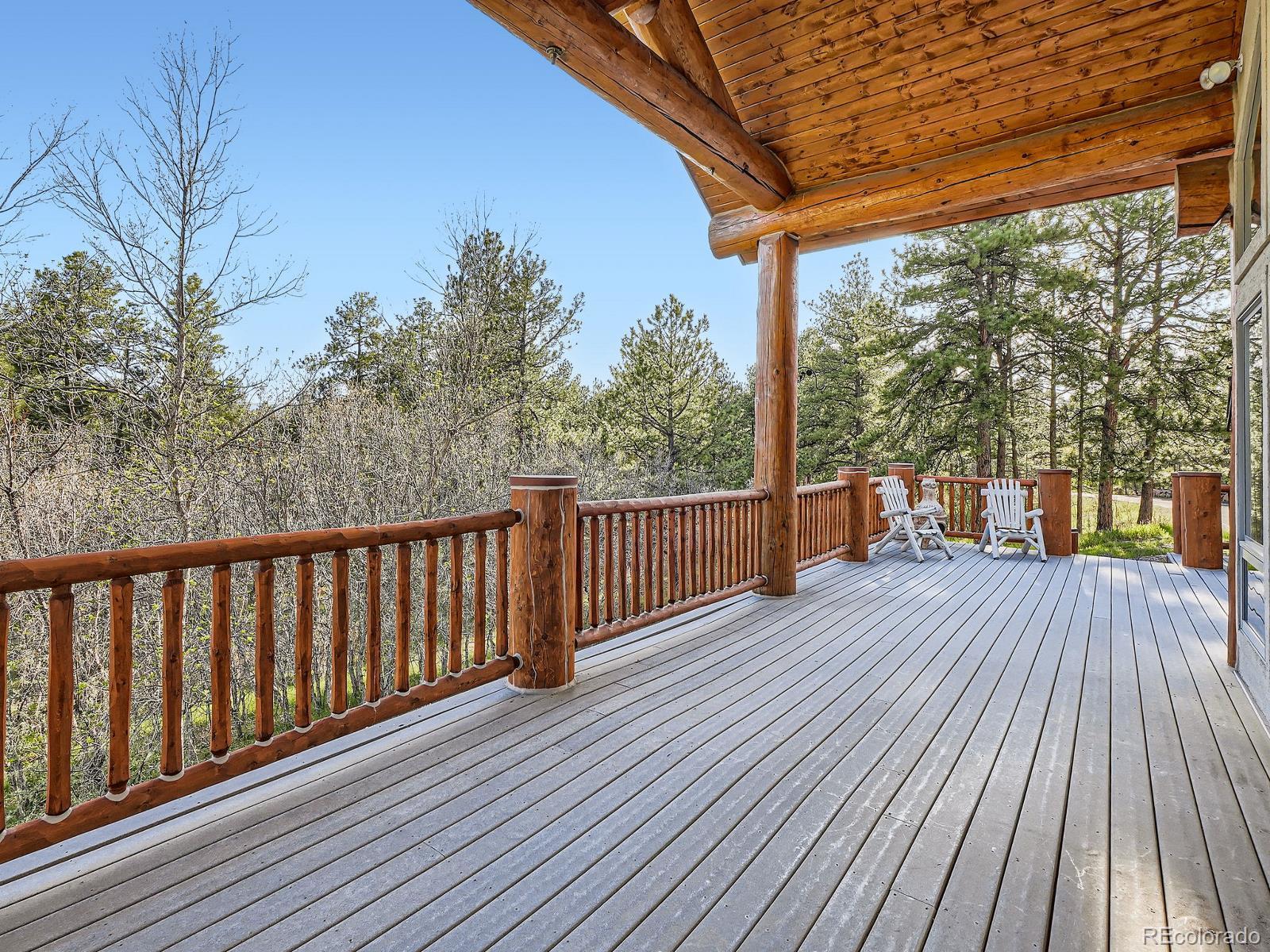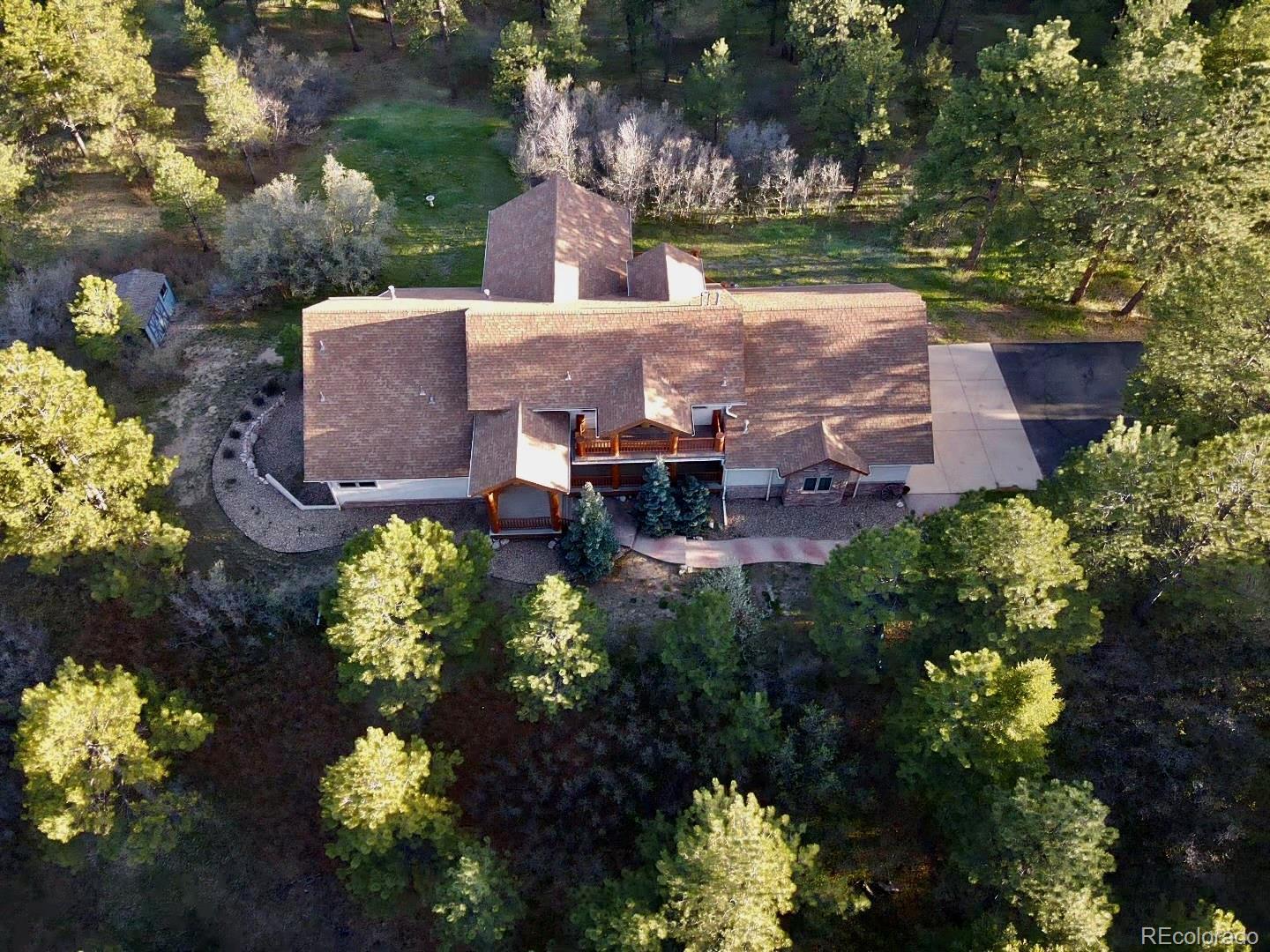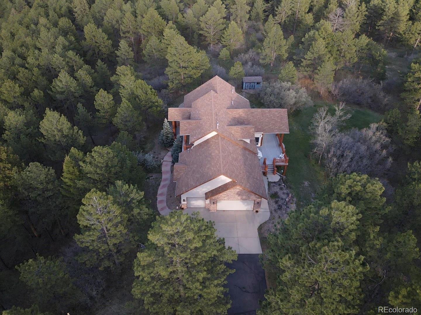 Discover the perfect blend of luxury and tranquility in this expansive 5,135 square foot home featuring 4 spacious bedrooms, 5 bathrooms, and breathtaking panoramic views. Designed for both comfort and entertaining, the open-concept layout includes center island kitchen with knotty pine custom cabinets, elegant dining area with a custom mural, and multiple living spaces with large windows that bring the outdoors in. Bonus open living area in the loft with a built-in office space and a covered patio with stunning views. Main level family room features soaring t&g ceilings with 18' log beams and a 3 sided floor to ceiling stone gas fireplace. Large Primary bedroom retreat complete with a gas fireplace, sitting area, private deck, and large walk-in closet. 5 piece primary bath includes separate sinks, cabinets and counter space, jetted soaking tub and walk-in twin head steam shower. Walkout basement boasts a huge great room with built-in entertainment center. 3 additional bedrooms and 2 baths. The home includes both an attached 3-car garage and an additional 3-car detached garage. Both are oversized and heated, perfect for car enthusiasts, workshops, or extra storage. Enjoy ultimate privacy and space with 35 pristine acres, ideal for equestrian use, outdoor recreation, or simply soaking in the natural beauty. Outdoor living space is abundant with a garden level back patio, covered front porch and expansive back deck perfect for entertaining or relaxing and enjoying the views, trees and wildlife. This rare property offers the feel of a secluded mountain escape while remaining just minutes from town amenities in nearby Larkspur, Castle Rock or Monument. Whether you're looking for a full-time residence, vacation property or investment opportunity, this property delivers unmatched value and potential. Situated perfectly between Denver International Airport and Colorado Springs Airport for added convenience.