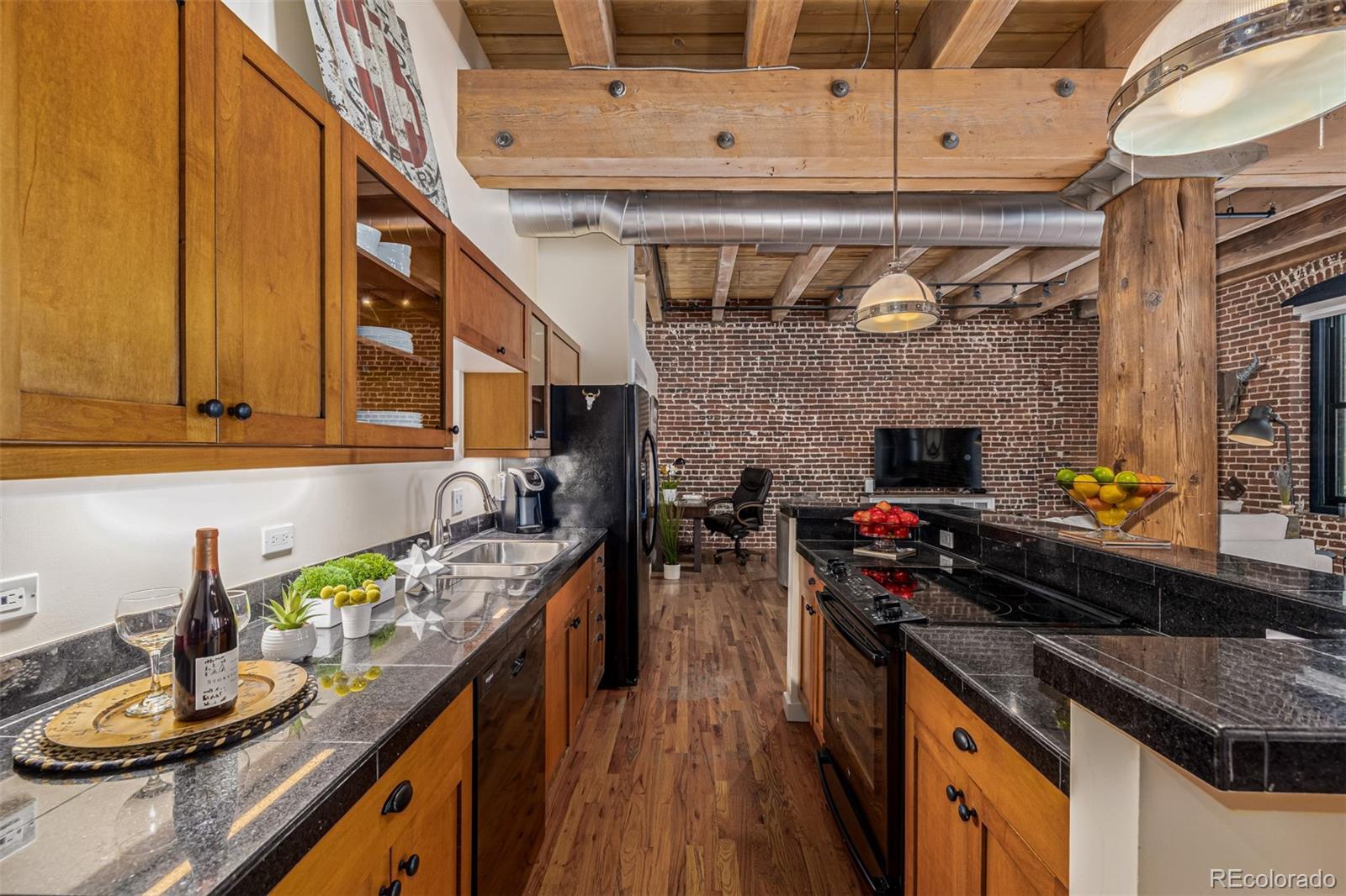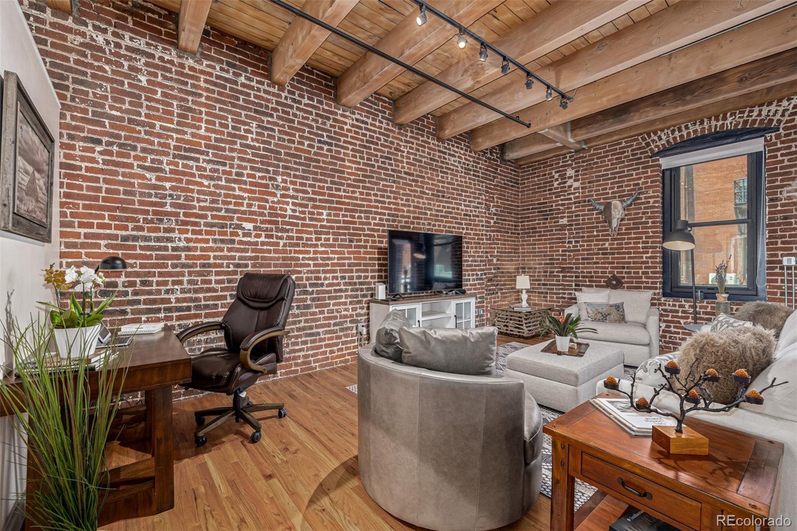 Quintessential Historic Franklin Loft with soaring ceilings and open concept. You can sense the history surrounded by Gorgeous wood beams and brick Walls. Enter a gallery style foyer with amazing wall space for large scale art. Upon entry there is a non-confirming 2nd bedroom, great for guests or a designated office space along with laundry closet and a 3/4 bathroom. Past the entry hall is the great room perfect for formal dining, open kitchen, office desk and space for daily living and entertaining. The perfectly scaled furniture is negotiable. New oversized windows with custom blinds keep out the urban hum of LODO. Enjoy grilling on your own balcony. The large primary bedroom is equipped with walk in closet and 4-piece bathroom with updated walk-in shower. 1 reserved parking space in garage and storage space. Franklin Lofts offers amazing walkability to restaurants and entertainment, 2 blocks to Coors Field and Union Station.