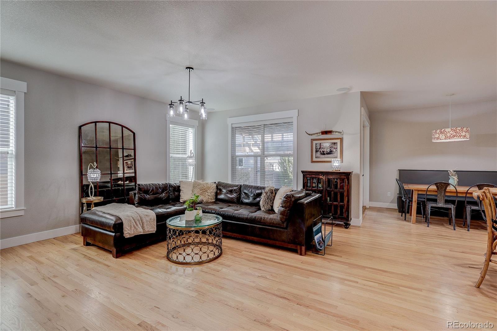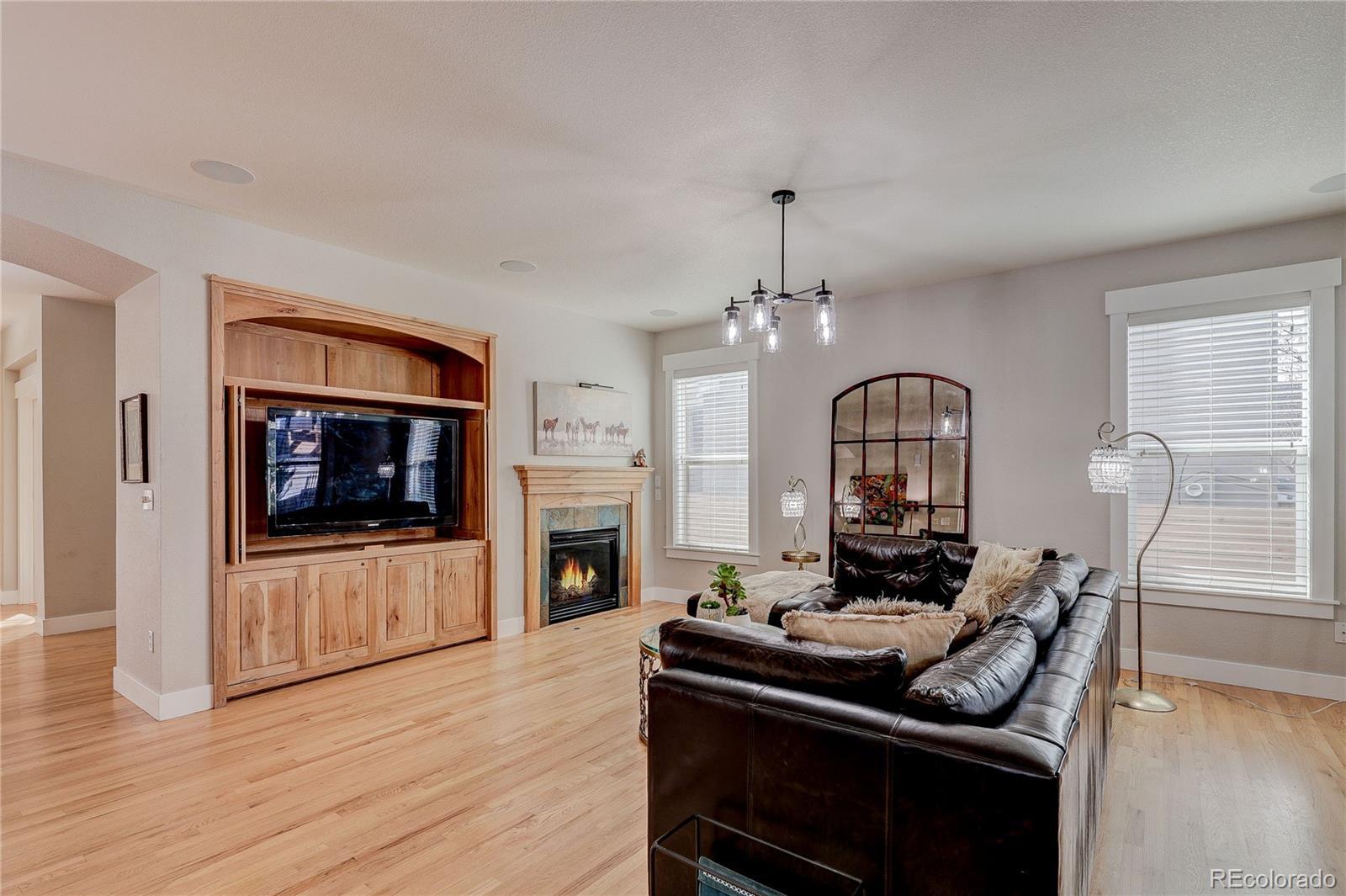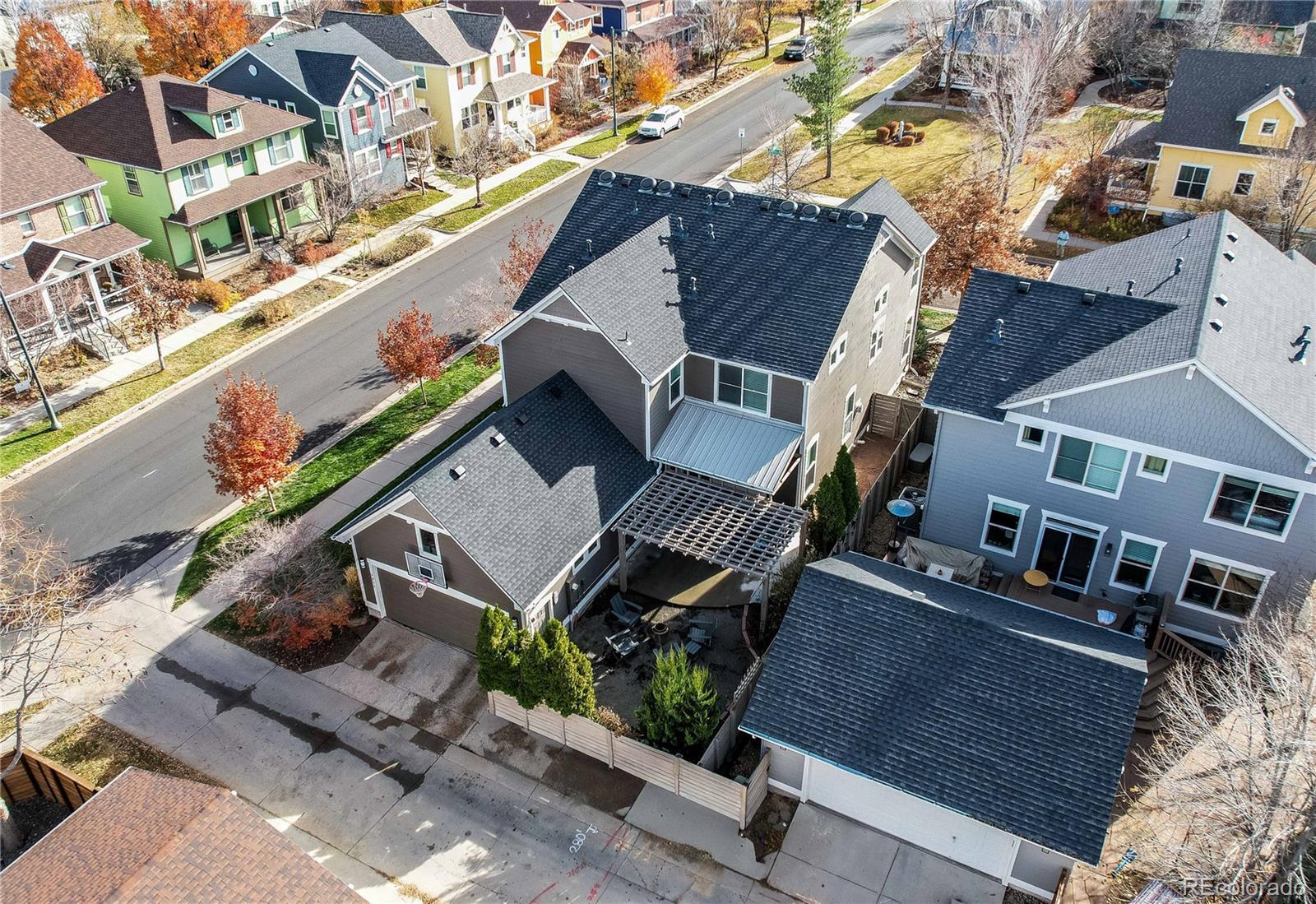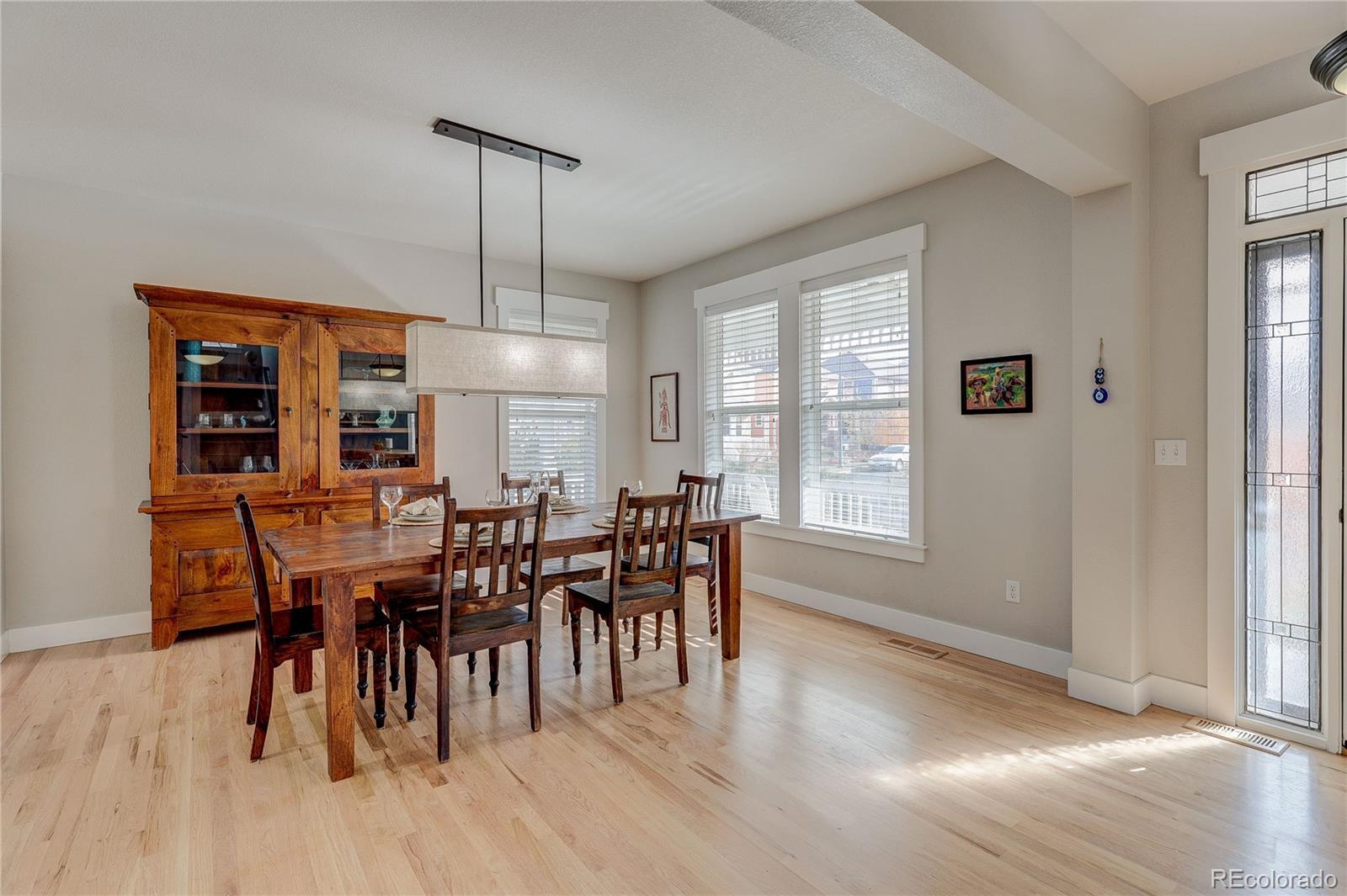 Beautifully updated 4-bed, 5-bath home in the heart of Central Park with nearly 4,000 sq ft of finished living space. Perfectly situated in desirable Eastbridge, this home sits directly across from a peaceful neighborhood park and features an expansive wrap-around front porch — ideal for relaxing or connecting with neighbors. Inside, you’ll find gorgeous hardwood floors throughout the main and upper levels and an open, inviting floor plan perfect for entertaining. The completely renovated gourmet kitchen is the true heart of the home, showcasing top-of-the-line appliances, a gas cooktop, double ovens, and a generous island that flows seamlessly into the living areas and private backyard retreat. A spacious eat-in area, elegant dining room, and main-floor office with custom built-ins complete the main level. Upstairs, the luxurious primary suite features an expansive walk-in closet with custom built-ins, a spa-like five-piece bath with soaking tub and dual vanities, and a convenient laundry room. During the major remodel and addition, a large storage area above the garage was added with easy access from the suite. Thoughtful past updates have created abundant storage throughout the home. The fully finished basement extends your living space with an exercise room, second family room, wet bar with dishwasher, game/media areas, and an additional bedroom with ¾ bath. Modern upgrades include a newer furnace, A/C, tankless water heater, roof, and EV charger. The outdoor space is a natural extension of the home — private, beautifully landscaped, and ideal for gatherings. Just a short stroll to Stanley Marketplace, Eastbridge shops and dining, F-15 Pool, Westerly Creek trails, and the Central Park Rec Center. Minutes to Anschutz Medical Campus, DIA, and downtown via the A-Line light rail. A perfect home in the perfect neighborhood — Central Park living at its finest!