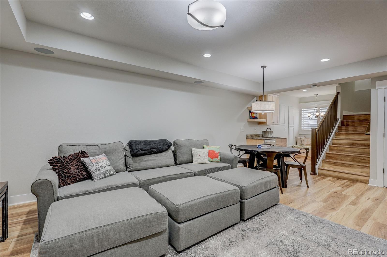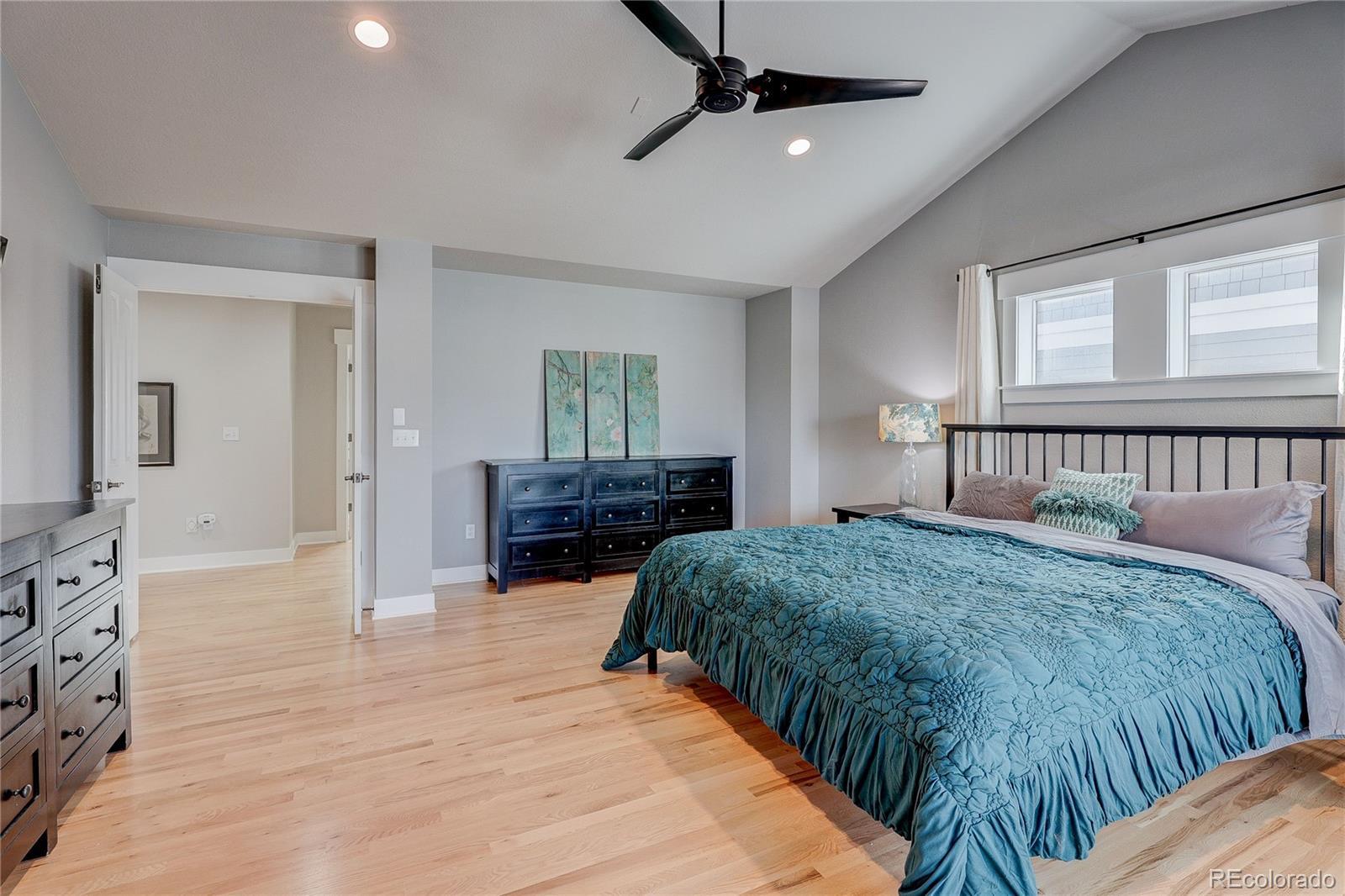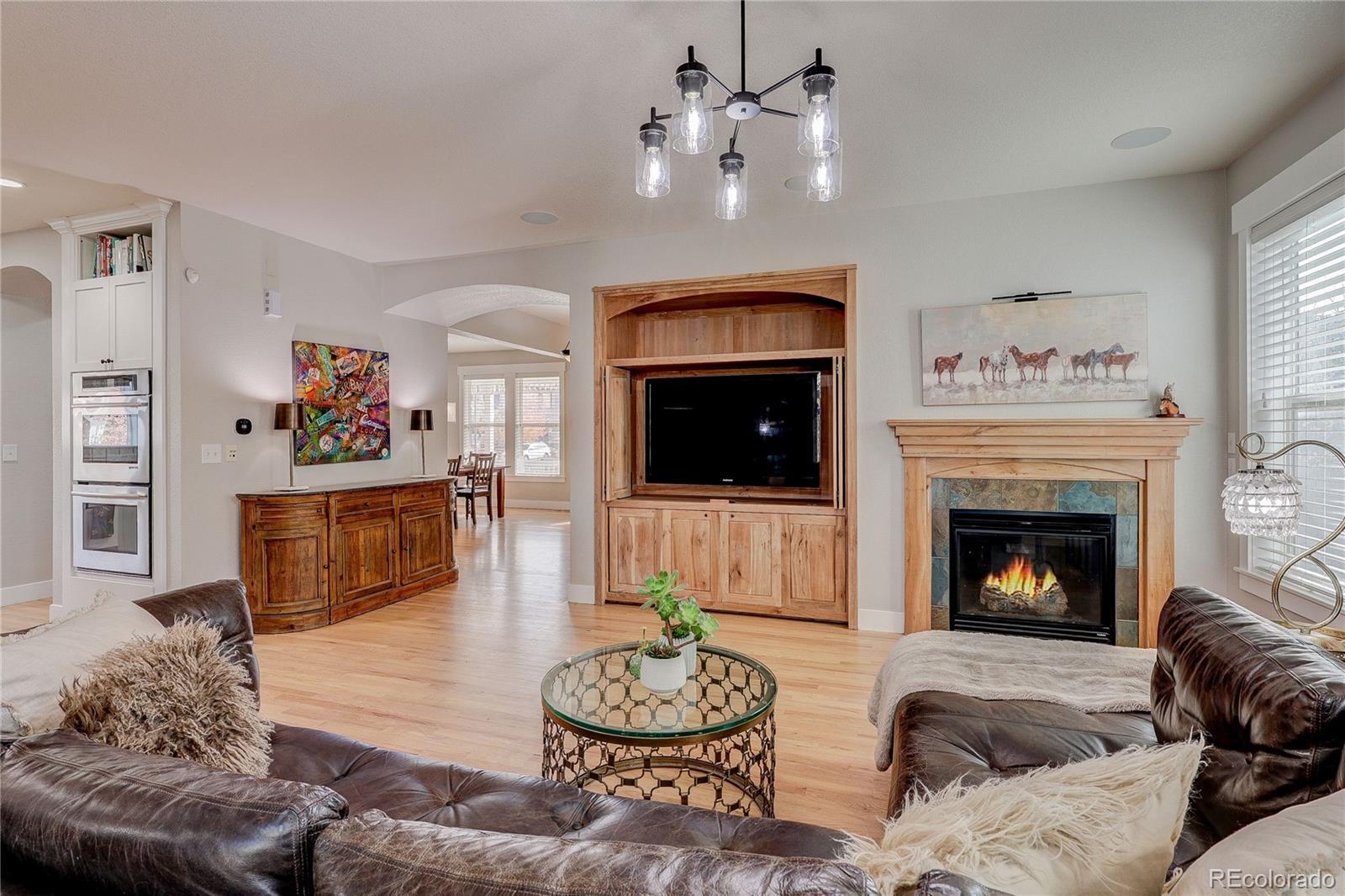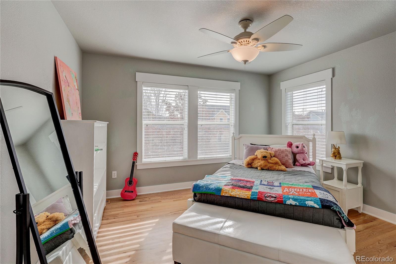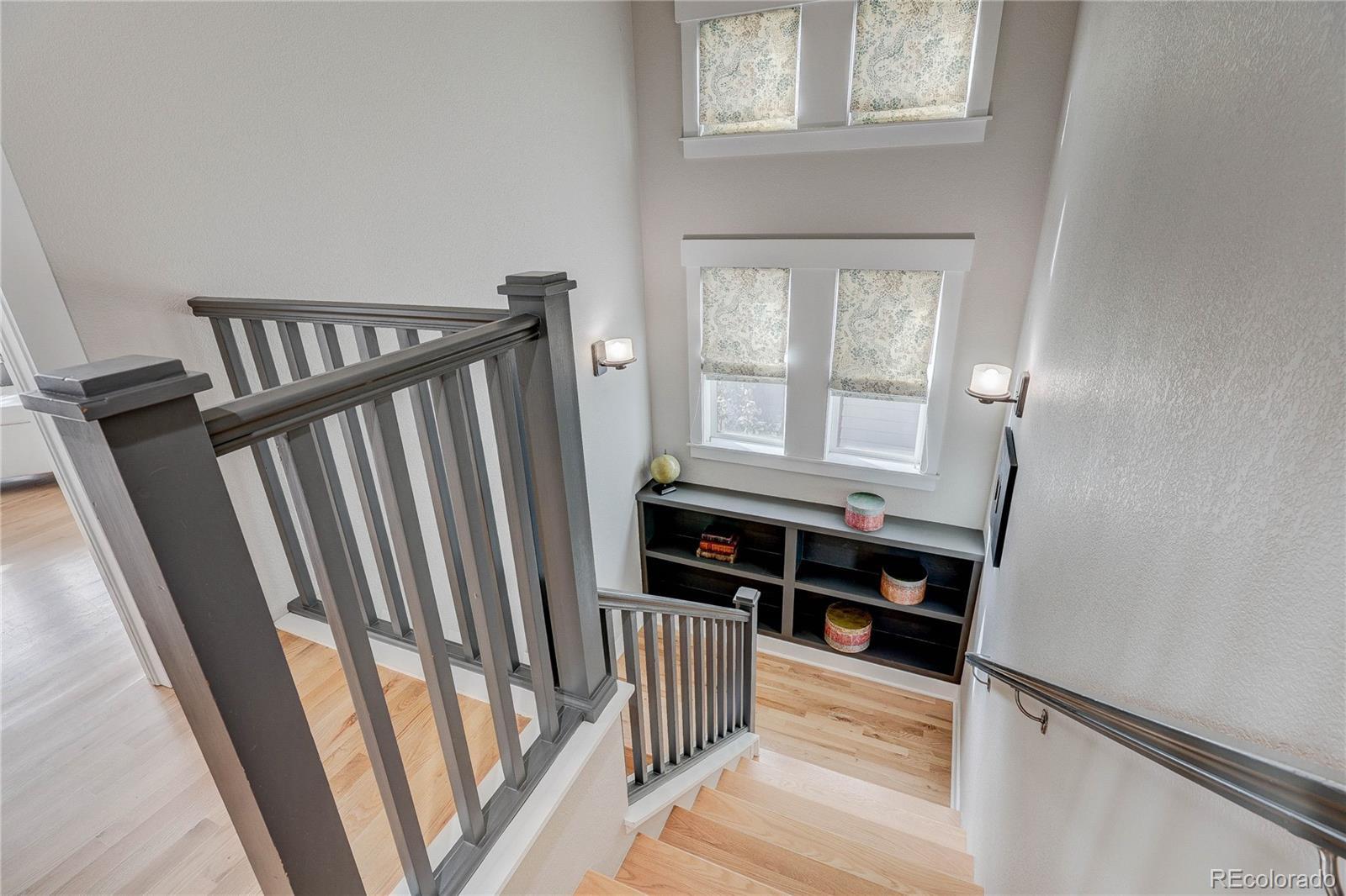 Beautifully updated 4-bed, 5-bath home in the heart of Central Park with nearly 4,000 sq ft of finished living space. Perfectly situated in desirable Eastbridge, this home sits directly across from a peaceful neighborhood park and features an expansive wrap-around front porch — ideal for relaxing or connecting with neighbors. Inside, you’ll find gorgeous hardwood floors throughout the main and upper levels and an open, inviting floor plan perfect for entertaining. The completely renovated gourmet kitchen is the true heart of the home, showcasing top-of-the-line appliances, a gas cooktop, double ovens, and a generous island that flows seamlessly into the living areas and private backyard retreat. A spacious eat-in area, elegant dining room, and main-floor office with custom built-ins complete the main level. Upstairs, the luxurious primary suite features an expansive walk-in closet with custom built-ins, a spa-like five-piece bath with soaking tub and dual vanities, and a convenient laundry room. During the major remodel and addition, a large storage area above the garage was added with easy access from the suite. Thoughtful past updates have created abundant storage throughout the home. The fully finished basement extends your living space with an exercise room, second family room, wet bar with dishwasher, game/media areas, and an additional bedroom with ¾ bath. Modern upgrades include a newer furnace, A/C, tankless water heater, roof, and EV charger. The outdoor space is a natural extension of the home — private, beautifully landscaped, and ideal for gatherings. Just a short stroll to Stanley Marketplace, Eastbridge shops and dining, F-15 Pool, Westerly Creek trails, and the Central Park Rec Center. Minutes to Anschutz Medical Campus, DIA, and downtown via the A-Line light rail. A perfect home in the perfect neighborhood — Central Park living at its finest!